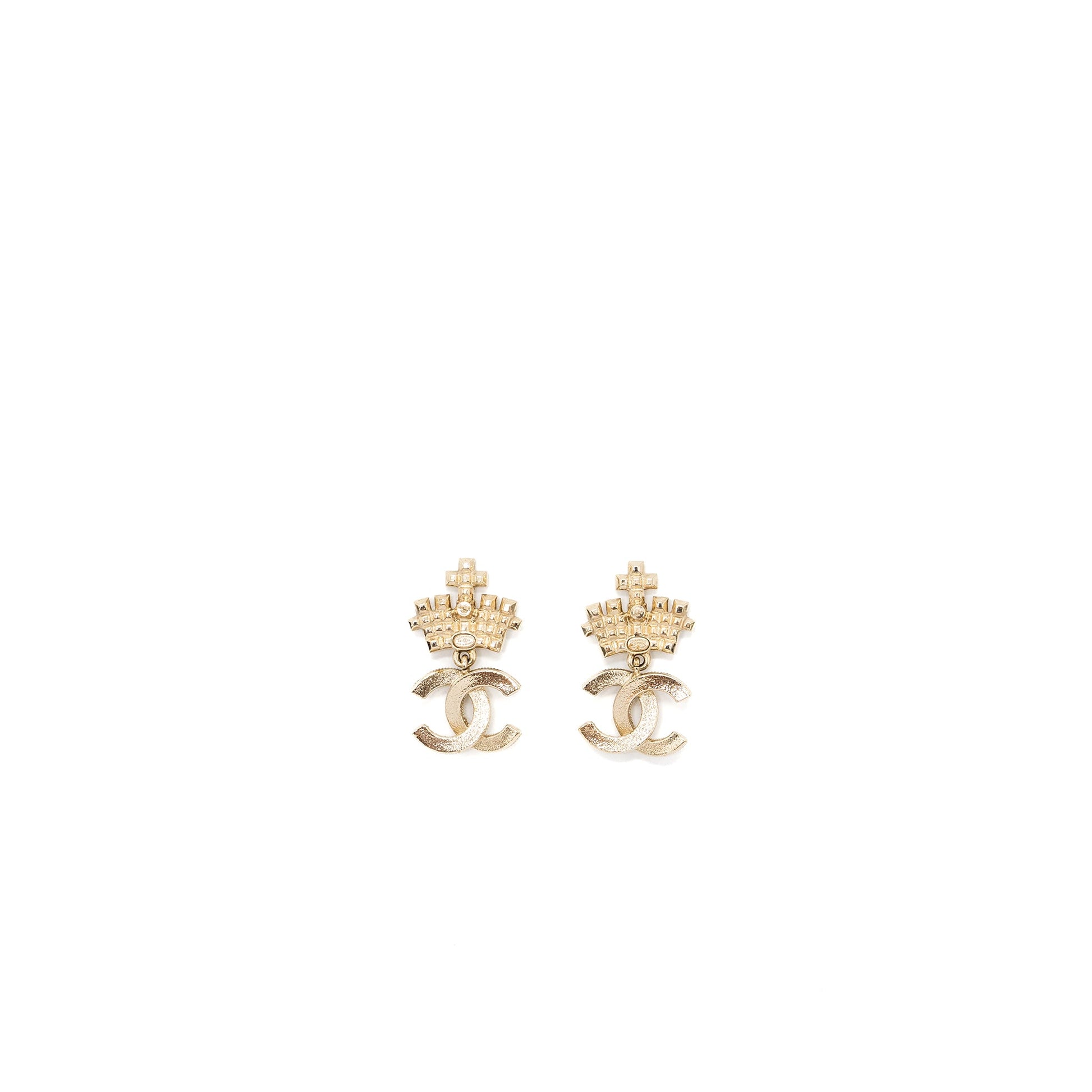 Chanel CC Logo Drop Crown Earrings Crystal/Pearl Light Gold Tone