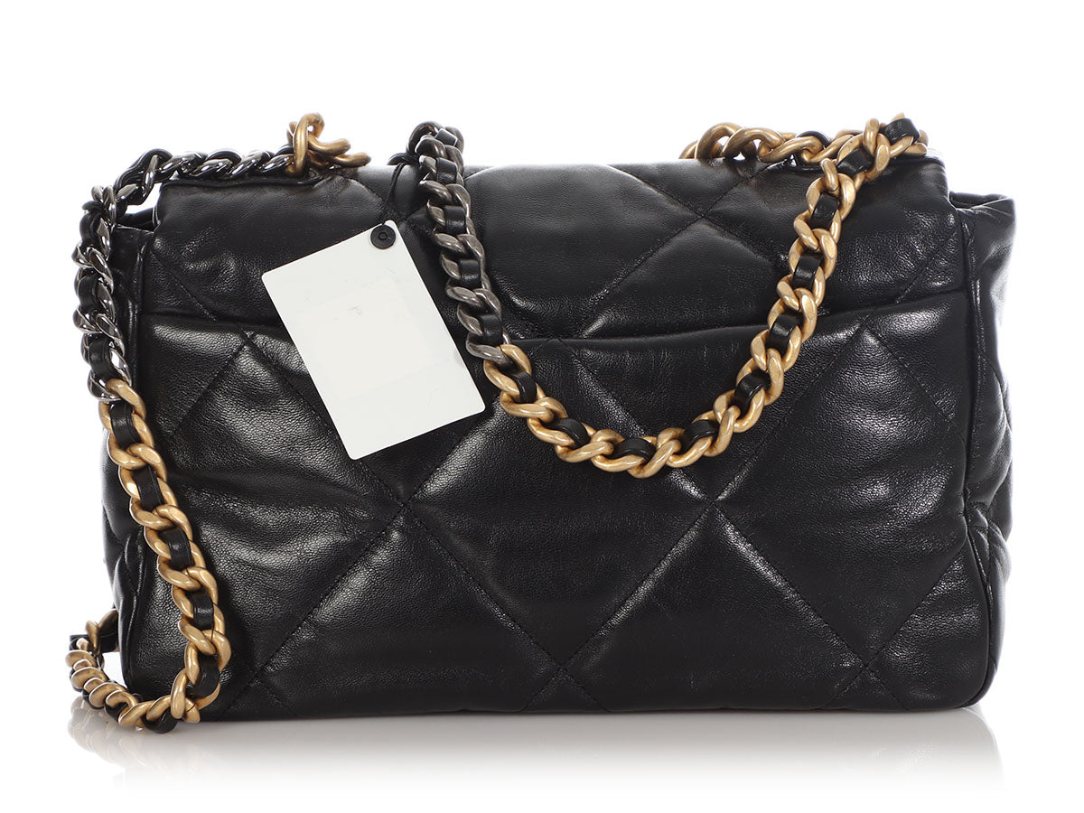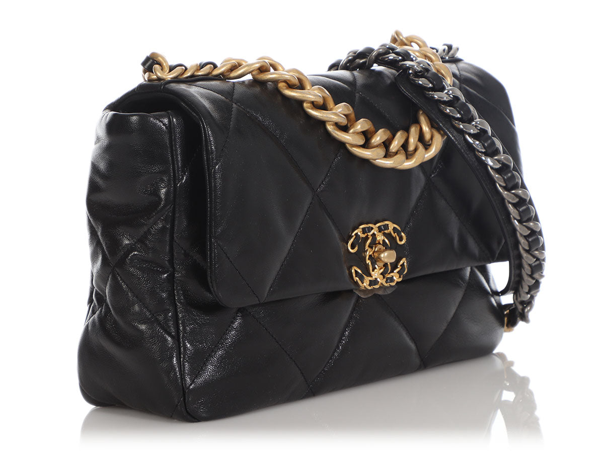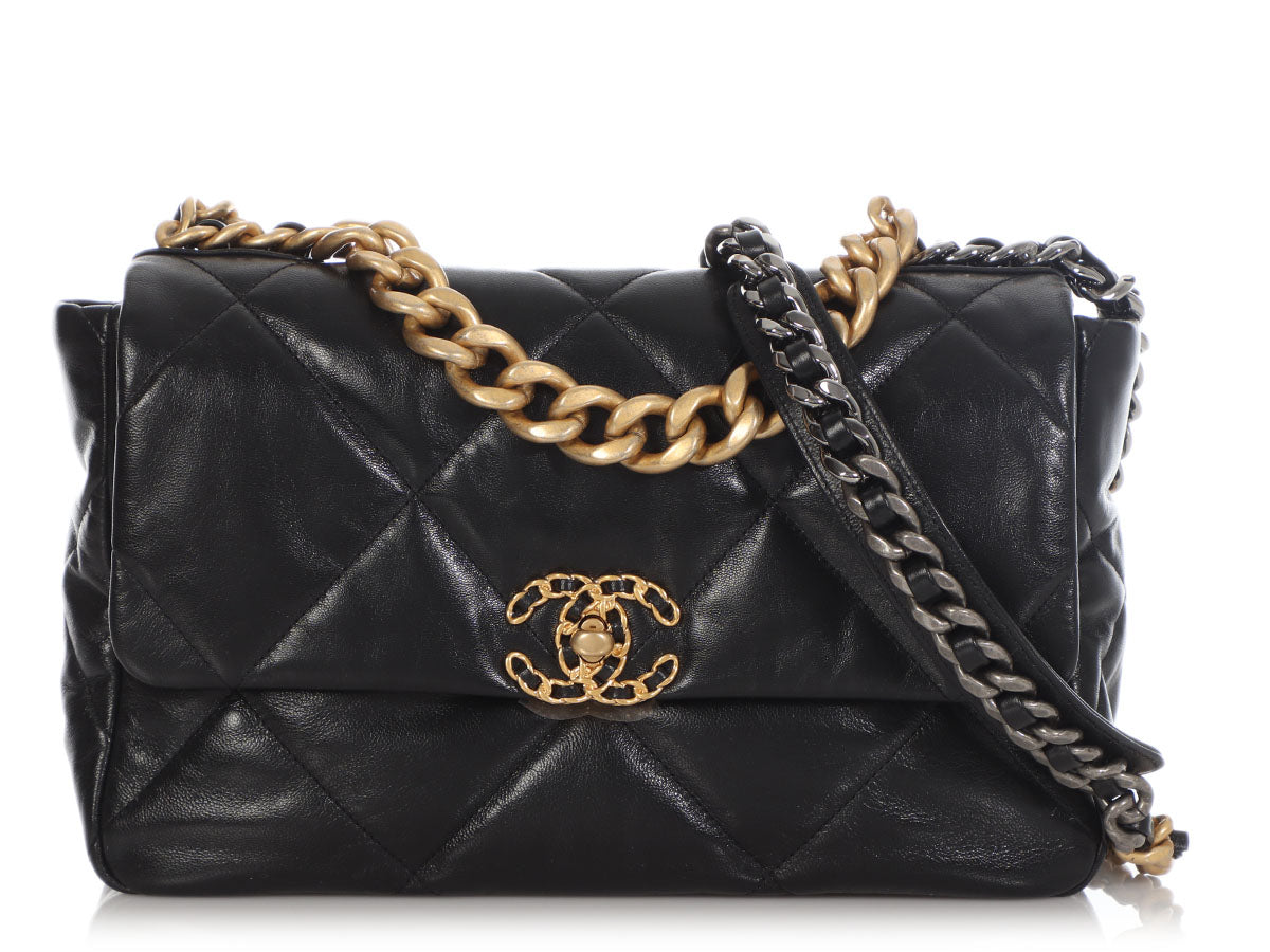 Chanel’s Large Black Quilted Goatskin 19 Flap has unique written all over it! Also known as the Chanel 19K, the style is from Karl Lagerfeld’s last collection before his death in 2019. It’s made with puffy giant-diamond-quilted goatskin and three-tone chunky curb chains—antiqued gold with a 4-inch drop for the hand or arm, and an antiqued gold-and-leather crossbody strap with an 18-inch drop leading to a ruthenium chain superimposed on a leather shoulder pad section. The flap’s logo turnlock is made of antiqued gold woven with leather and opens to red-fabric lining with one zipped pocket inside, while the back face has a magnetic slide pocket. New and never worn from 2020, it comes with a dustbag, box, and card. If you ask me, this is a style to keep your collector’s eye on!