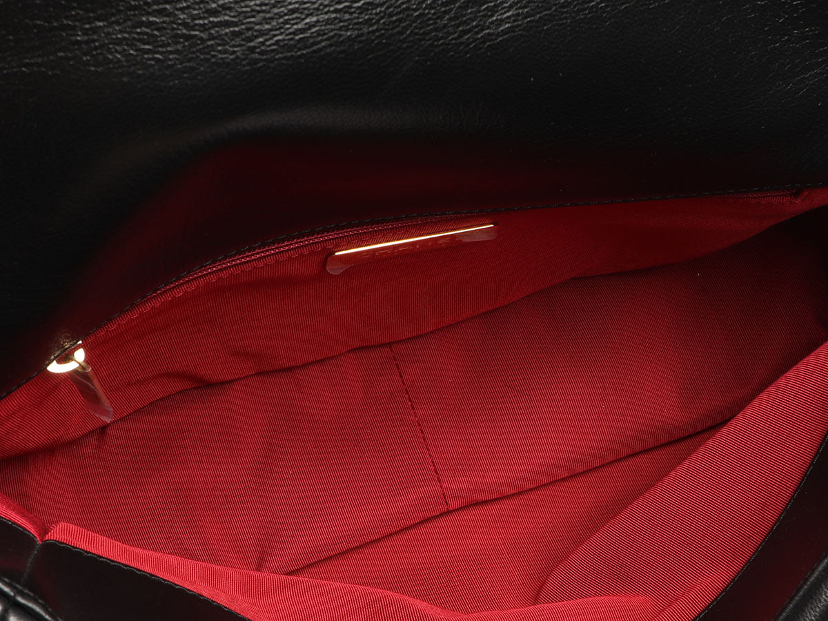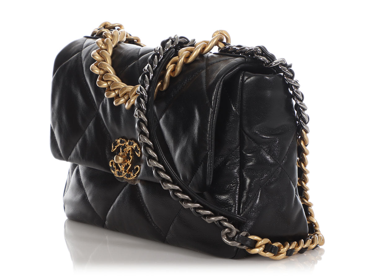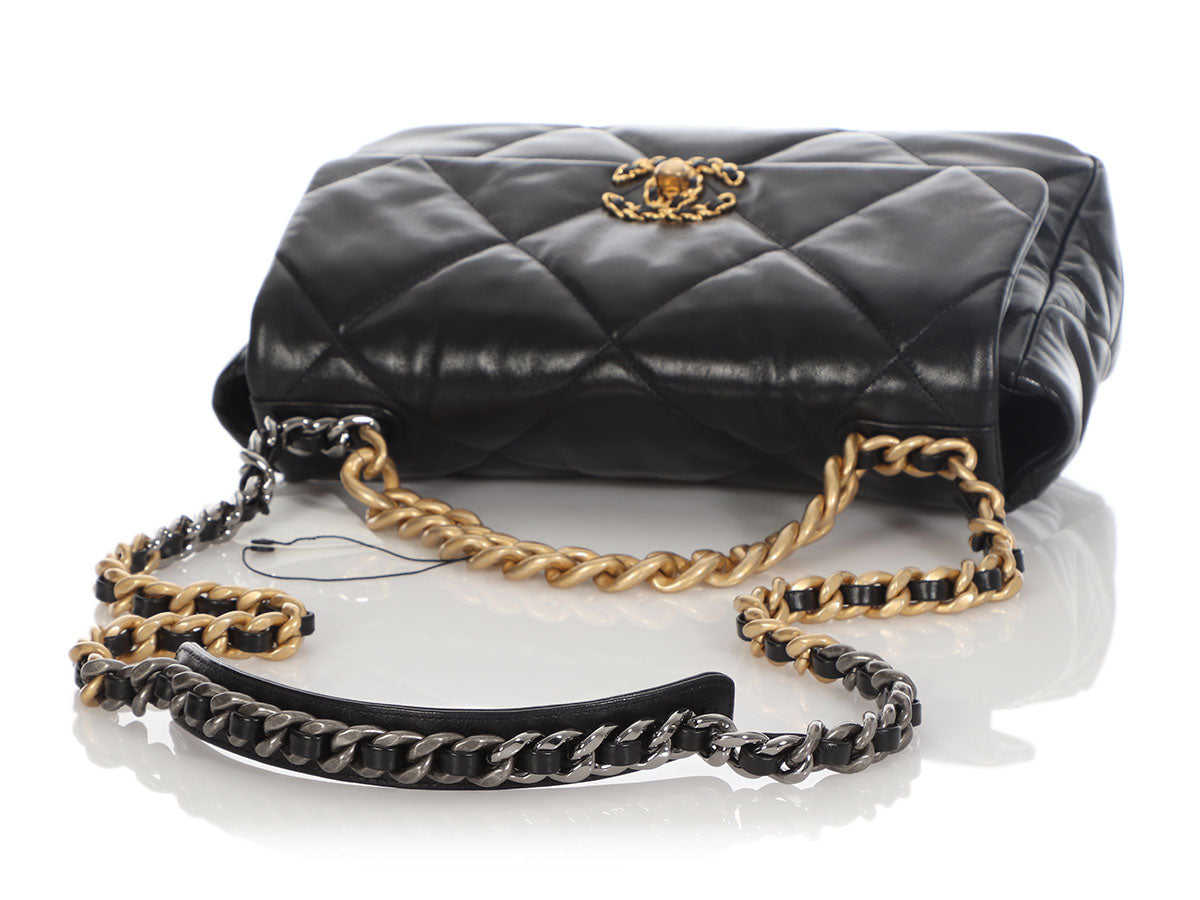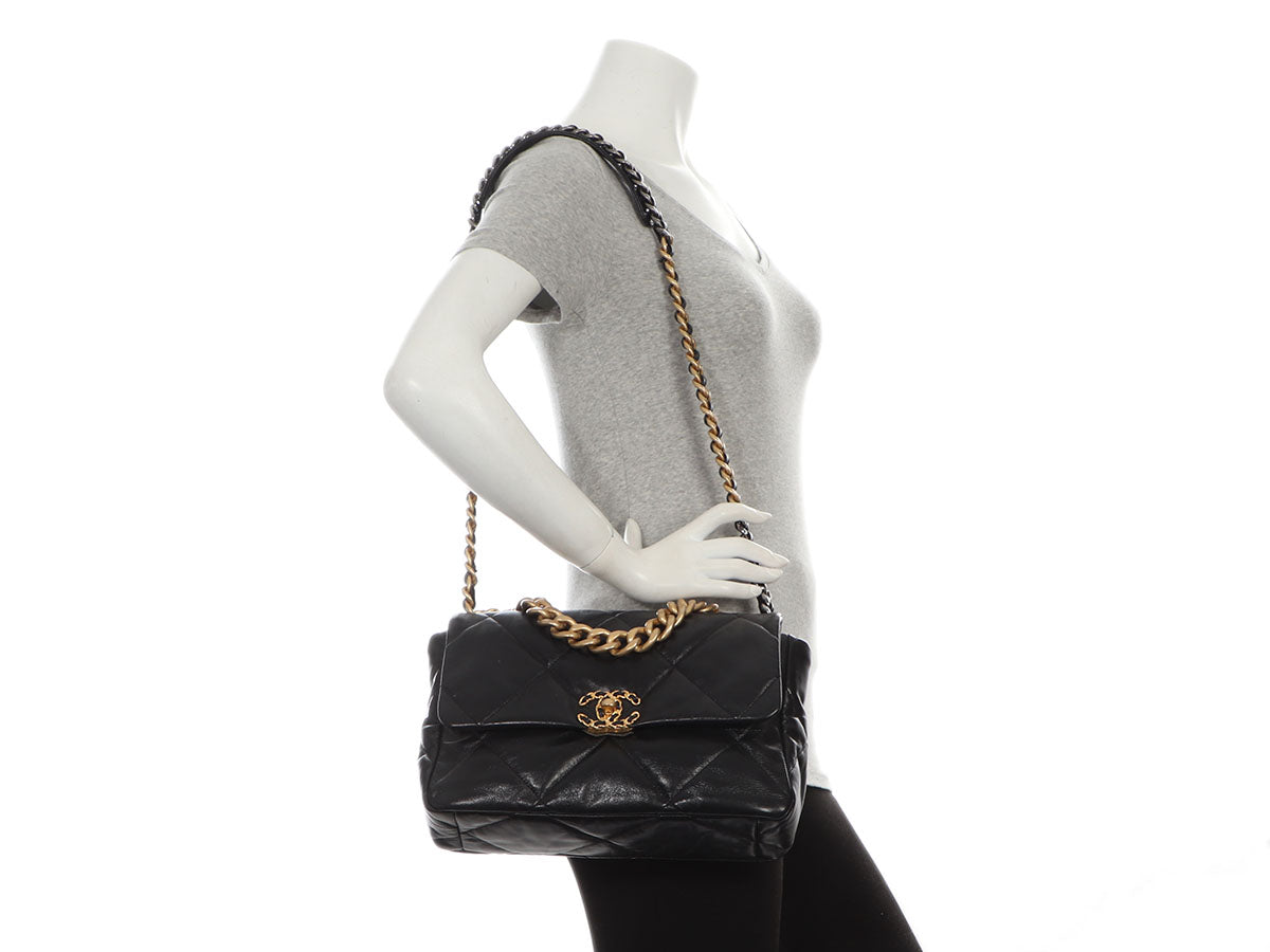 Chanel’s Large Black Quilted Goatskin 19 Flap has unique written all over it! Also known as the Chanel 19K, the style is from Karl Lagerfeld’s last collection before his death in 2019. It’s made with puffy giant-diamond-quilted goatskin and three-tone chunky curb chains—antiqued gold with a 4-inch drop for the hand or arm, and an antiqued gold-and-leather crossbody strap with an 18-inch drop leading to a ruthenium chain superimposed on a leather shoulder pad section. The flap’s logo turnlock is made of antiqued gold woven with leather and opens to red-fabric lining with one zipped pocket inside, while the back face has a magnetic slide pocket. New and never worn from 2020, it comes with a dustbag, box, and card. If you ask me, this is a style to keep your collector’s eye on!