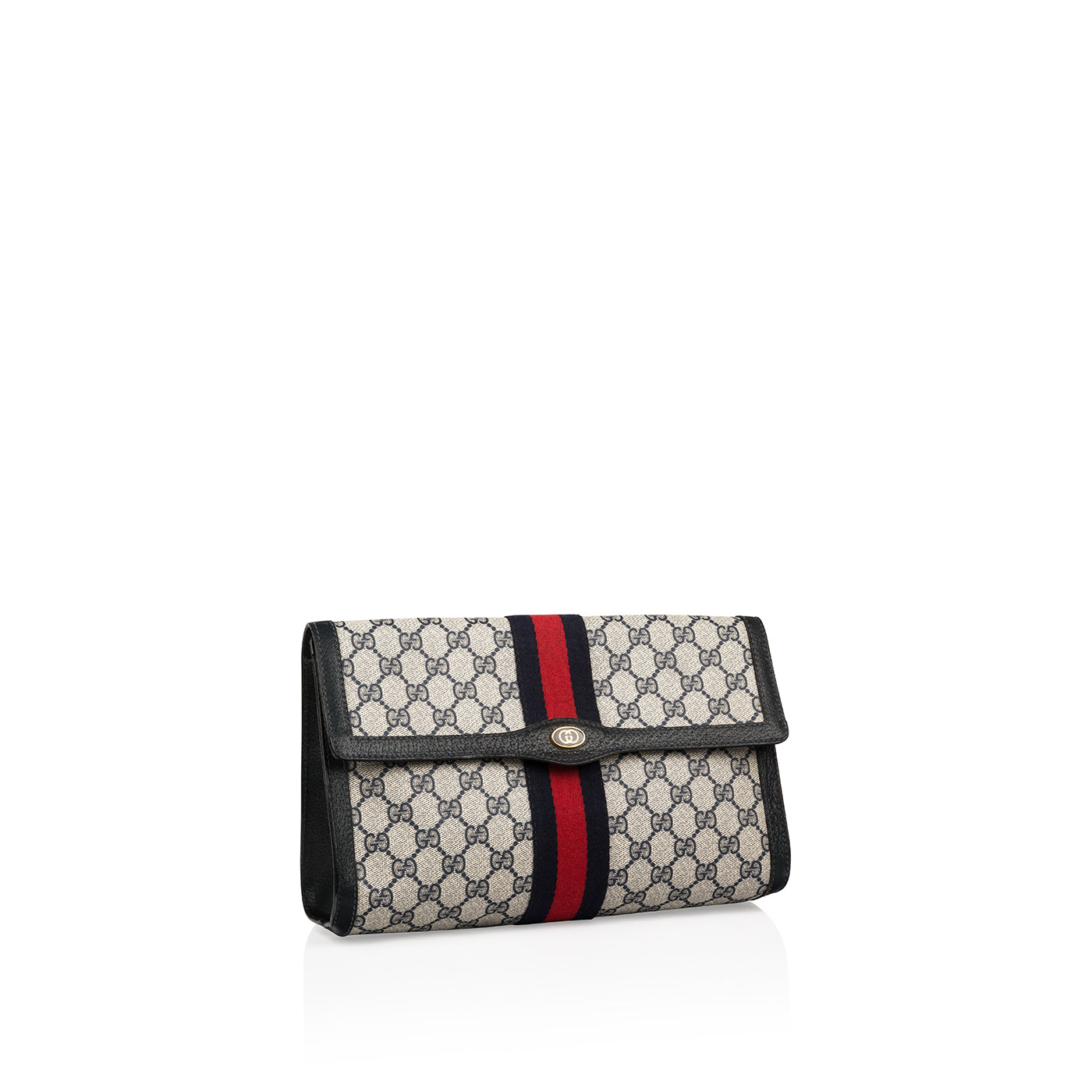 Go vintage with this adventurous Gucci Linea clutch. This gorgeous vintage clutch incorporates everything that we adore about Gucci; the monogram print, gold hardware and the vivid red we�ve come to associate so frequently with Gucci. With its bold, dark blue leather interior and incorporation of a large storage space, there�s no reason to worry about where to store your nose powder and compact mirror. Just throw it all in! Which makes it ideal for those lazy Sunday brunches by the river.