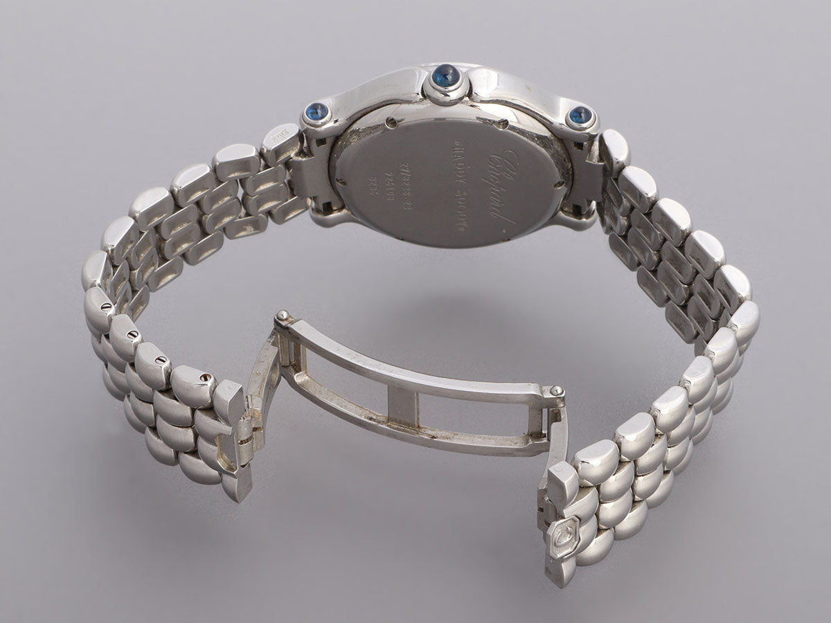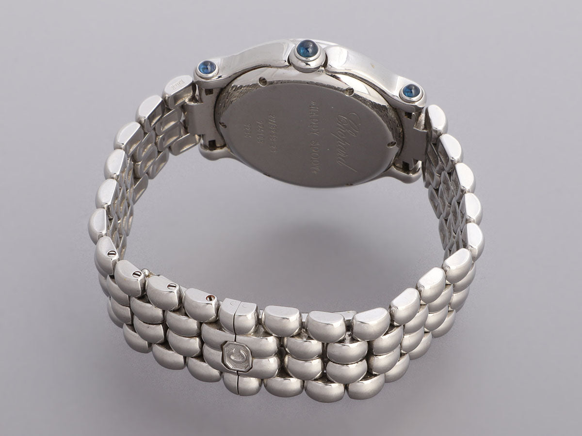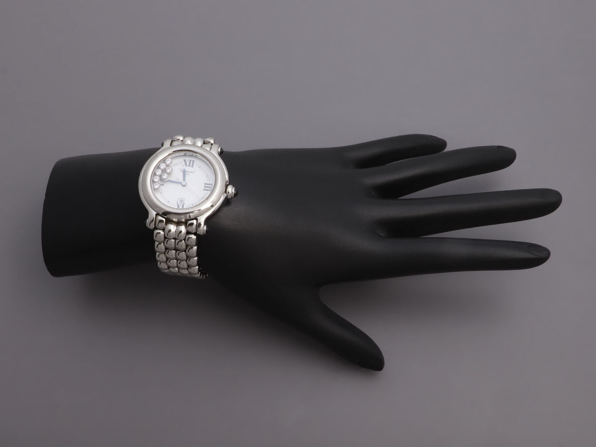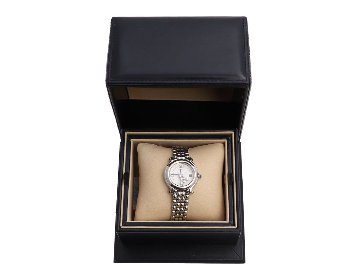 Don’t worry, be happy with Chopard Stainless Steel Happy Diamonds Sport Watch 31mm on your wrist! The round case has a white dial with black Roman numeral hour markers, a date window at the 6 o’clock position, seven bezel-set floating diamonds with a CTW of 0.35, and five sapphire cabochon details. This Swiss-made quartz watch has a bracelet with a deployment clasp. In very good condition with a box, certificate, and booklet, it has marks on the metal. Day or evening, this Chopard makes the scene!