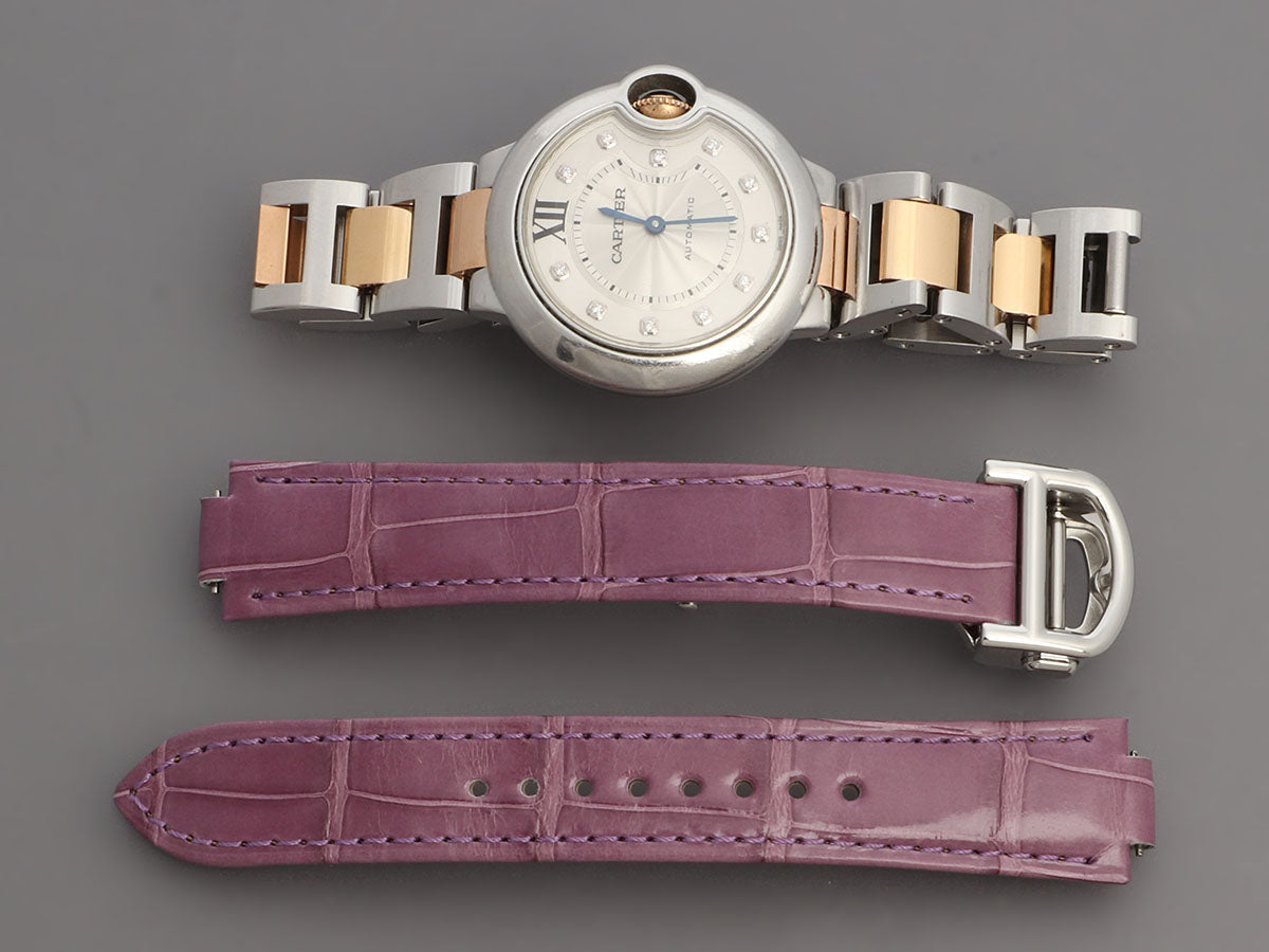 Cartier’s Two-Tone Diamond Markers Ballon Bleu Watch 33mm is a Swiss-made automatic! It has a round stainless steel case with silver guilloché dial set with 11 brilliant-cut diamond hour markers totaling 0.05 carats and blue-steel sword-shaped hands, a Roman numeral at the 12 o’clock position, and a winding crown in 18K rose gold. The deployment bracelet combines stainless with rose gold and can be interchanged with the included new purple alligator strap. In good condition, it comes with a box, booklet, and certificate, and has marks on the metal. Cartier describes the Ballon Bleu as defying gravity with its ethereal charm and I’d say that’s pretty spot on!