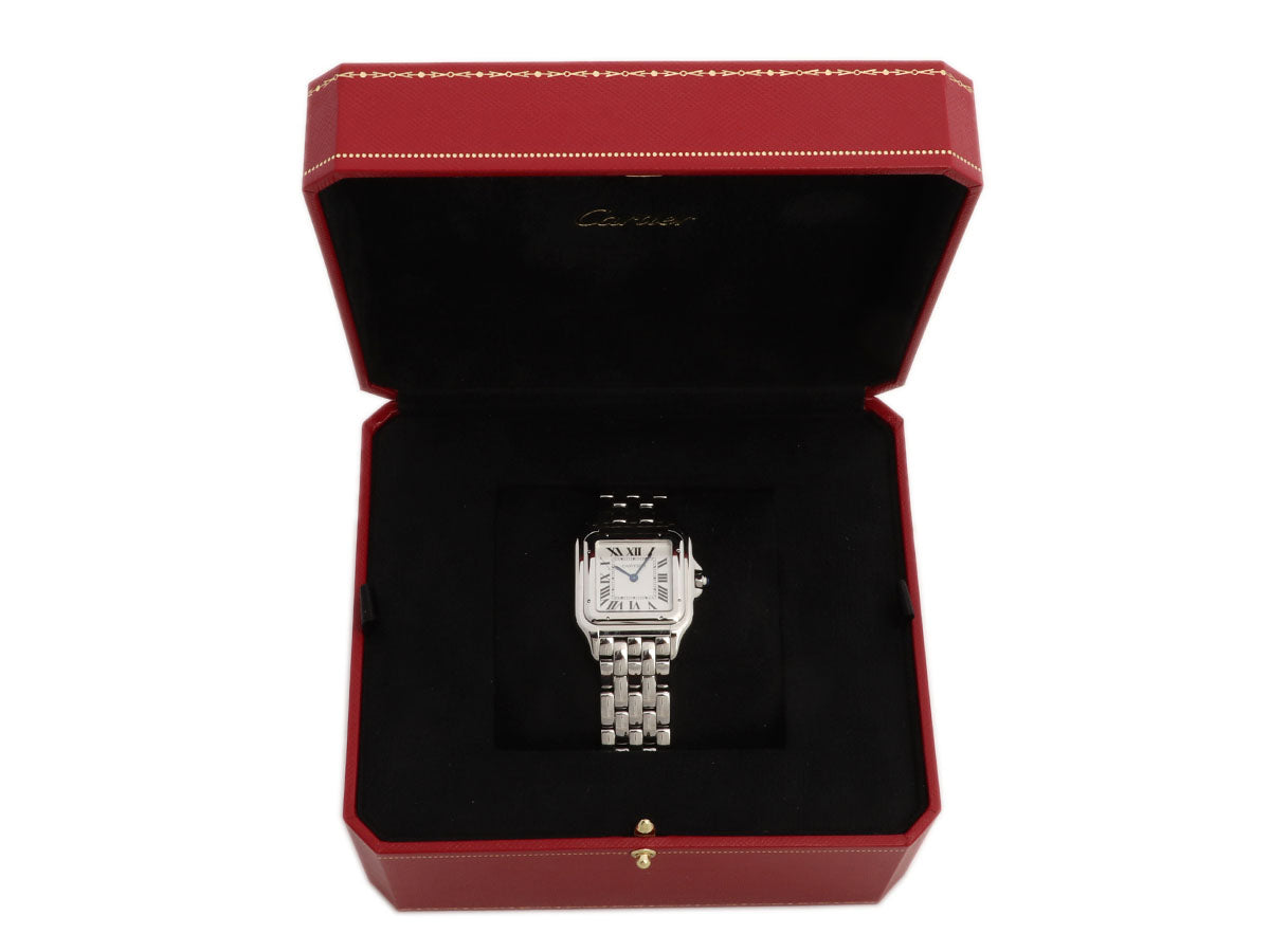 Cartier’s Large Stainless Steel Panthère De Cartier Watch 31mm was made for a man but can be worn by a woman! This stainless-steel unisex watch has a white face and Roman numeral hour markers. New and never worn, it was purchased in 2024 and comes with a box and certificate. This large Swiss-made quartz watch is a classic from the house of Cartier with a deployment clasp and an additional link!