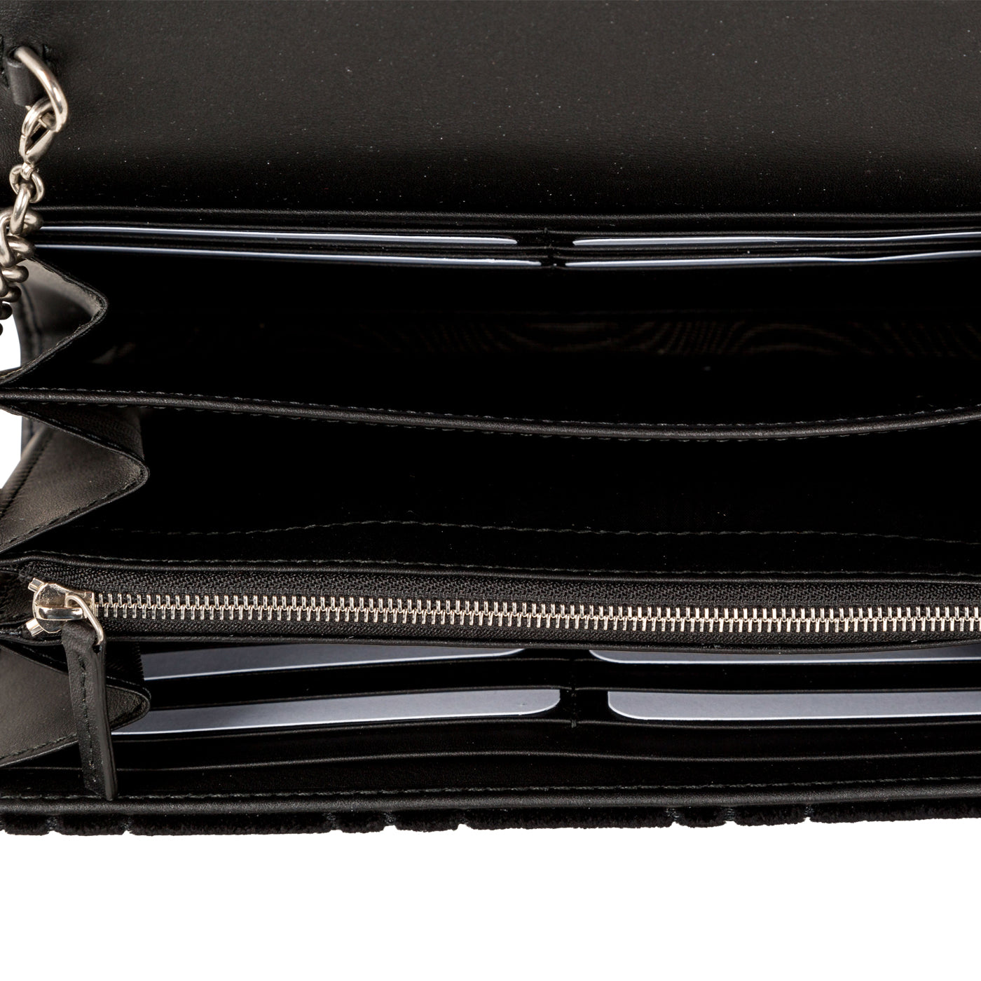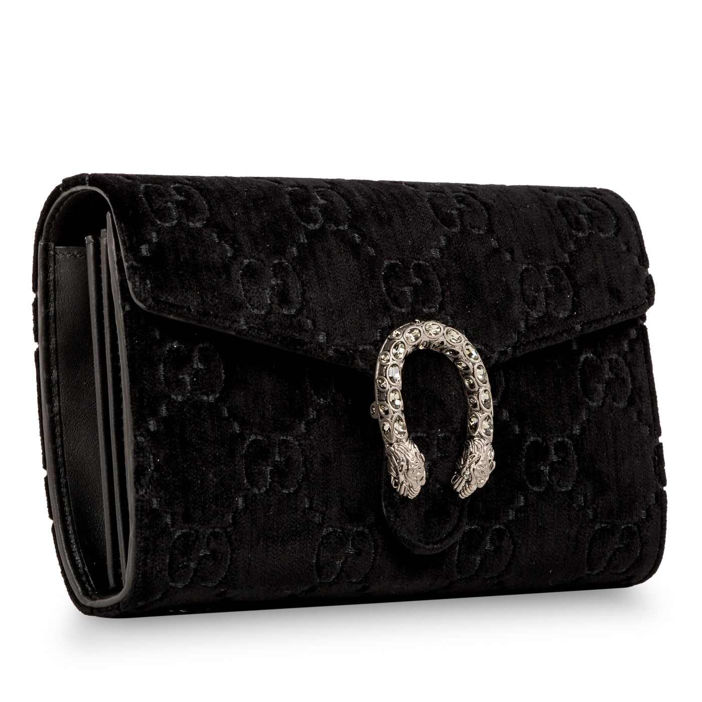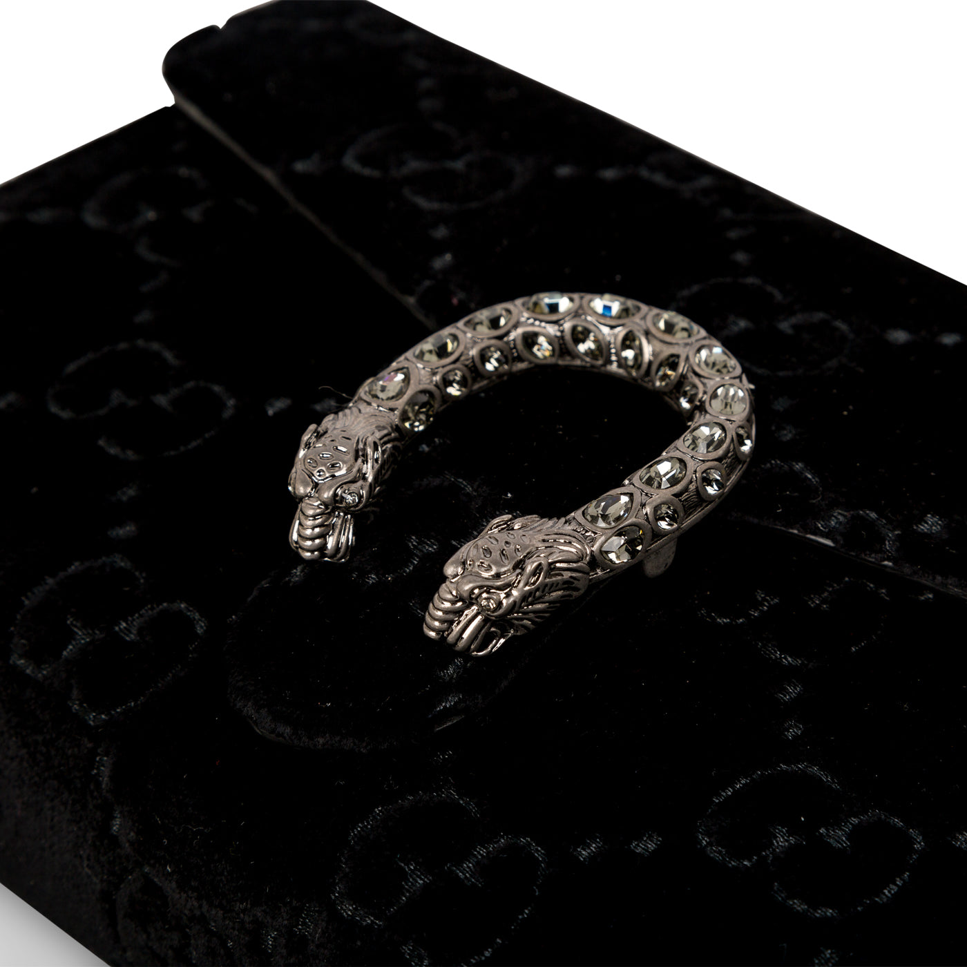 The very popular Gucci signature GG motif has been reworked in beautiful black velvet for the Dionysus WOC. Made in Italy the Dionysus shoulder bag is suspended from a sliding chain that can be worn multiple ways. The tiger head is enriched with crystals remains an eye catching feature on this defining silhouette. The Dionysus is the perfect statement handbag to be added to any collection.