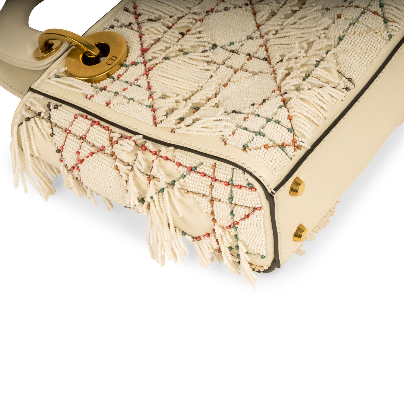 Dior’s most iconic accessory goes in a modern direction with the stunning Beaded Tassel Lady Dior bag. Usually depicted in either lambskin or patent cannage leather, Dior’s unique seasonal Lady Diors never fail to amaze us – and this one is no exception. Crafted in smooth, cream leather and featuring white beaded tassel details, this remarkable little bag is nothing short of exceptional. Accentuated by antique gold-tone hardware, Dior’s modern logo charms and delicate tiny multicolored beads imitating the classic cannage motif, it’s hard not to obsess over this piece. Small and compact but spacious enough to hold your little essentials comfortably inside, this Lady Dior bag is the perfect statement piece to spice up any neutral or monochrome outfit. Ideal for summer, we love to image this bag paired with a loose linen dress and a pair of heels, or casual denim shorts with a light blouse. Regardless of the time, place, occasion or event, this gorgeous beaded baby is a sure head-turner wherever you go. A timeless accessory with a contemporary edge, this Lady Dior is an absolute must-have for any woman with a love for luxury and a soft spot for all-things Dior.
