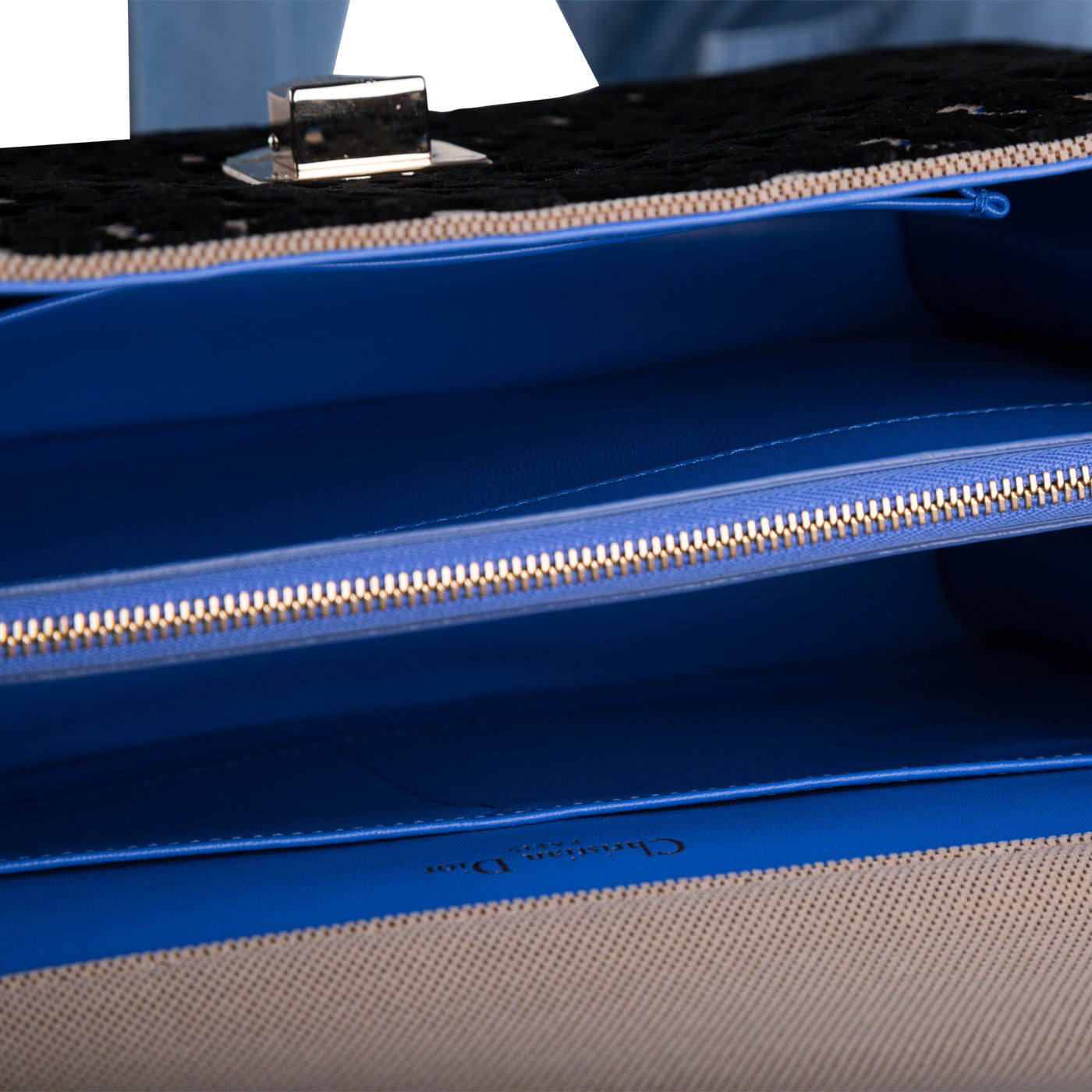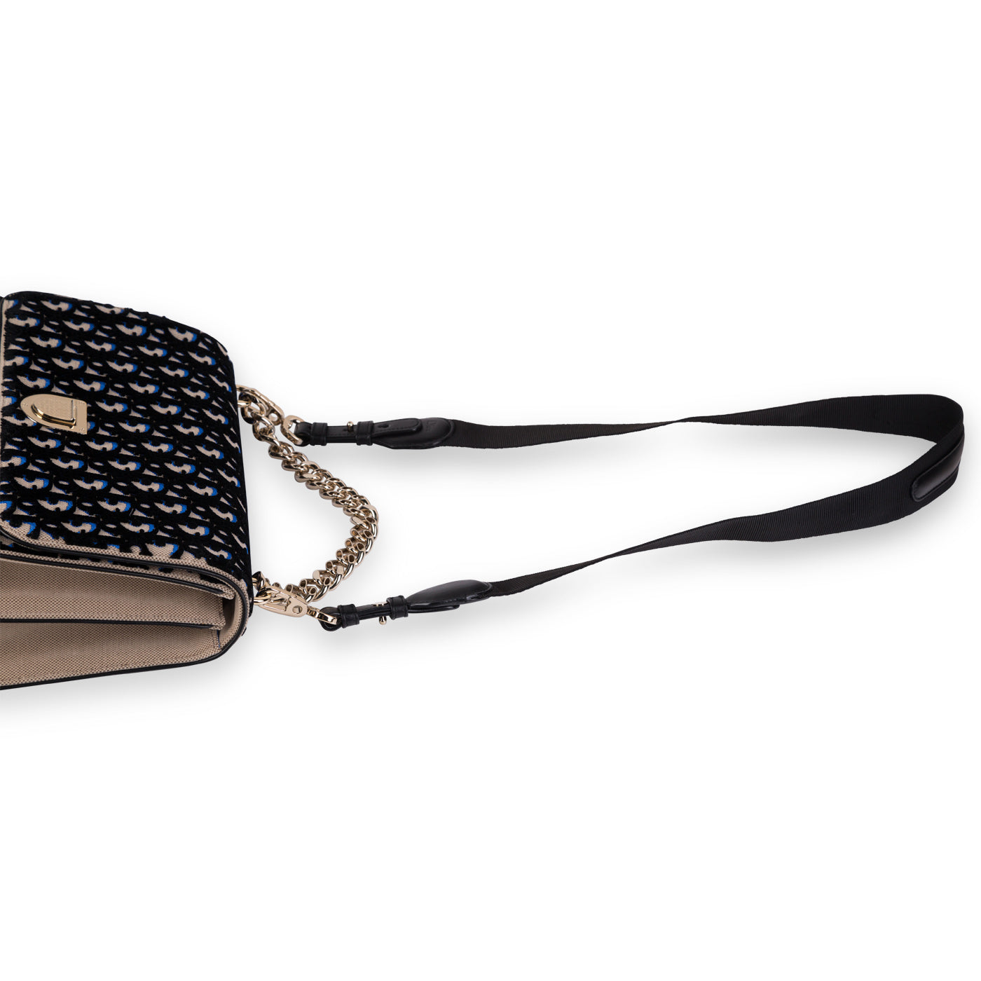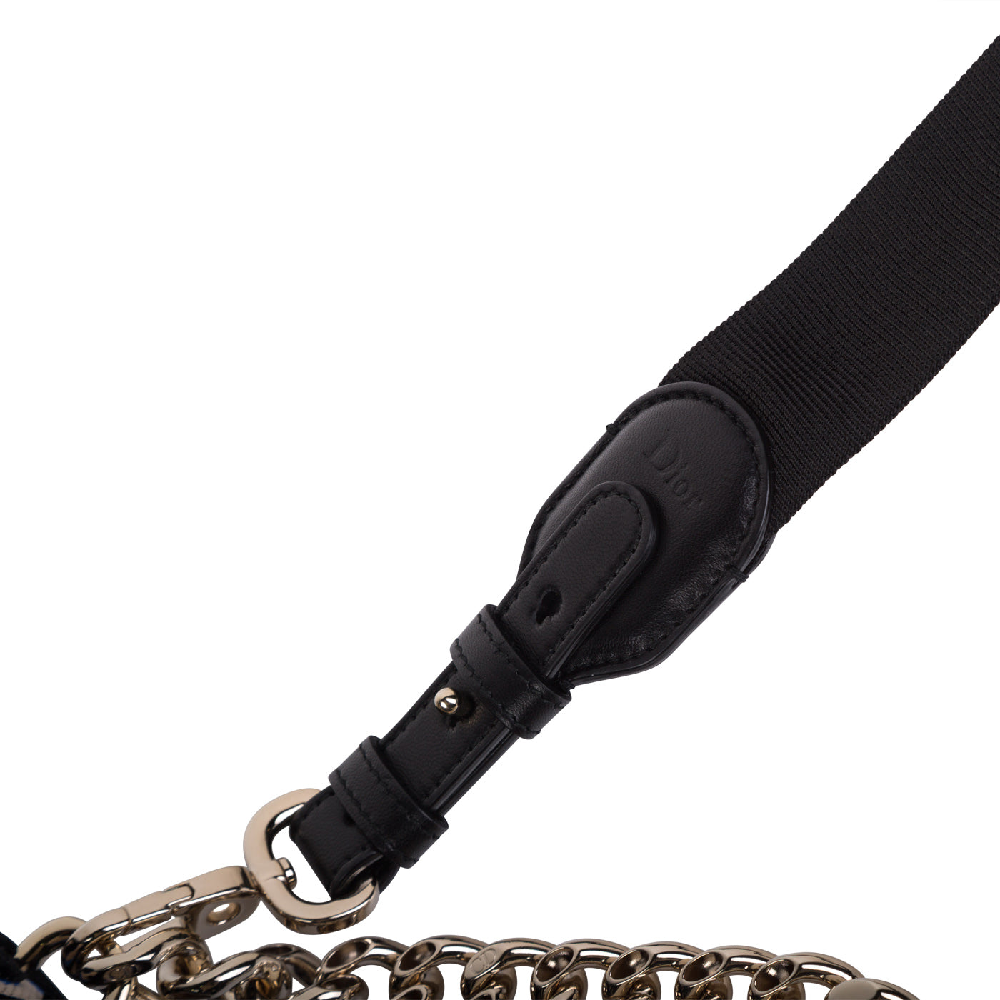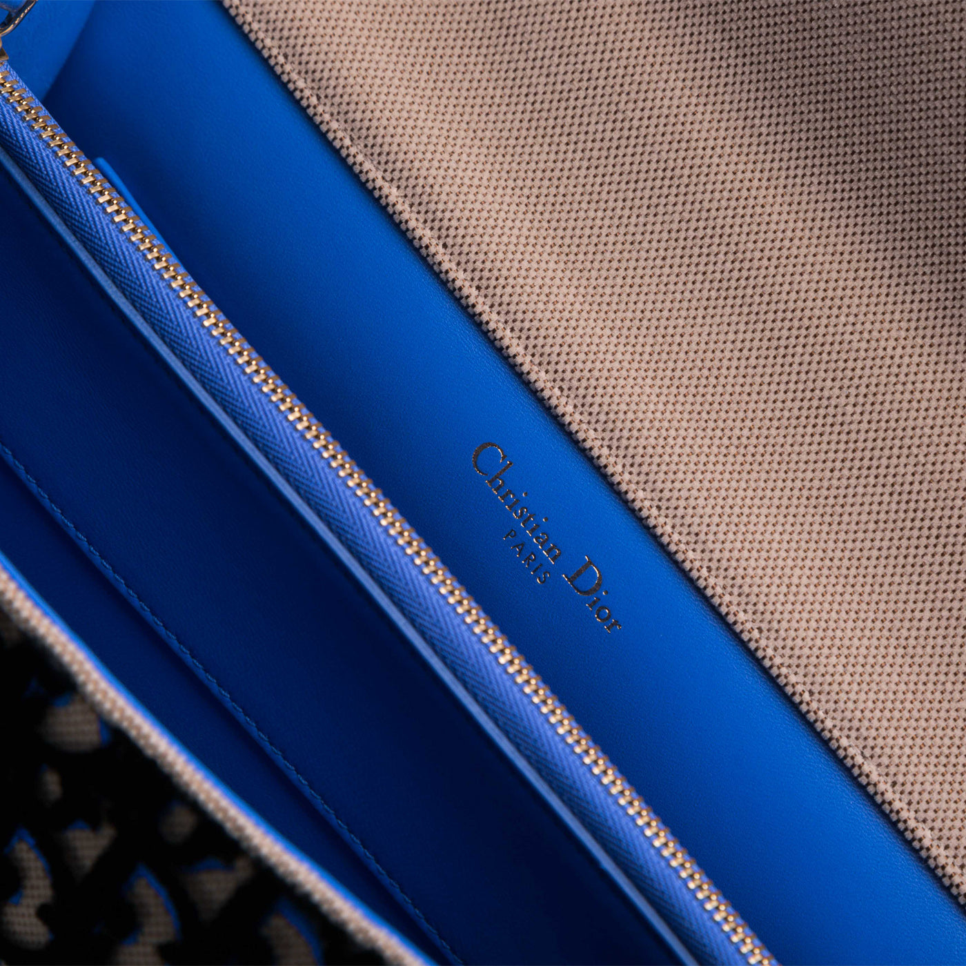 This Diorama bag is from the Fall/Winter 2016 collection and is a unique and stunning piece. The exterior is canvas and covered in a velvet monogram. The striking blue stitching stands out behind the black velvet and is perfectly complimented by the gold chain strap and gold closure. This bag is glamorous and perfect to wear for a formal evening or dinner with friends.