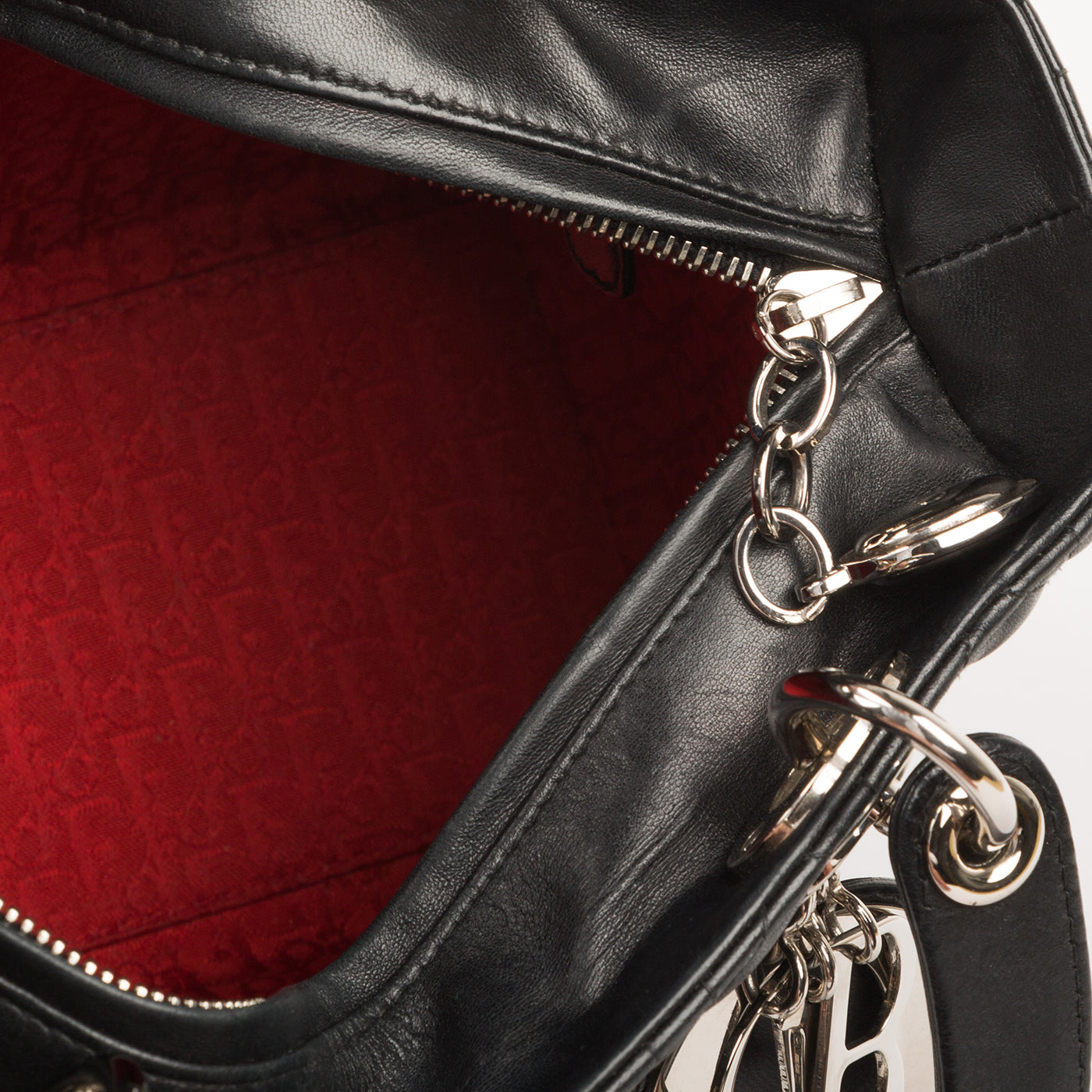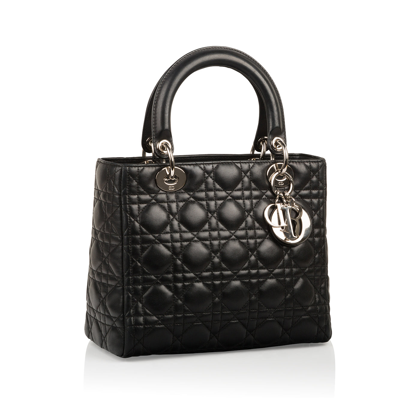 Dior presents one of its most reputable handbags and possibly one of the most sought-after handbags in the world, the Lady Dior in black calfskin. Its magnificent carnage stitching is said to be inspired by the Napoleon III rattan.The bag’s tone to tone stitching serves to reinforce the bag’s sophisticated tone, alongside its removable chain. The D.I.O.R charm letters, with their distinctive larger O, which hang from the handle are galvanised to maintain the bag’s femininity. The handbag also comes accompanied with a black and white twilly, which only serves to intensify the bag’s chic tone.
