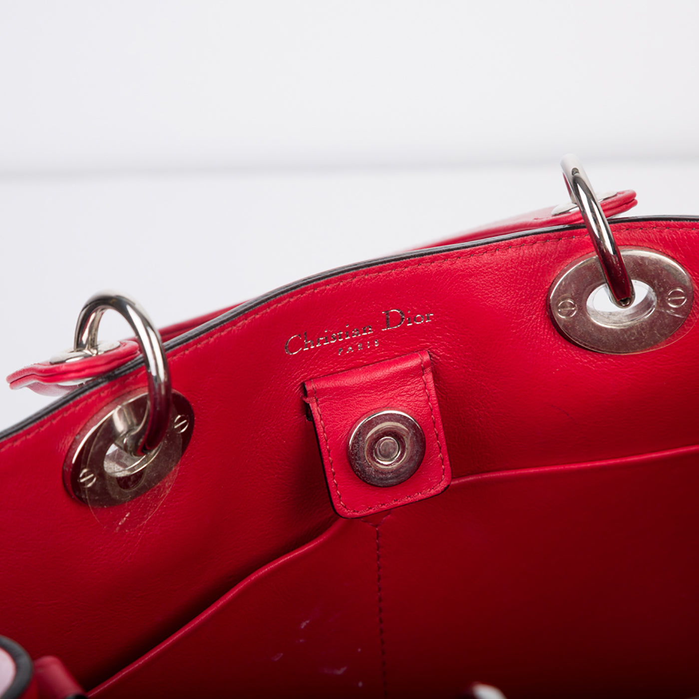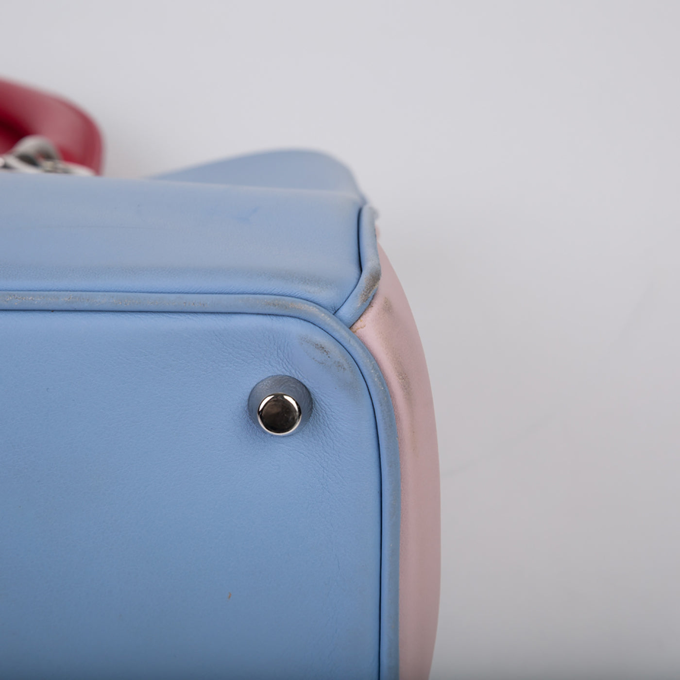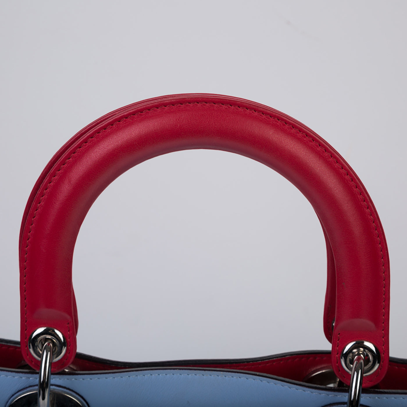 Dior presents their stunning tricolour Diorissimo in a striking colour palette of pale blue, red, and baby pink. Carefully crafted from smooth leather featuring the delicate, silver tone Dior charm, this bag is the ideal accessory for any woman who wants to put some colour in her wardrobe! Hold all your every day essentials inside the spacious interior while carrying the Diorissimo over your arm, or clip the additional shoulder strap on and throw this bag over your shoulder for handsfree usage. The perfect every day bag and compliment to any neutral-toned outfit, the tricolour Diorissimo offers the best of both worlds by combing luxury fashion and practical function.