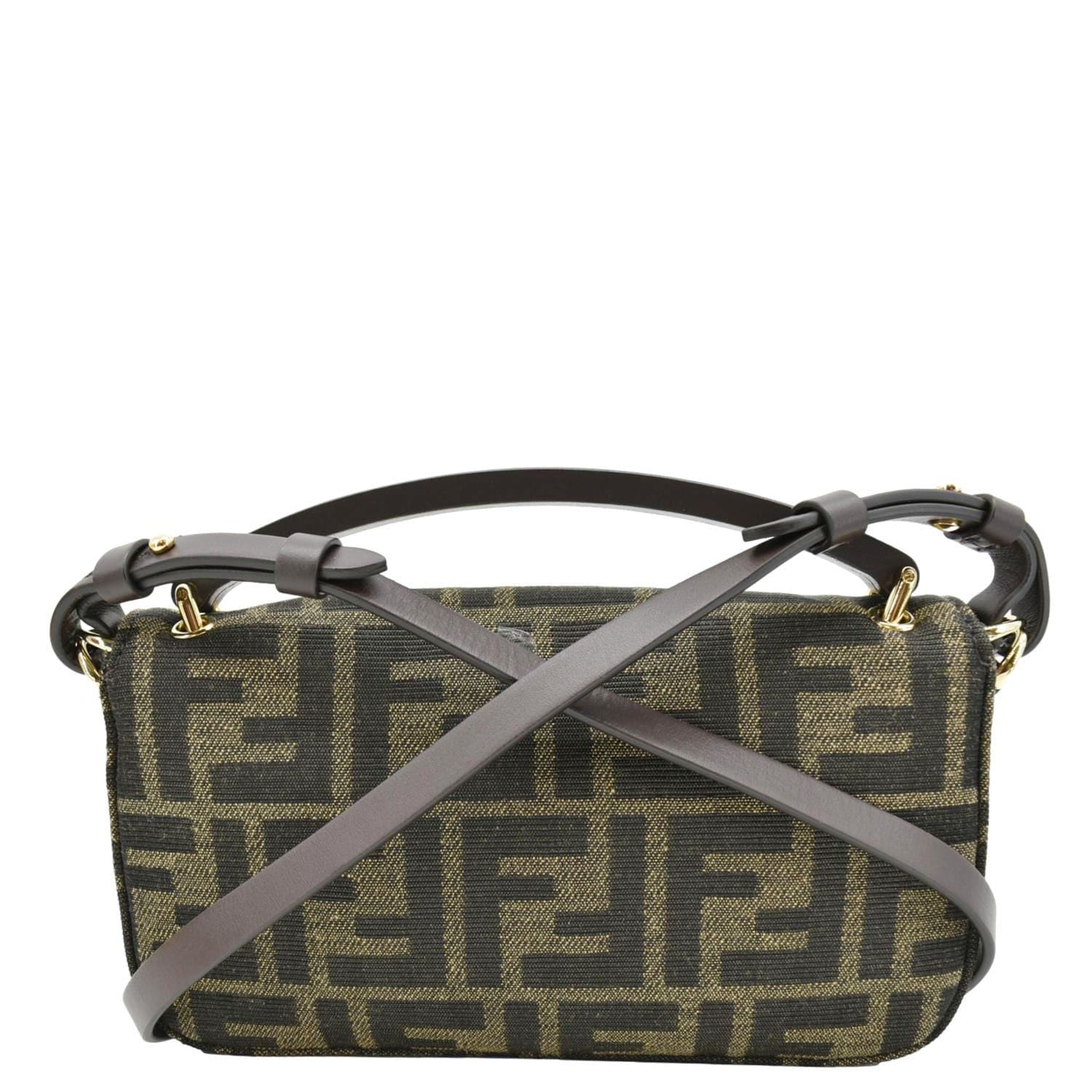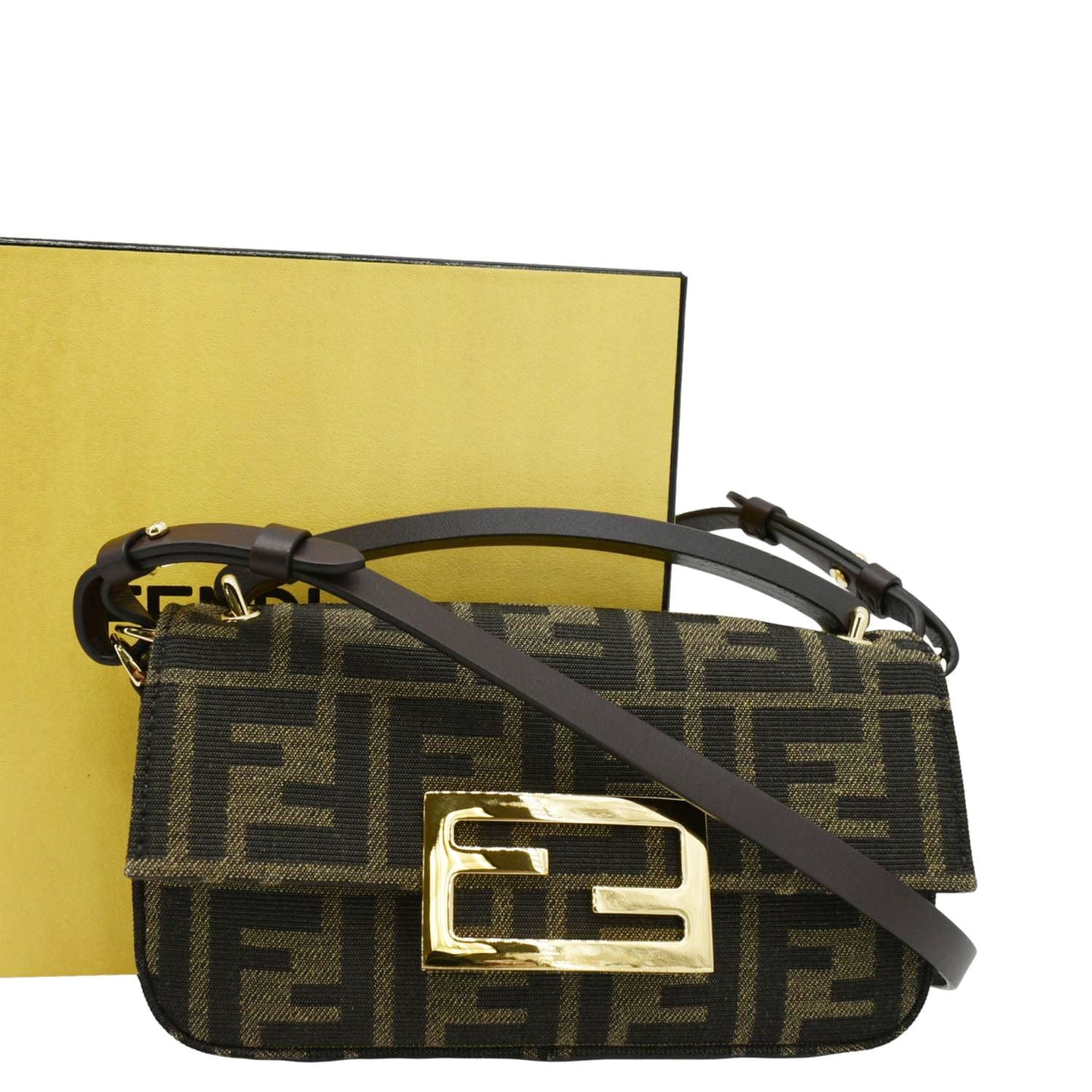 The FENDI Baguette Mini Zucca Canvas Shoulder Bag in Brown showcases the iconic FF monogram pattern on a compact, stylish design. This classic piece features a front flap, adjustable shoulder strap, and timeless elegance, perfect for chic, everyday wear.