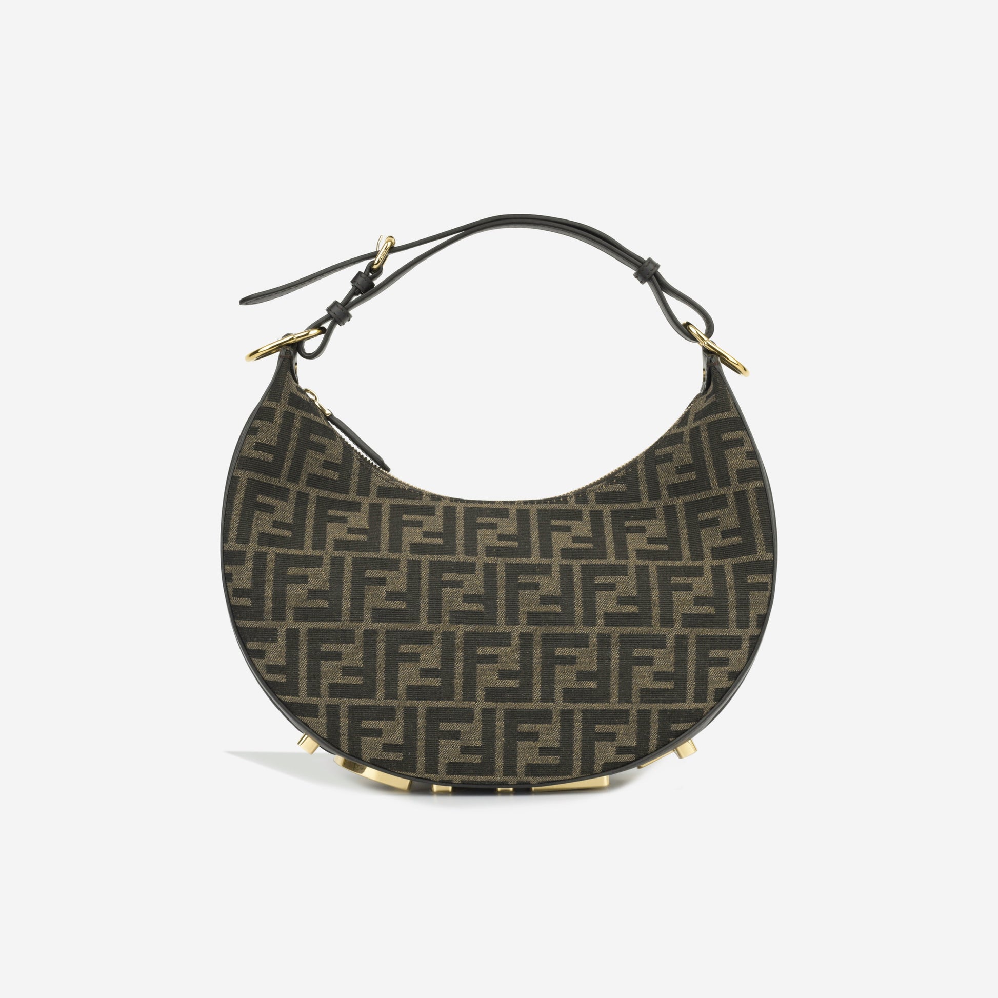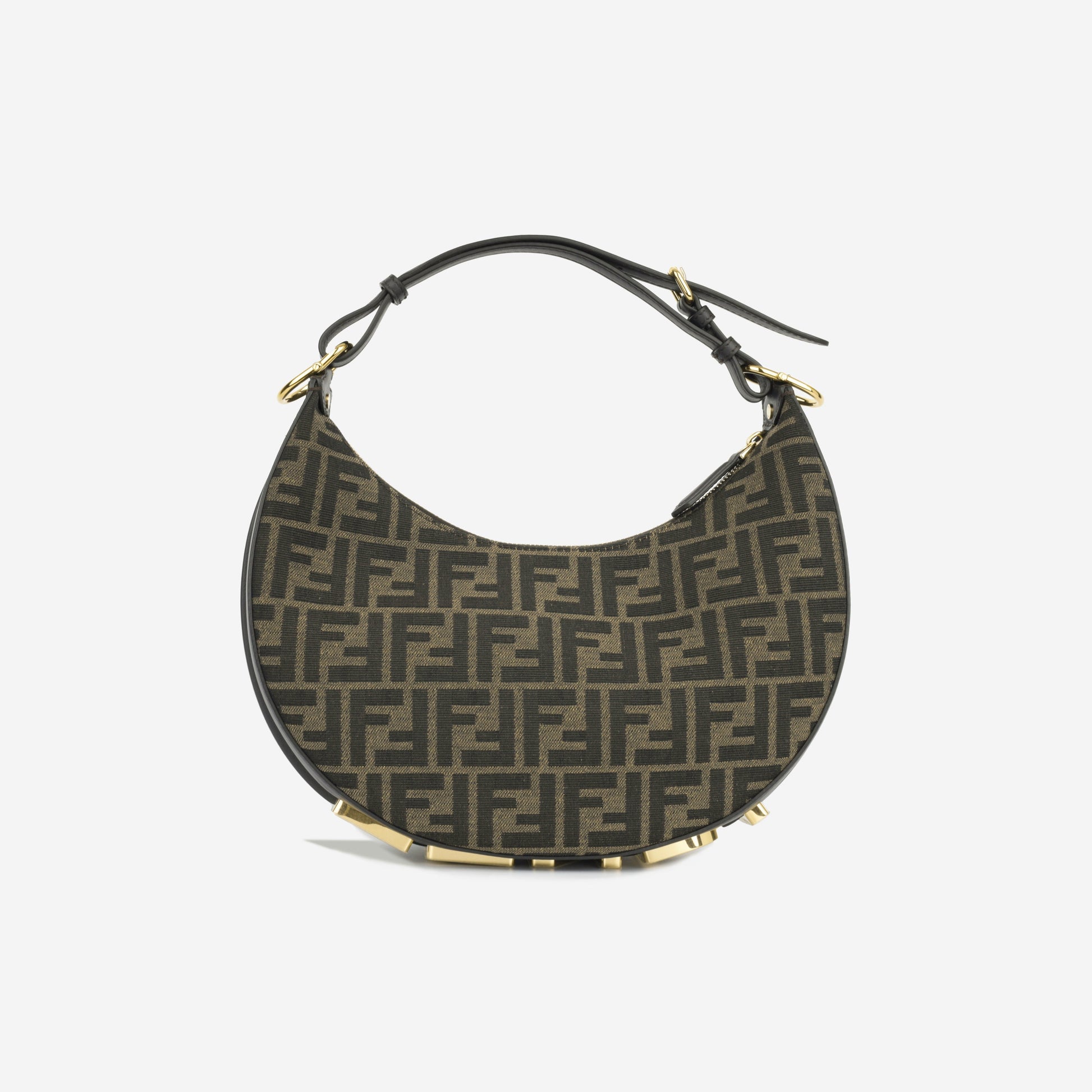 The Fendigraphy small hobo crafted FF jacquard motif fabric and embellished with gold FENDI lettering across the base visible when worn on the shoulder. The adjustable shoulder strap allows for crossbody wear.