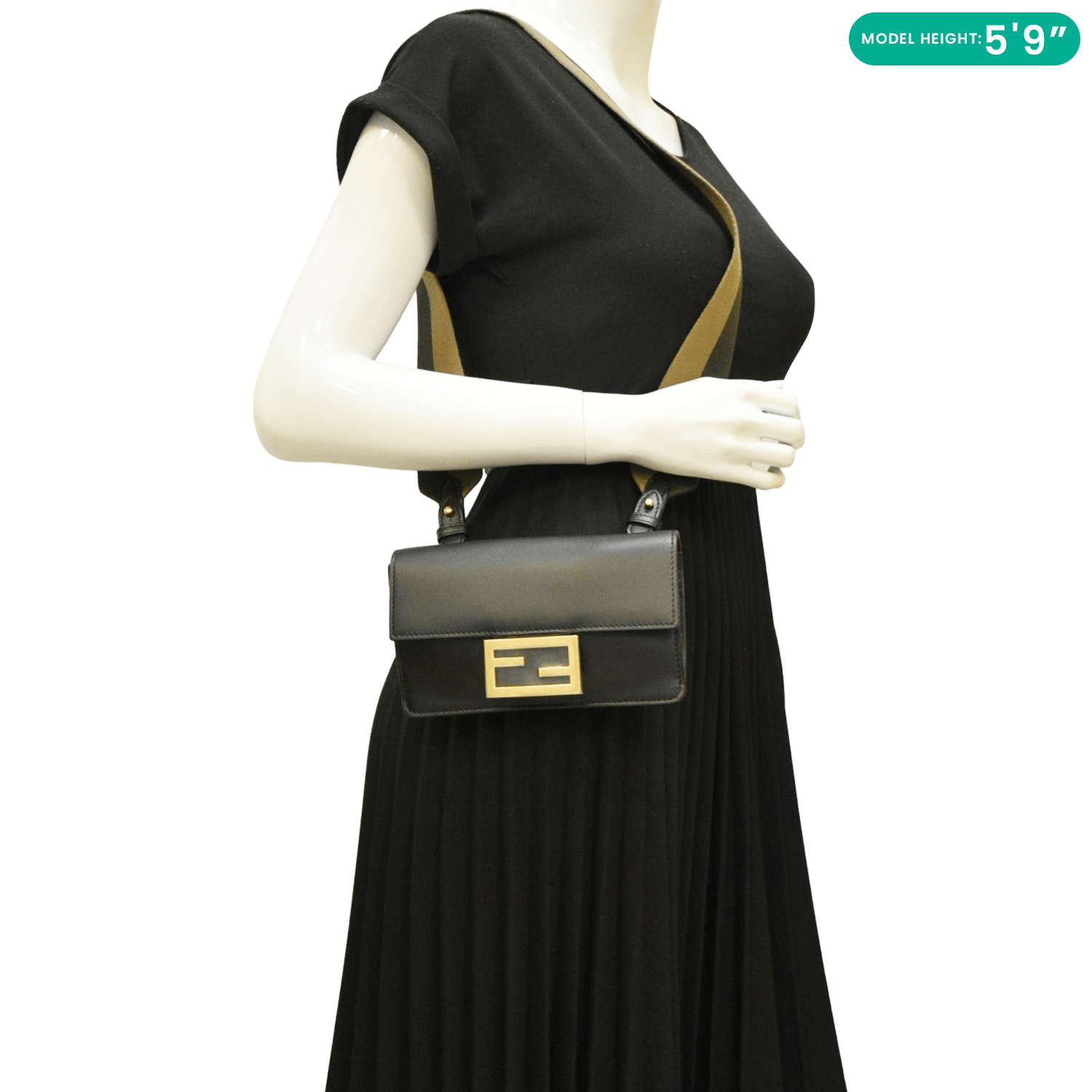 The FENDI Flat Baguette Mini Leather Shoulder Bag in Black offers a sleek and compact design with luxurious leather. This stylish mini bag is perfect for adding a touch of elegance to any outfit.