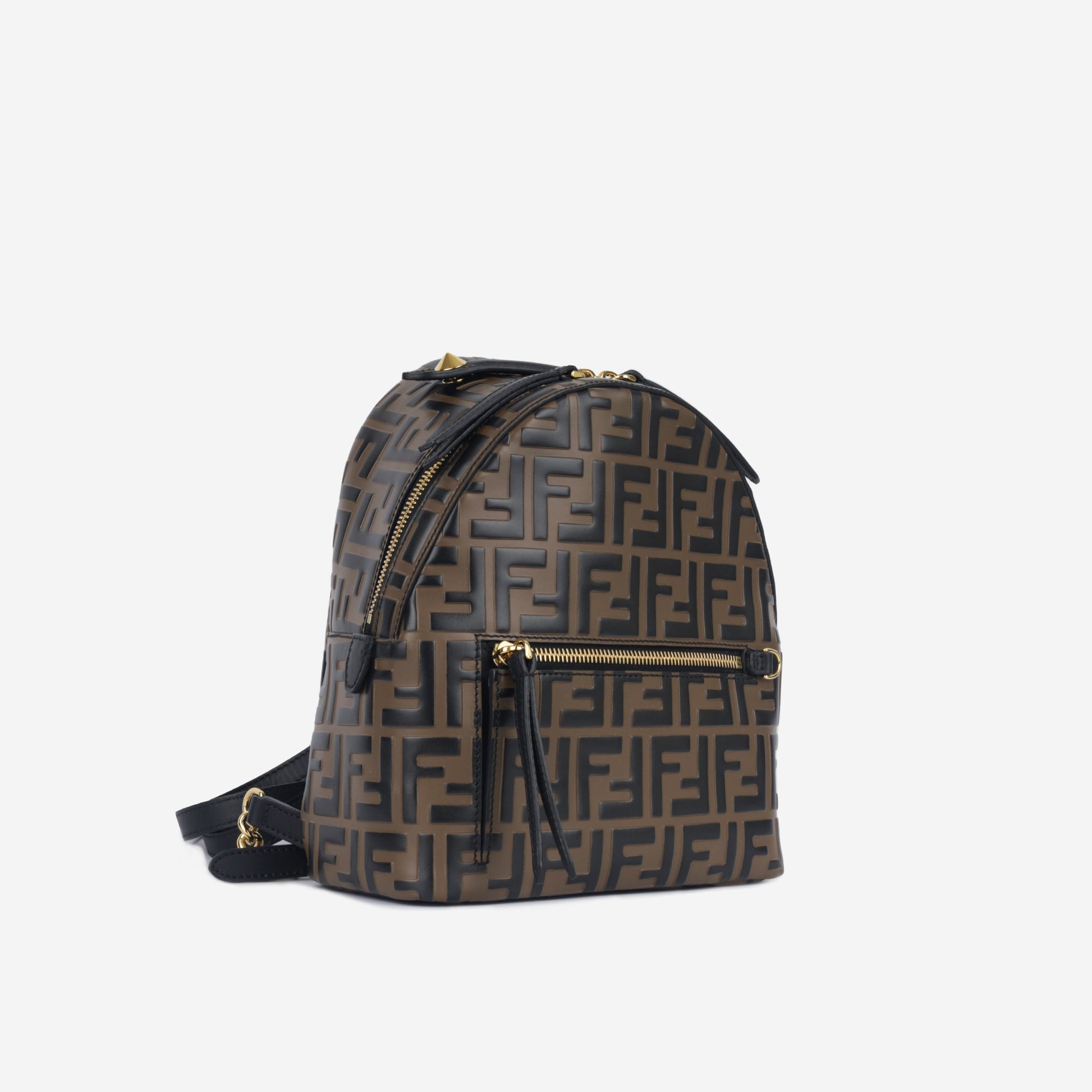FF motif embossed mini backpack, crafted from leather and fully lined. Comes with a spacious compartment, zip fastening with double slider, a front pocket with zip and gold-finish metalware. Can be worn both on the shoulder or carried by the top handle.