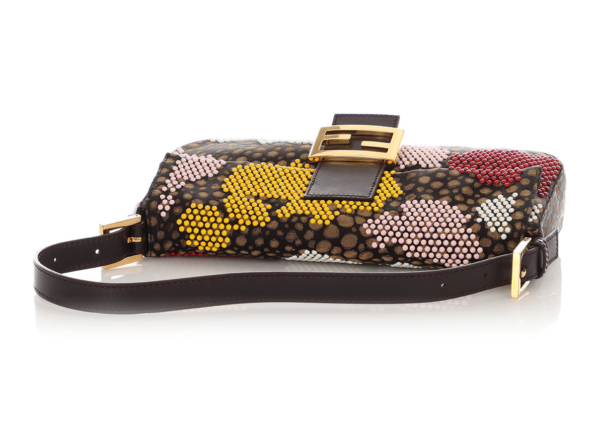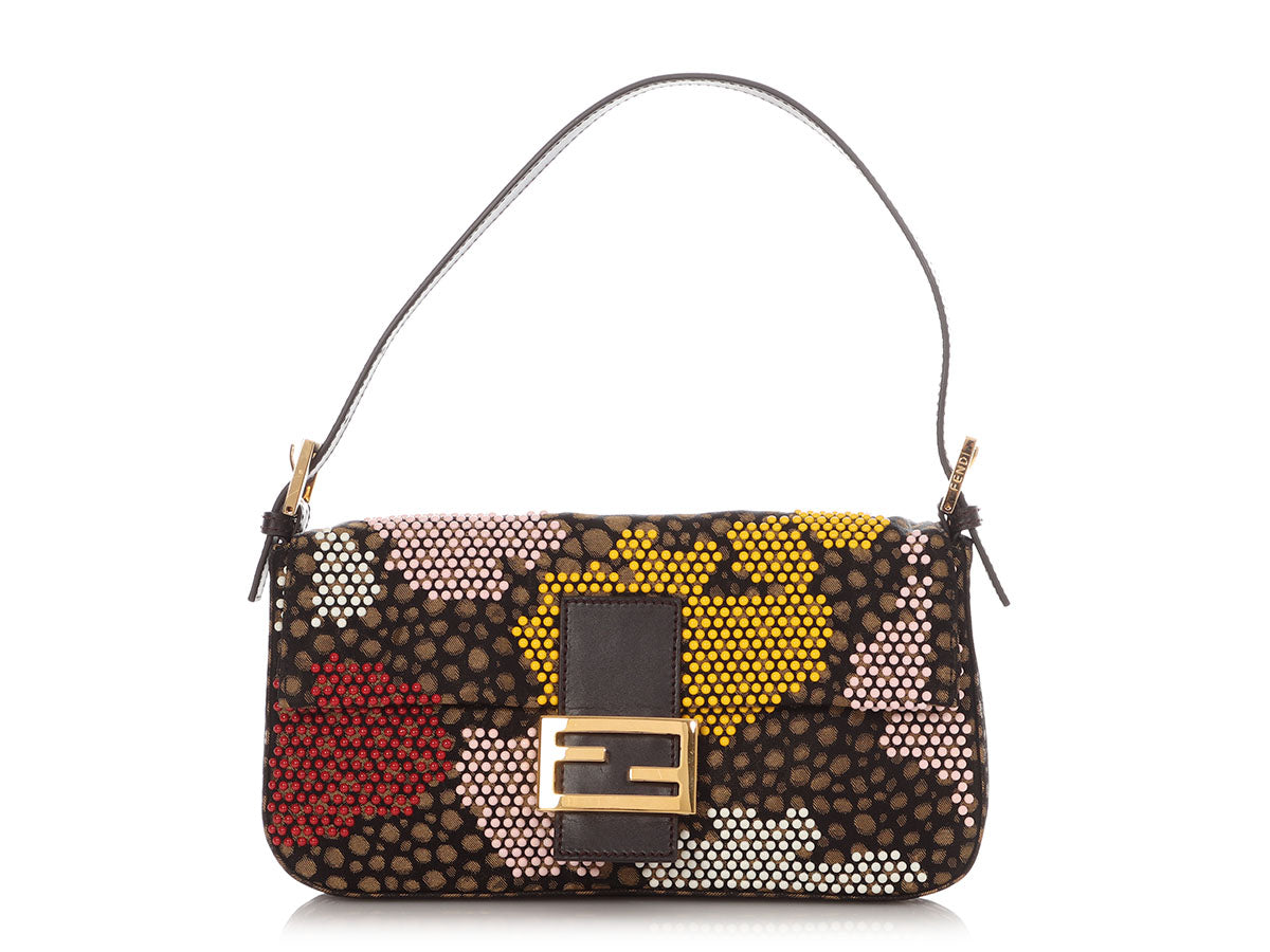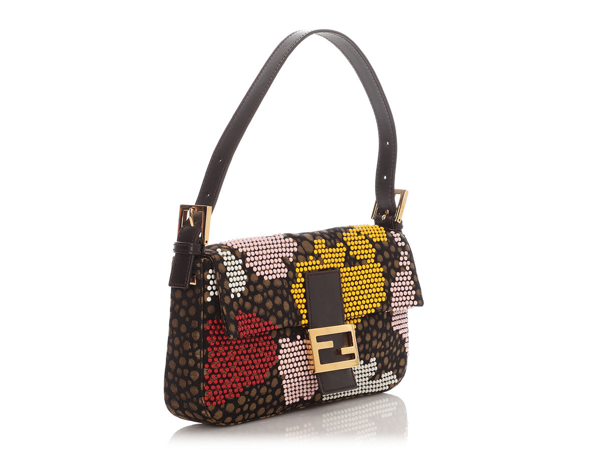 Fendi’s Multicolor Dots Baguette is an eye-catching classic! Made of black fabric with a metallic brown dot print, it’s sprinkled with yellow, pink, white, and red bead-like dots. Beneath the adjustable brown leather shoulder strap shown with a 6.75-inch drop, the flap is adorned with gold logo hardware and secures with a magnetic snap. Inside you’ll find yellow fabric lining with one zipped and one slide pocket. In great condition with a dustbag and mirror, it has scratches on the leather and hardware and a few small stains inside. The multicolor dots have a 3D effect giving this bag loads of touchable textural interest!