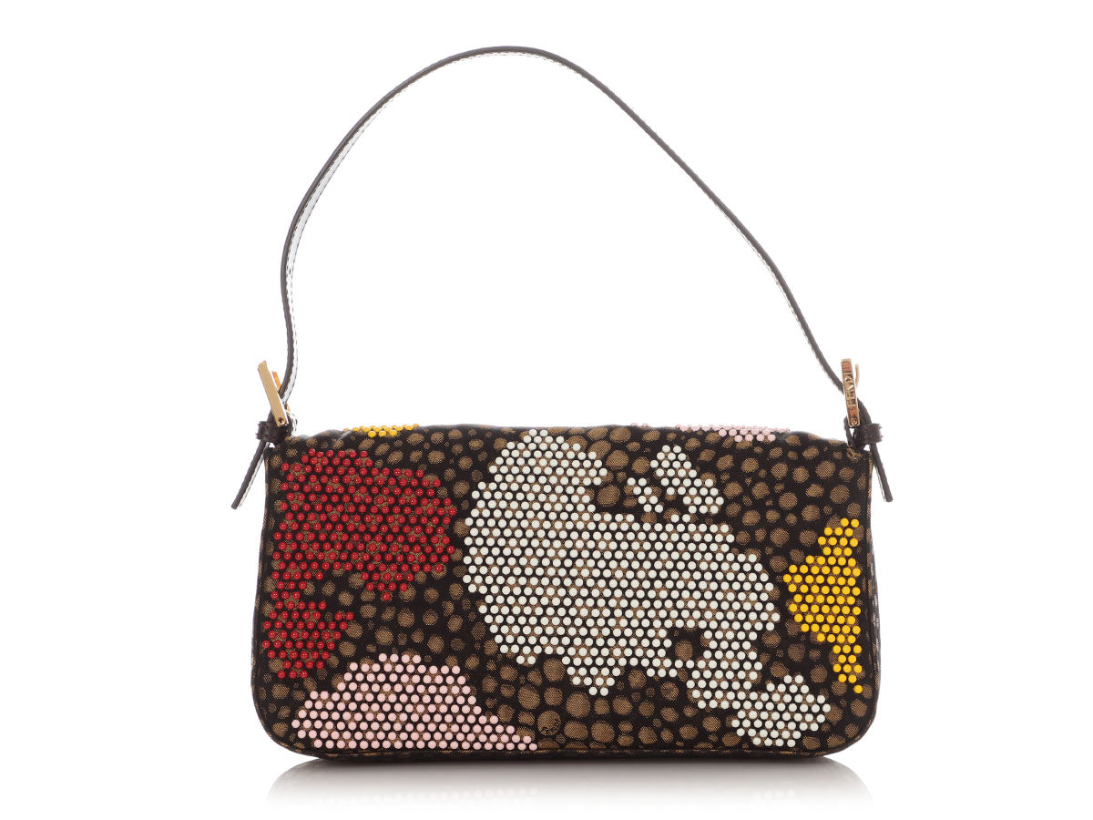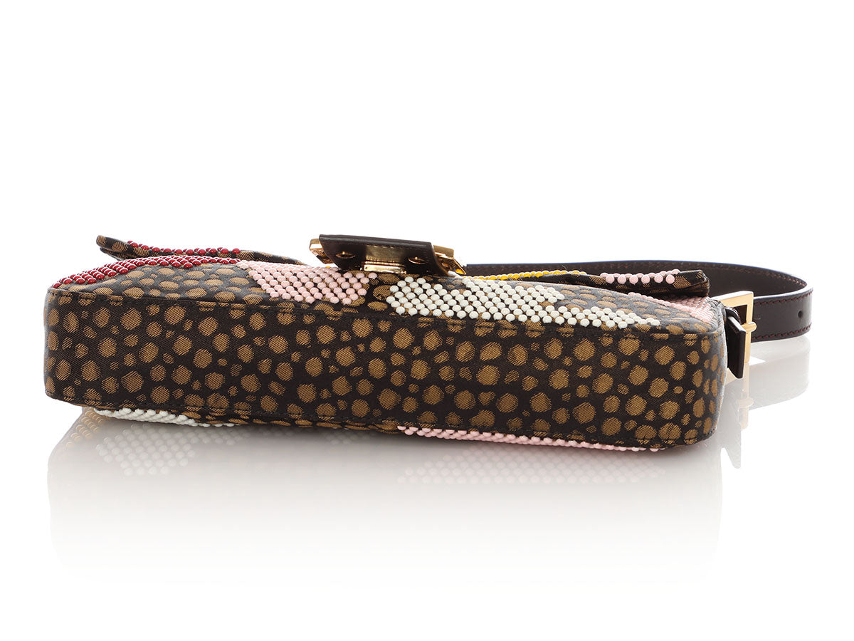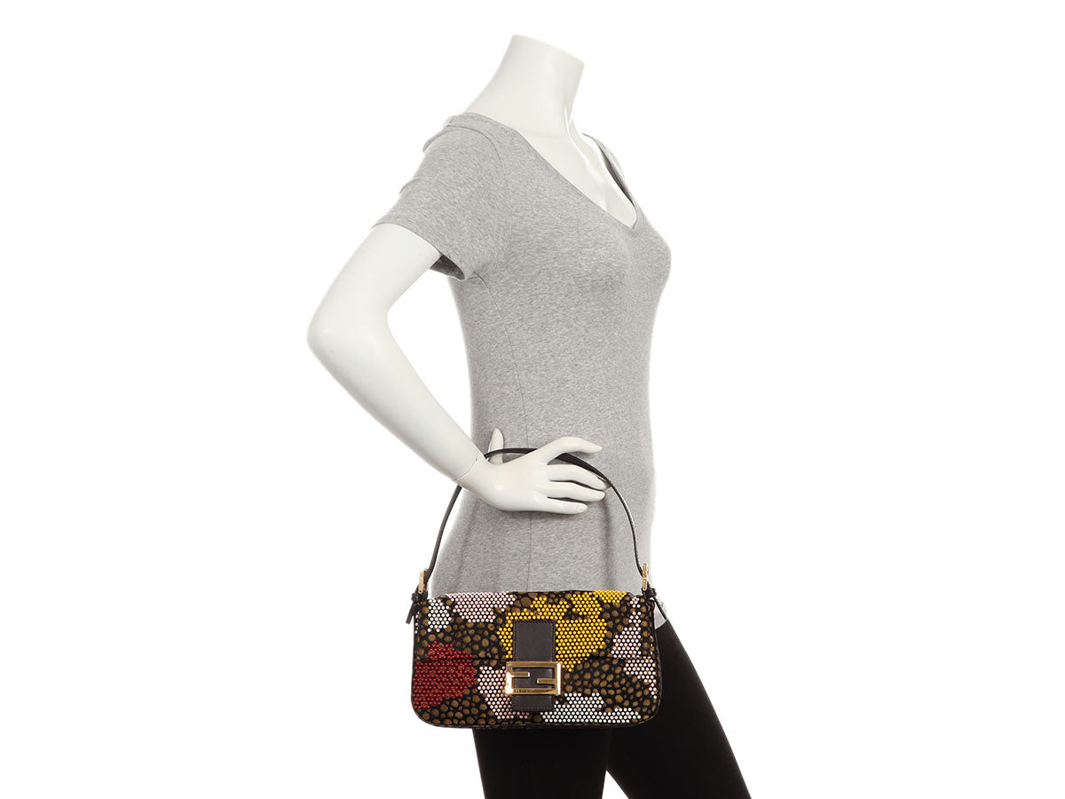 Fendi’s Multicolor Dots Baguette is an eye-catching classic! Made of black fabric with a metallic brown dot print, it’s sprinkled with yellow, pink, white, and red bead-like dots. Beneath the adjustable brown leather shoulder strap shown with a 6.75-inch drop, the flap is adorned with gold logo hardware and secures with a magnetic snap. Inside you’ll find yellow fabric lining with one zipped and one slide pocket. In great condition with a dustbag and mirror, it has scratches on the leather and hardware and a few small stains inside. The multicolor dots have a 3D effect giving this bag loads of touchable textural interest!