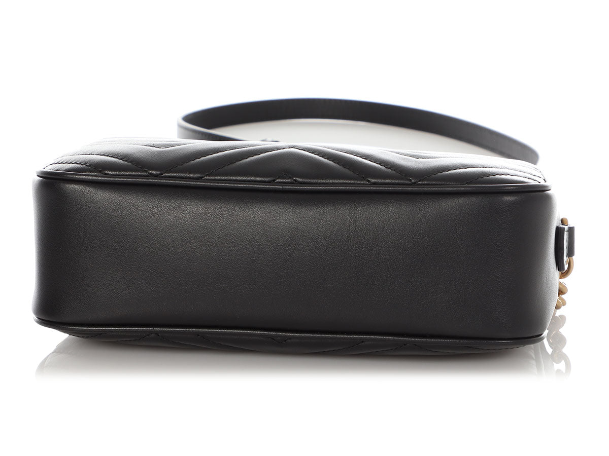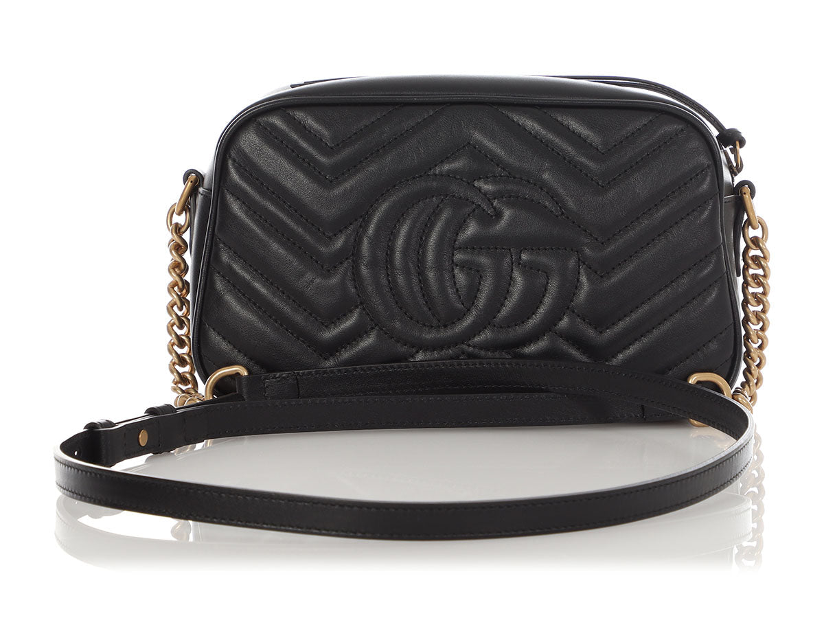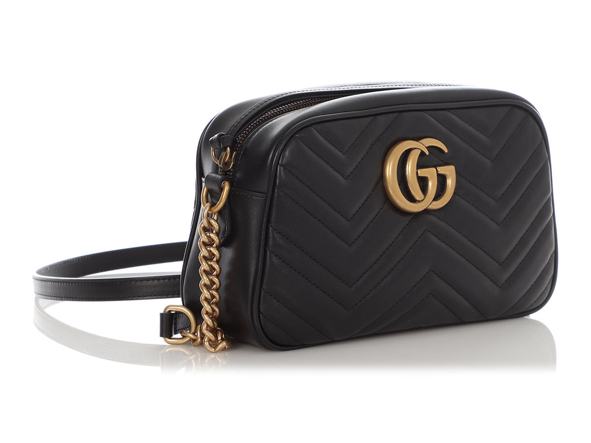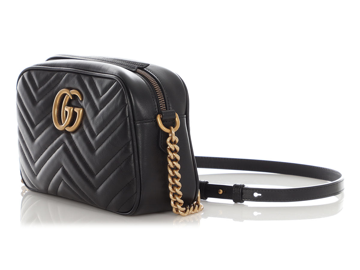 Gucci�s Small Black GG Marmont Shoulder Bag is a softly structured carry made of chevron-quilted matelass� leather! The front features a gold-tone Double G embellishment, while the back face is logo-stitched. The zippered top opens to tan-fabric lining with one slide pocket inside and the adjustable chunky chain-and-leather strap is shown with a crossbody drop of 23 inches. In excellent condition, it comes with a dustbag and box and might have been worn. Also known as a GG Marmont Camera Bag, it can fit an iPhone Pro Max/Plus, Airpods, a small wallet, and lip gloss!