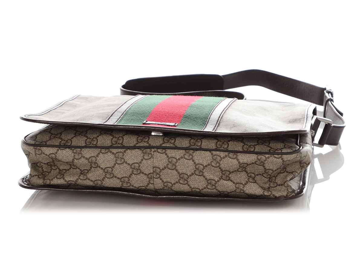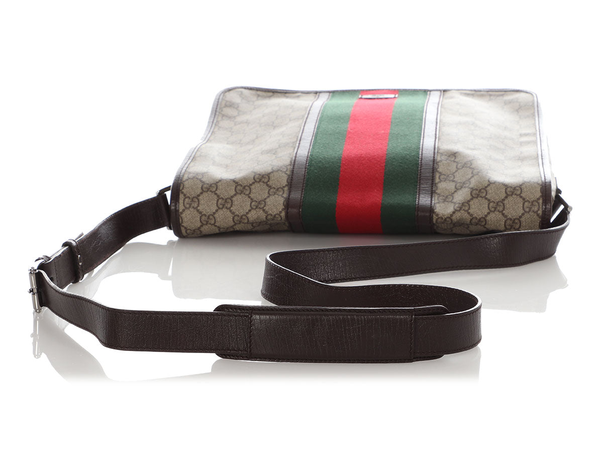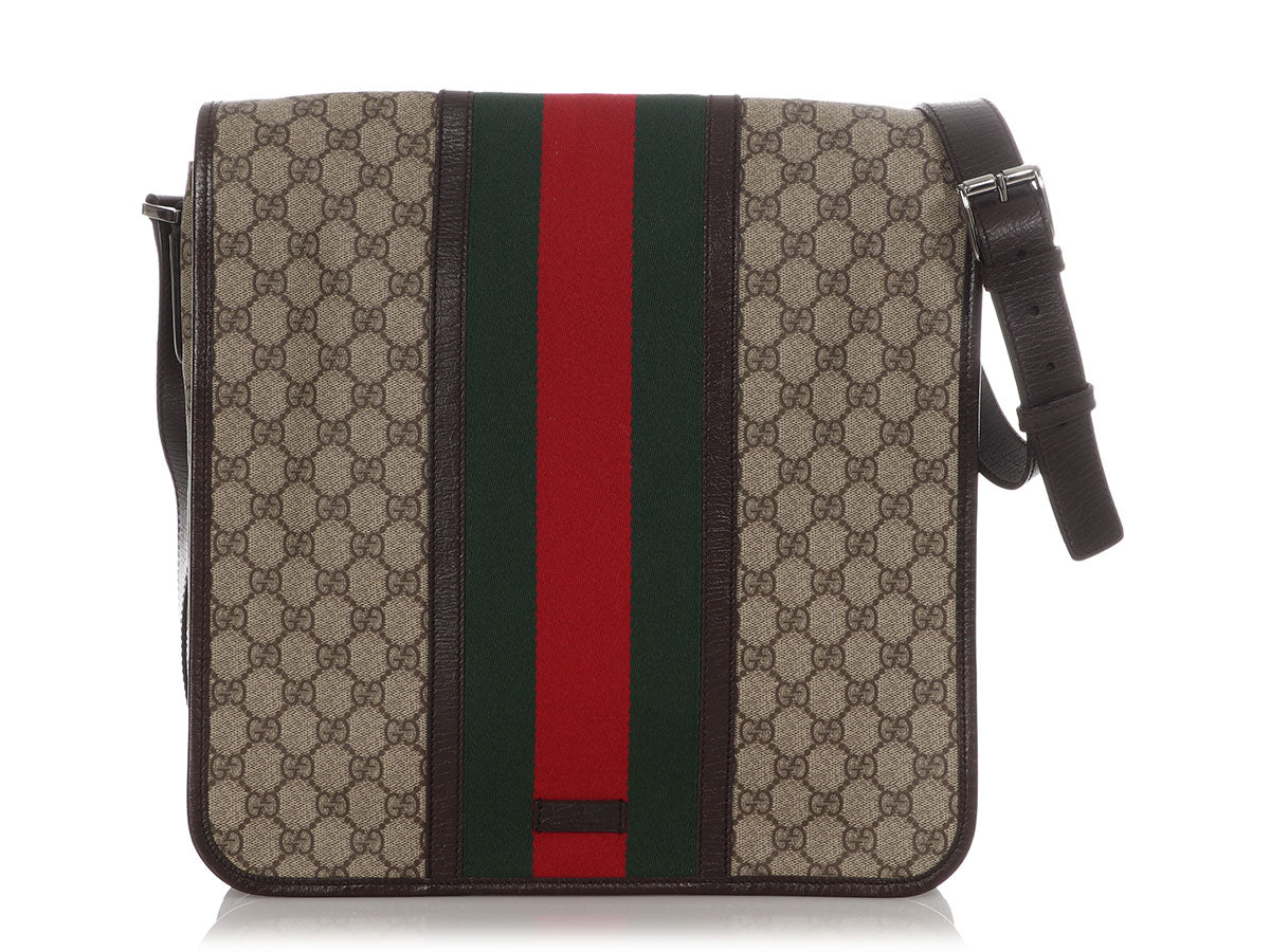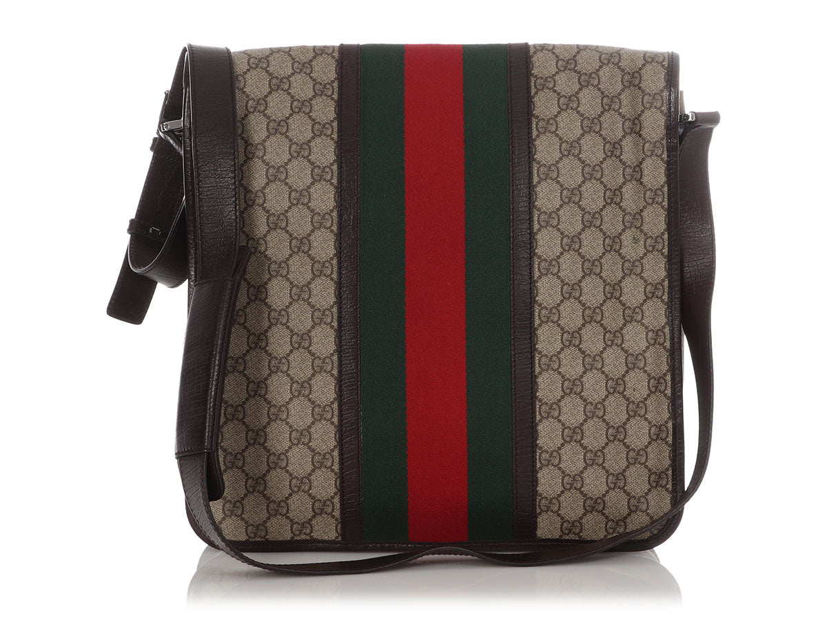 Gucci�s GG Supreme Sherry Messenger Bag is a crossbody with plenty of space and even more gorgeous Gucci good looks! Made of GG Supreme canvas with brown leather details and green-and-red webbing stripes on the front and back, the flap secures with a magnetic snap, opening to brown fabric lining inside with one zipped and one slide pocket. In very good condition with a dustbag, there is light pilling on the webbing, light rubbing along the edges and corners, light scratches on the gunmetal hardware, a tiny dark mark on the back, and it has a faint musty smell. With a 21.5-inch drop shown on the adjustable brown leather strap, it jas supreme style!