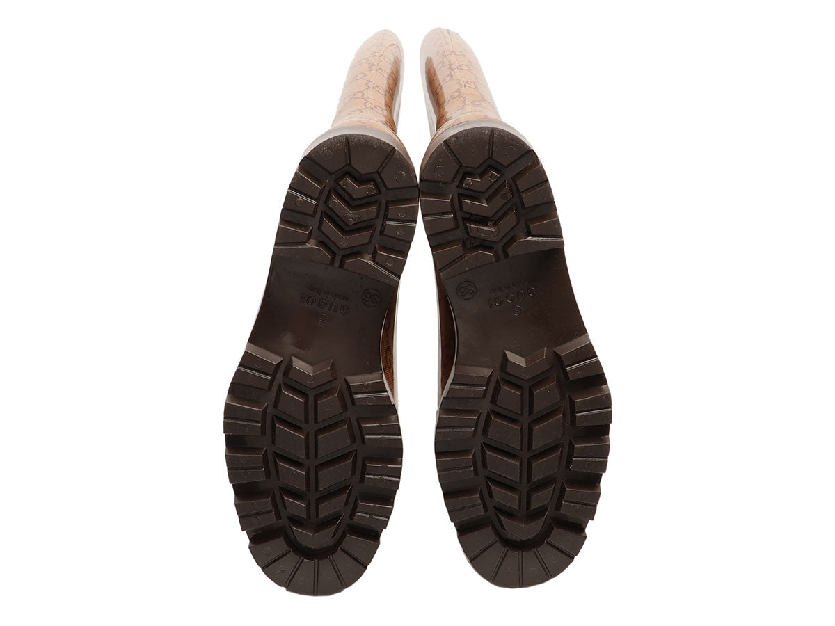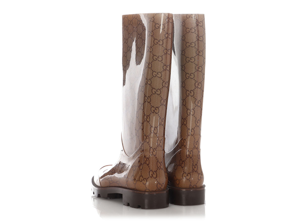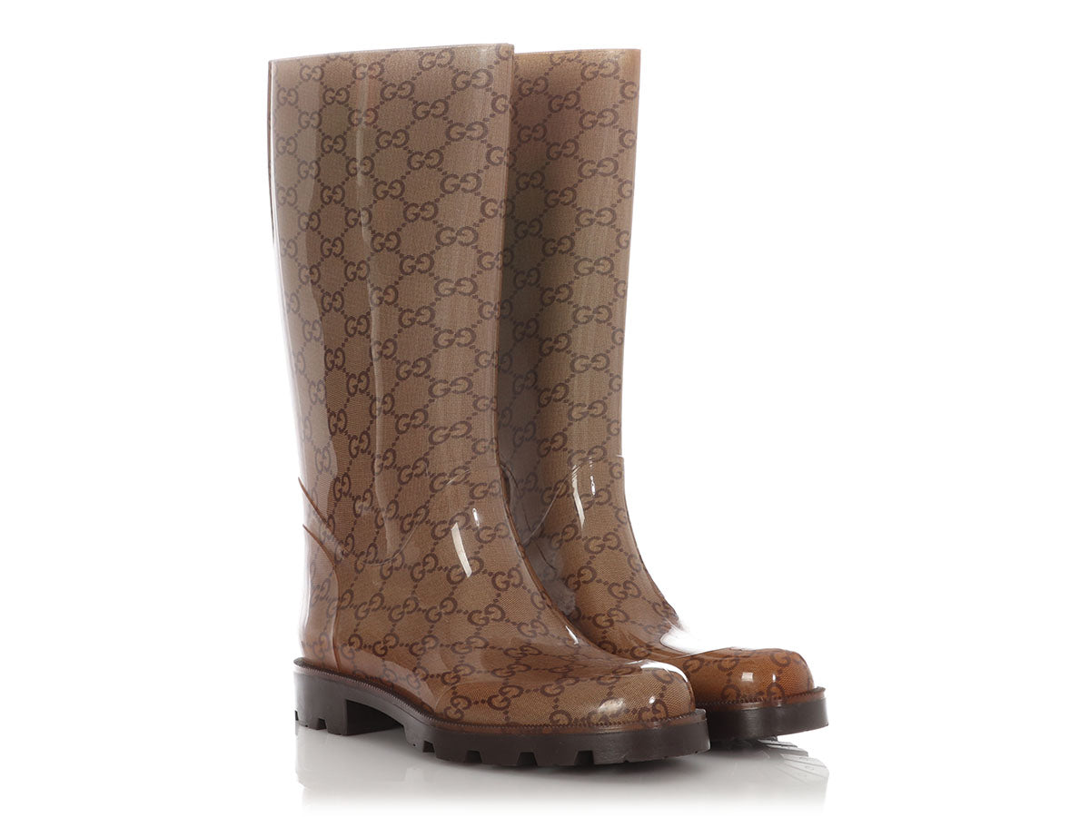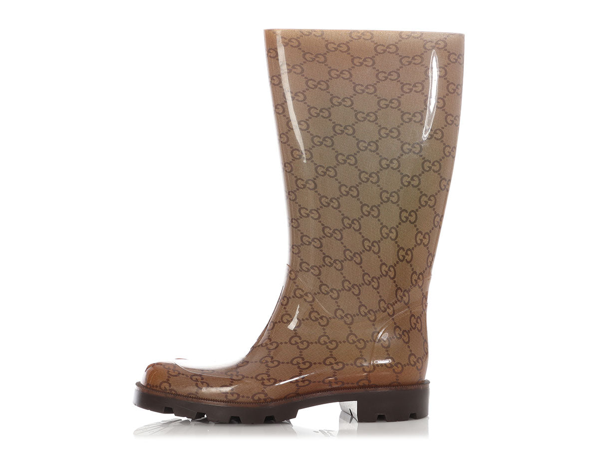 Stomp puddles in style in Gucci’s Brown GG Rain Boots! Made of brown monogram fabric coated in clear rubber, they pull on and have 0.75-inch heels, rubber lug soles, and fabric inners. In good condition, they are discolored along the top edges and near the toes and heels and the fabric has darkened, but I don’t believe they have been worn. These weather-proof boots are a fabulous look, rain or shine!