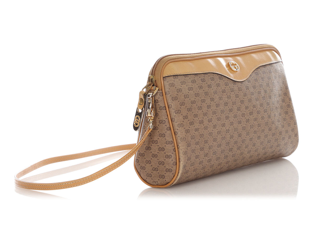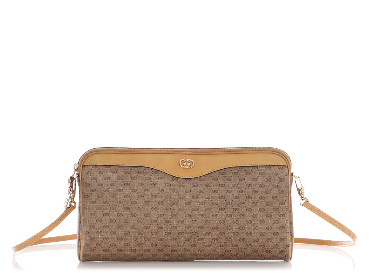 Gucci�s Vintage Micro GG Canvas Shoulder Bag is a classic look that speaks to Gucci�s timeless style! It's made of brown GG canvas, while the details and 18.75-drop of the detachable strap are smooth tan leather. A zipper opens to tan leather lining and one zipped pocket inside. In good condition with a dustbag, the corners and edges are rubbed, the hardware is scratched and losing its gold tone, the leather has stressing and some scratches, the fabric has pilled at the zipper ends, all the zipper fabric is darkened, the inside has some staining, rubbing, and marks, and it has a musty smell�it�s a good deal of wear but it looks great for a vintage bag. It�s a classic design that shows that Gucci will always be in fashion!