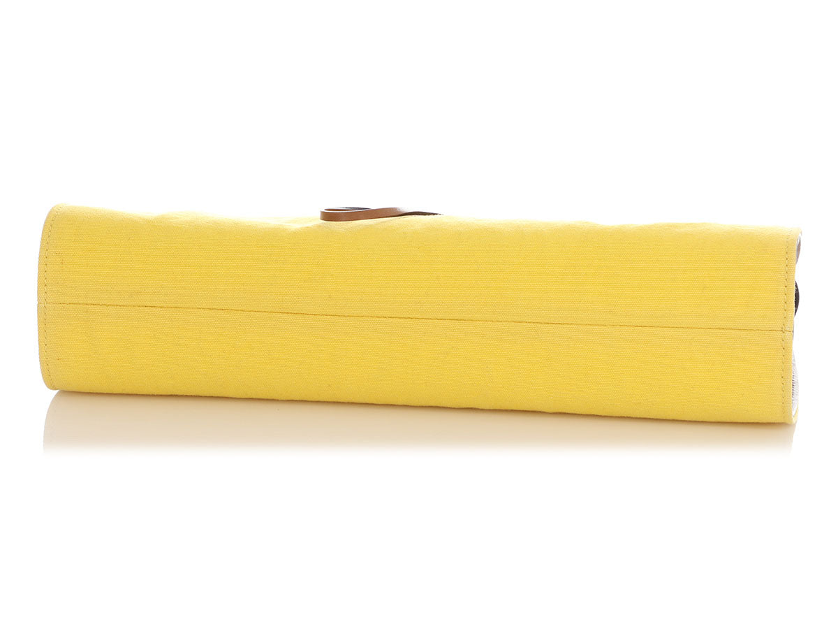 Gucci�s Yellow Canvas Bamboo Shoulder Bag is a ray of sunshine! Made of thick yellow canvas with brown-leather details and antiqued-brass hardware, it has a dark-brown bamboo handle with a 4.75-inch drop. The top secures with a magnet and inside you�ll find a matching yellow-fabric lining with one zipped pocket. In very good condition with a dustbag, it has very slight discoloration along the bottom, scratches on the leather parts, and some marks and dark fuzzies inside. The eye-catching color will brighten up any ensemble!