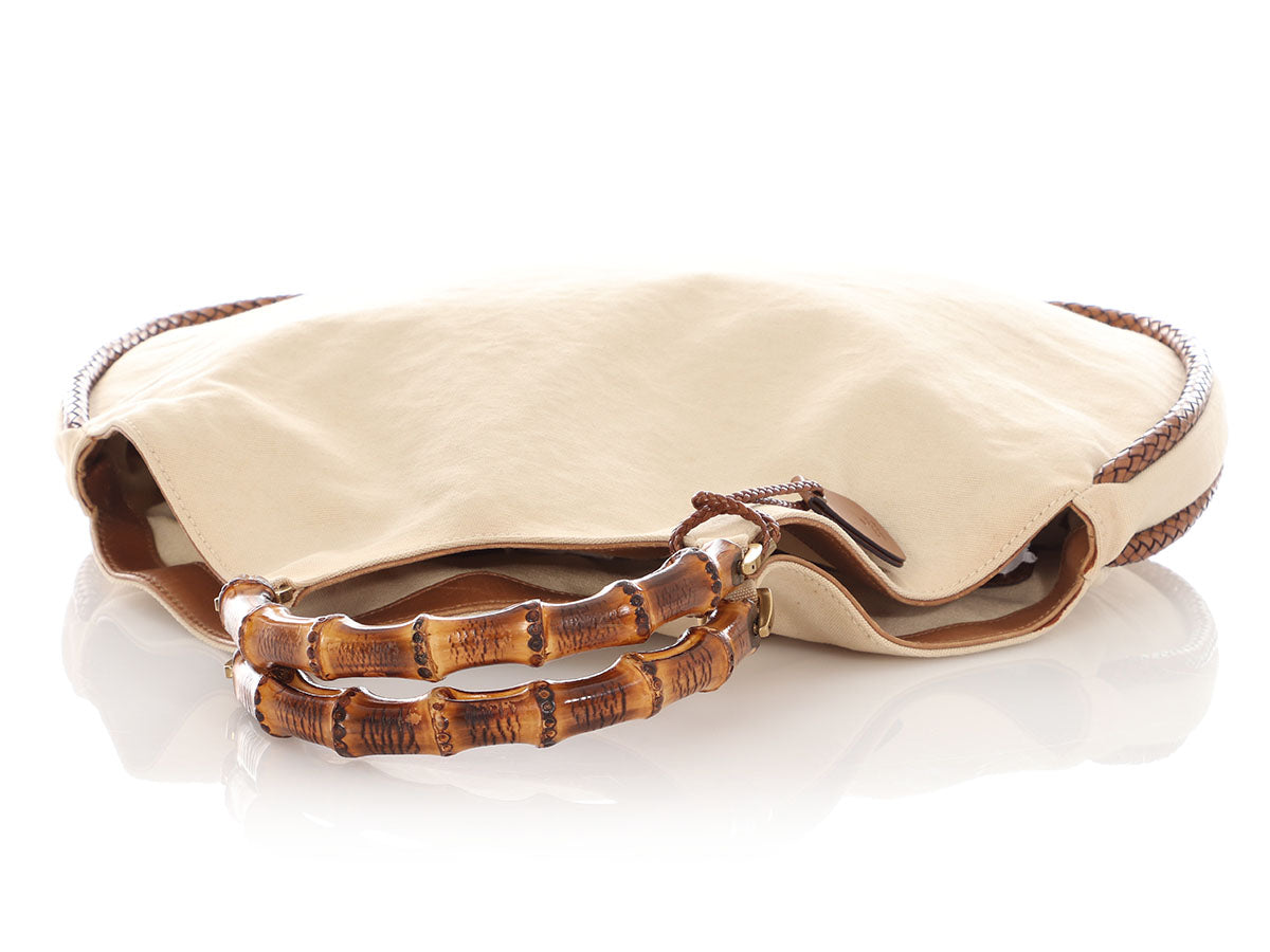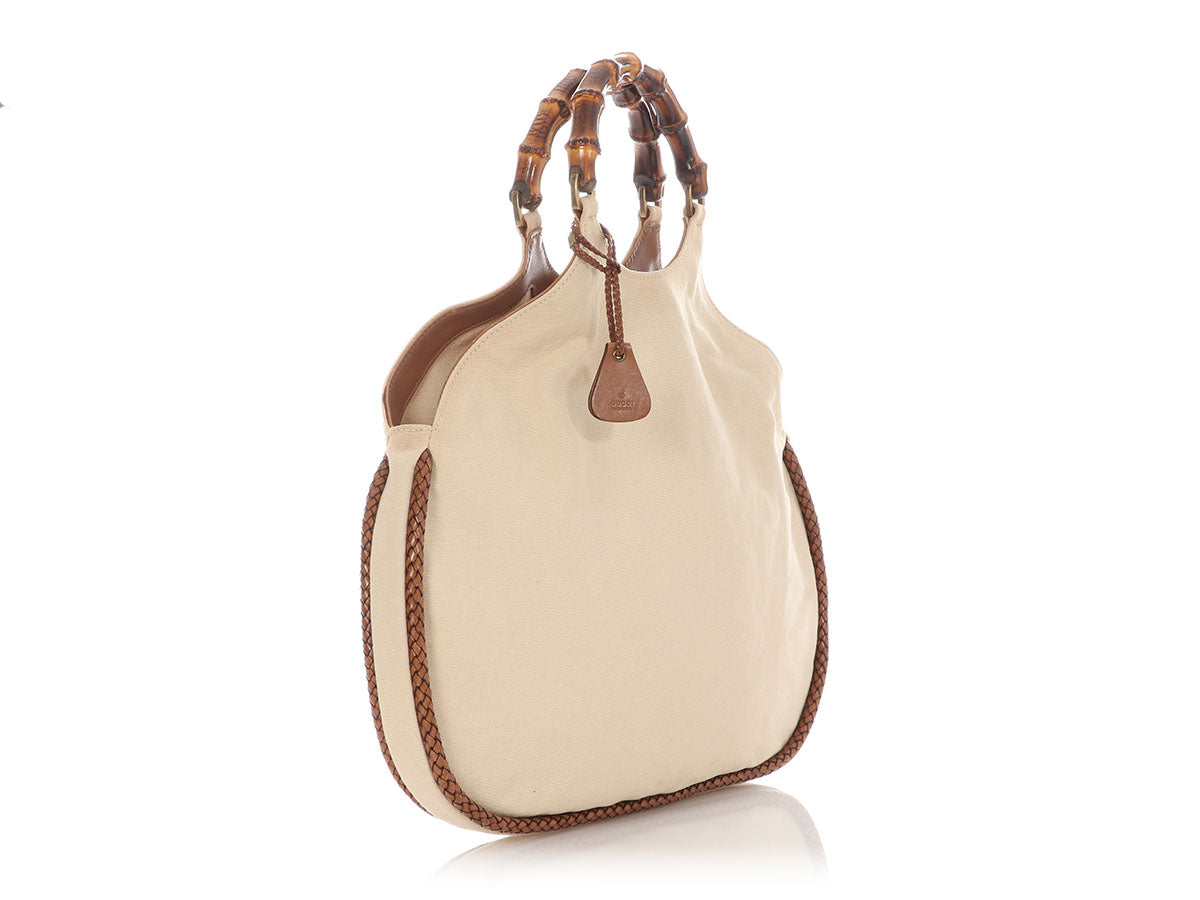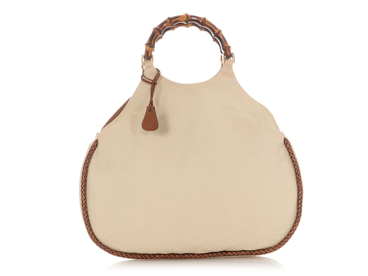 Gucci�s Beige Canvas Bamboo Handle Bag has a shapely silhouette with its wide bottom and curved top handles! Made of neutral-toned canvas with braided brown leather trim and gold hardware, it has a small leather charm hanging from the handles which have a 4.25-inch drop. Peek inside the open top and you�ll find an unlined interior with one zipped pocket. In very good condition with a dustbag, it has wear on the hardware and leather parts, slight rubbing on the braided edges, a few pulls in the canvas, and yellowing inside the zipped pocket. It�s a simple style that�s unmistakably Gucci!