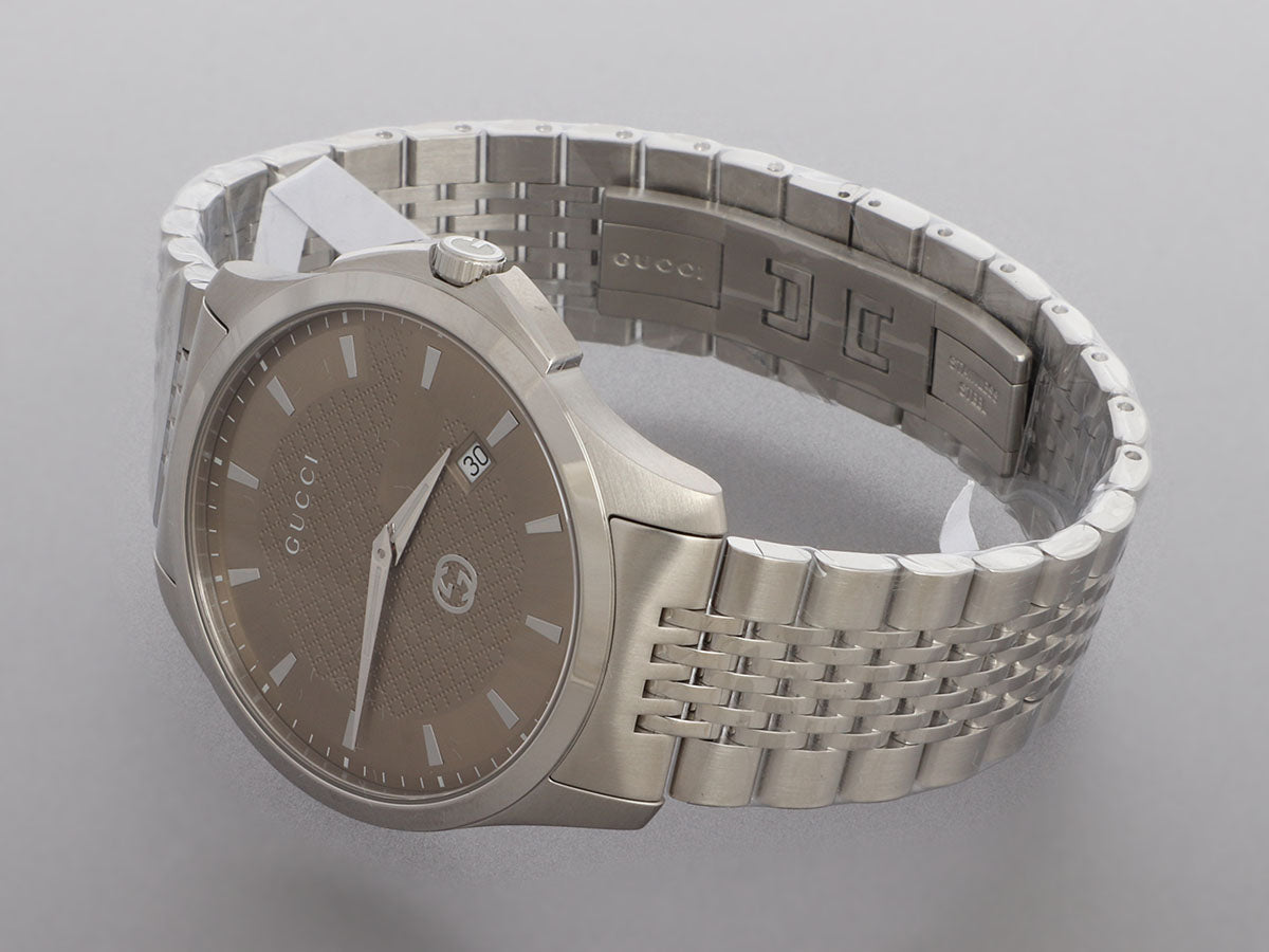 Gucci’s Stainless Steel G-Timeless Watch 40mm is a unisex timepiece with a cool look! This Swiss-made quartz watch has a brown quilted dial with a date window at the 4 o’clock position, baton hour markers, and a deployment bracelet. New and never worn, it comes with a box. Gucci describes its Timeless collection as blending tradition and innovation, as evident in this classy piece!