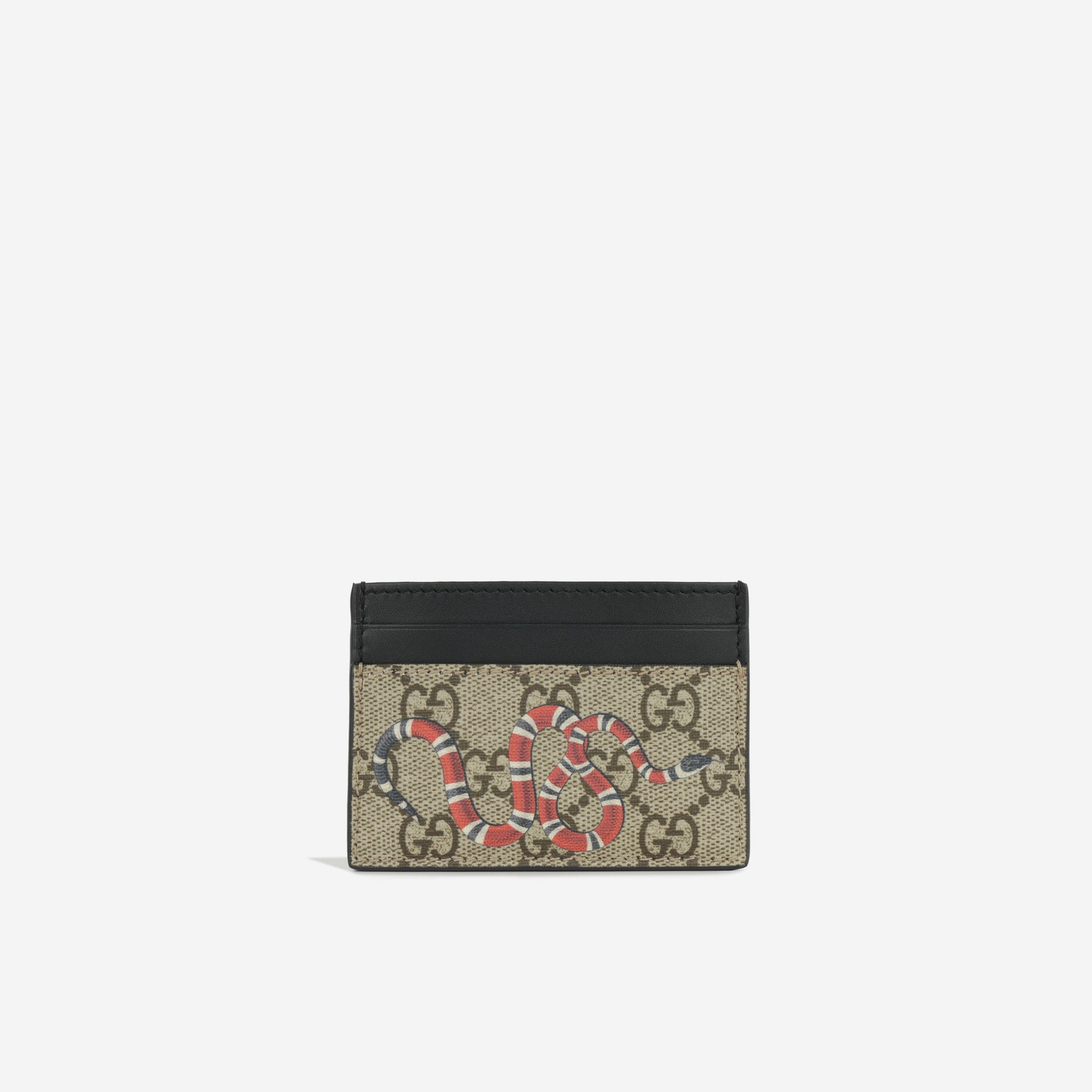 Make a bold statement with the Gucci Kingsnake-print leather card holder �a perfect blend of functionality and iconic design. Features Gucci�s signature Kingsnake print, symbolising wisdom and power, set against a sleek leather backdrop for a striking visual impact. Compact yet practical, it includes multiple card slots to keep your essentials organised. Slim and lightweight, it fits easily into pockets or small bags, ensuring convenience without compromising style.