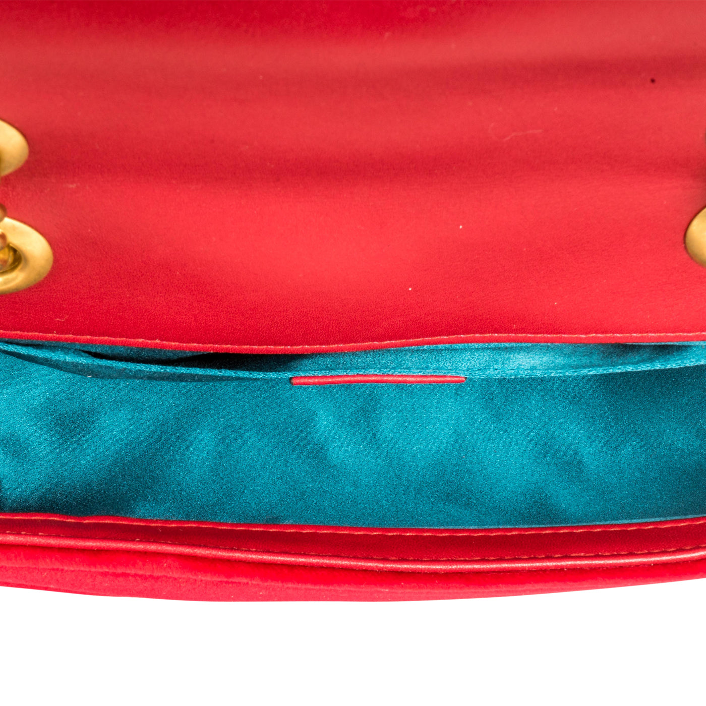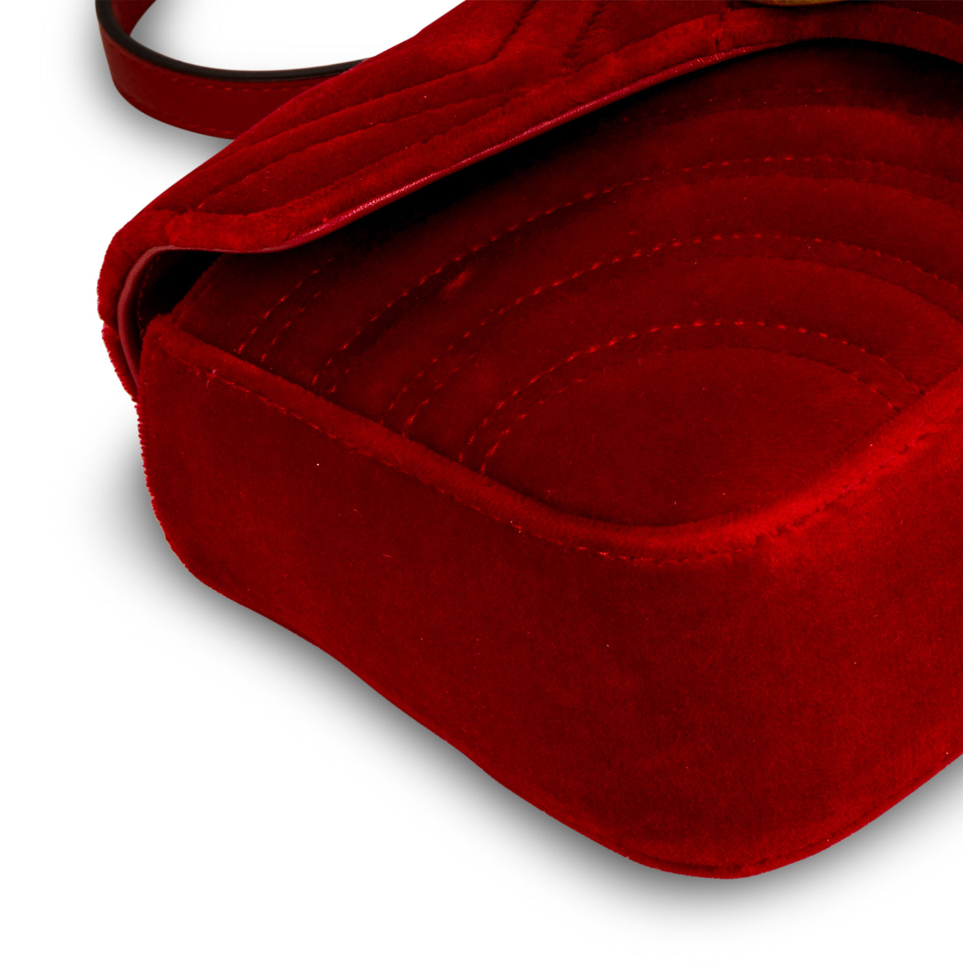 Gucci presents its highly-acclaimed GG Marmont Velvet in lustrous Red Mini. Crafted from the fashion house�s quintessential chevron velvet and embroidery, this handbag also features an endearing heart stitching on its rear.� The GG Marmont is also accented with antique gold hardware, giving the handbag an irrevocable air of sophistication. The bag�s oversized flap opens up to showcase a magnificent azure satin lining, presented in a single storage compartment. Ideally worn in the evening, the GG Marmont Mini is perfect for styling with any and every evening outfit you can conjure.��