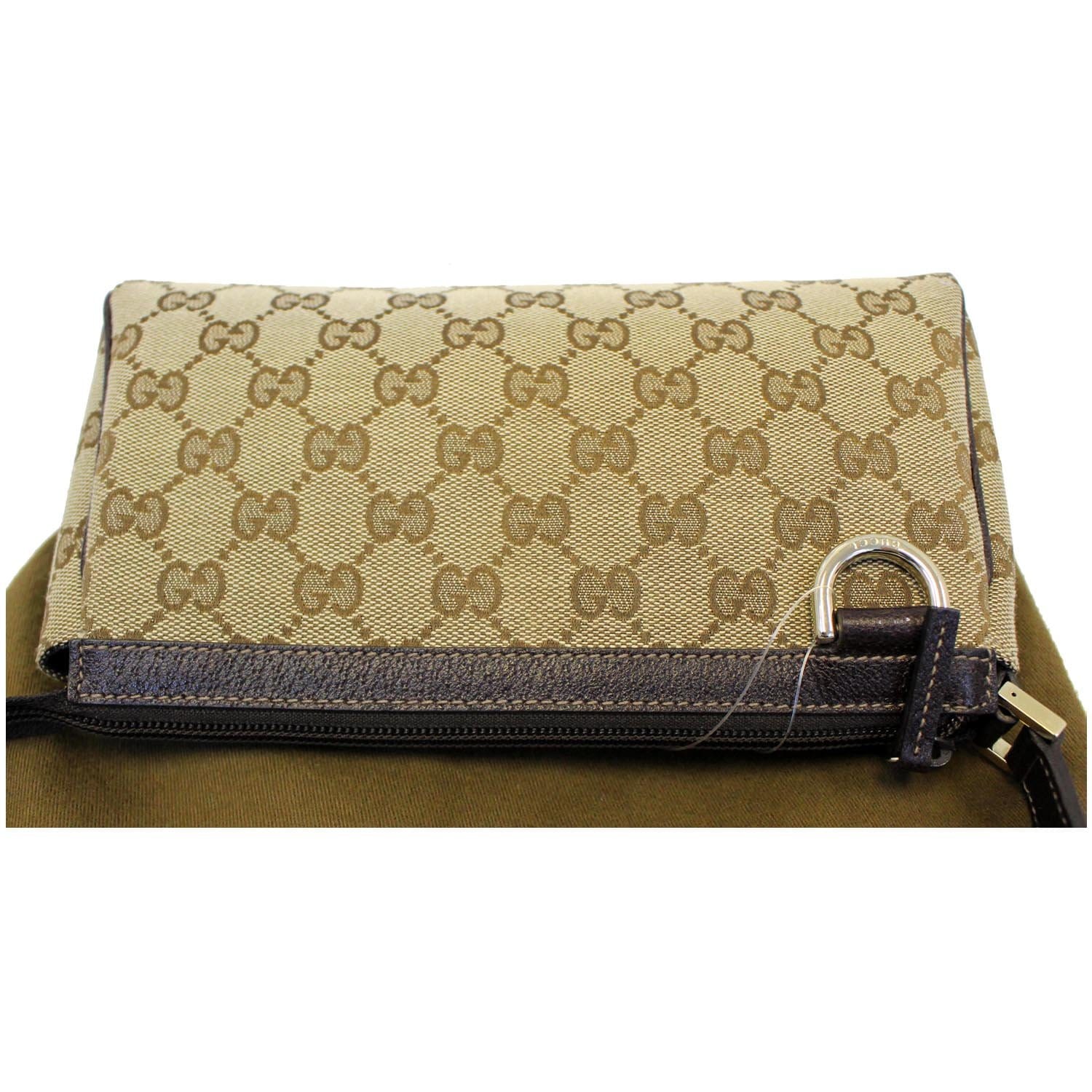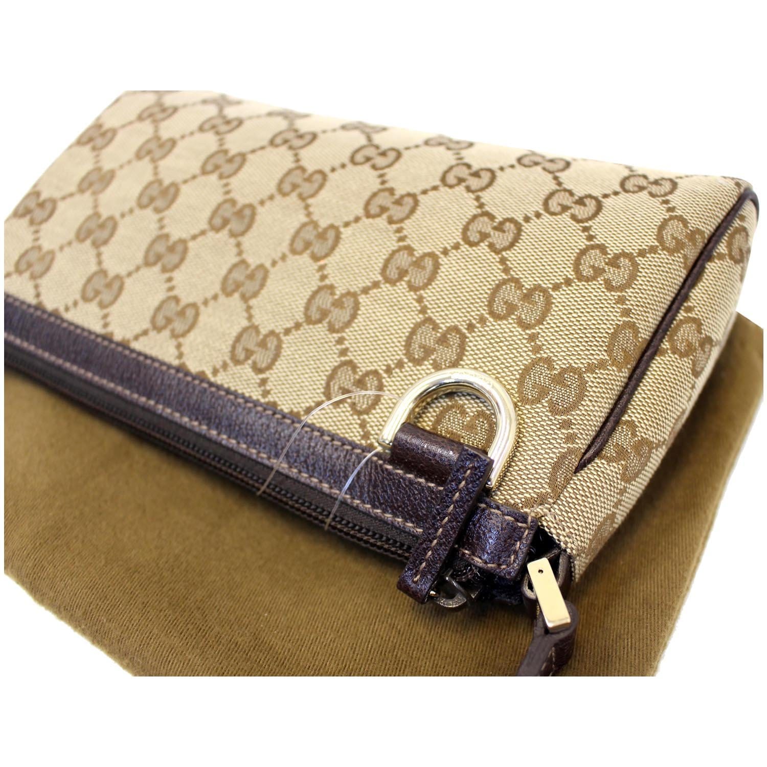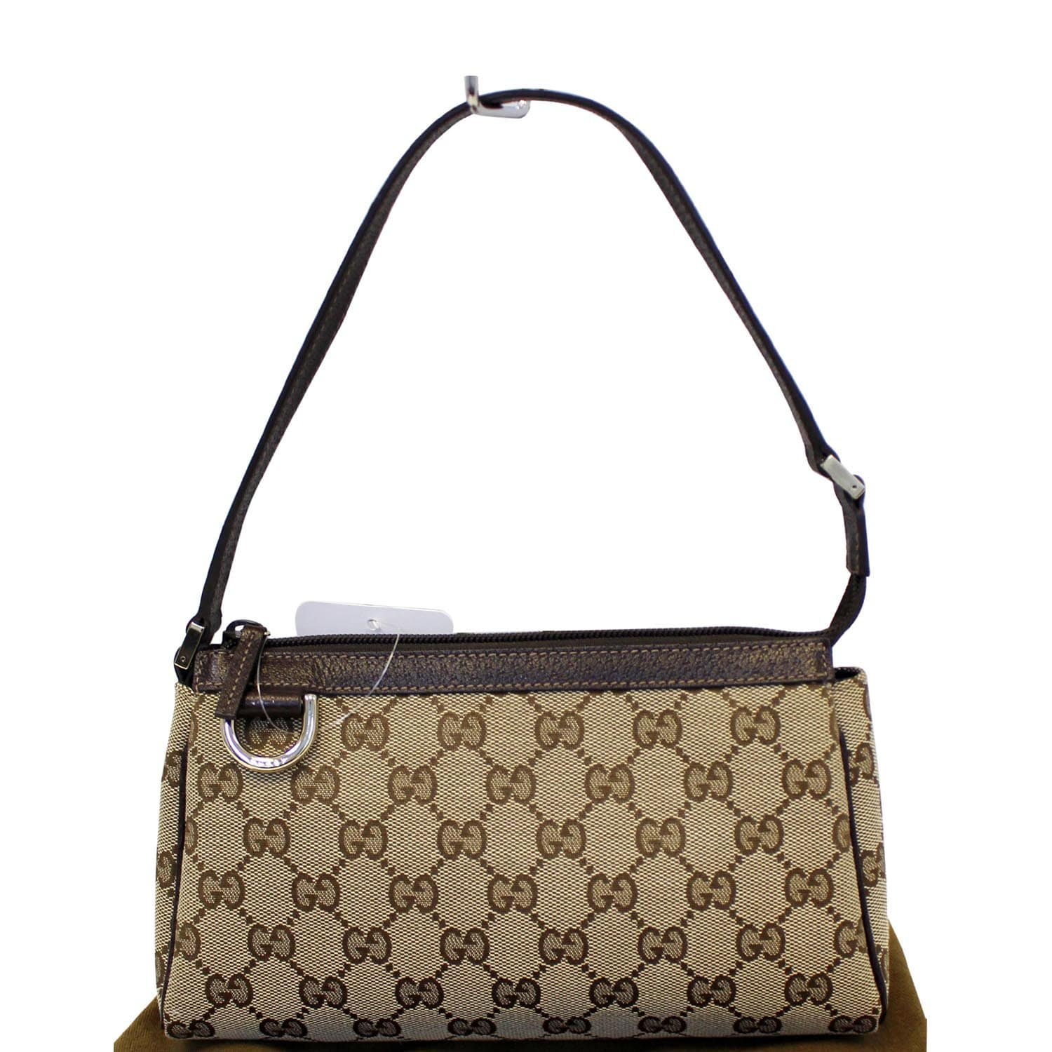 Gucci Beige/Ebony GG Canvas Abbey D Ring Pochette Bag is perfect for carrying at night or day when you feel like traveling light. It features durable GG canvas with brown leather trim and a small goldtone D-ring.