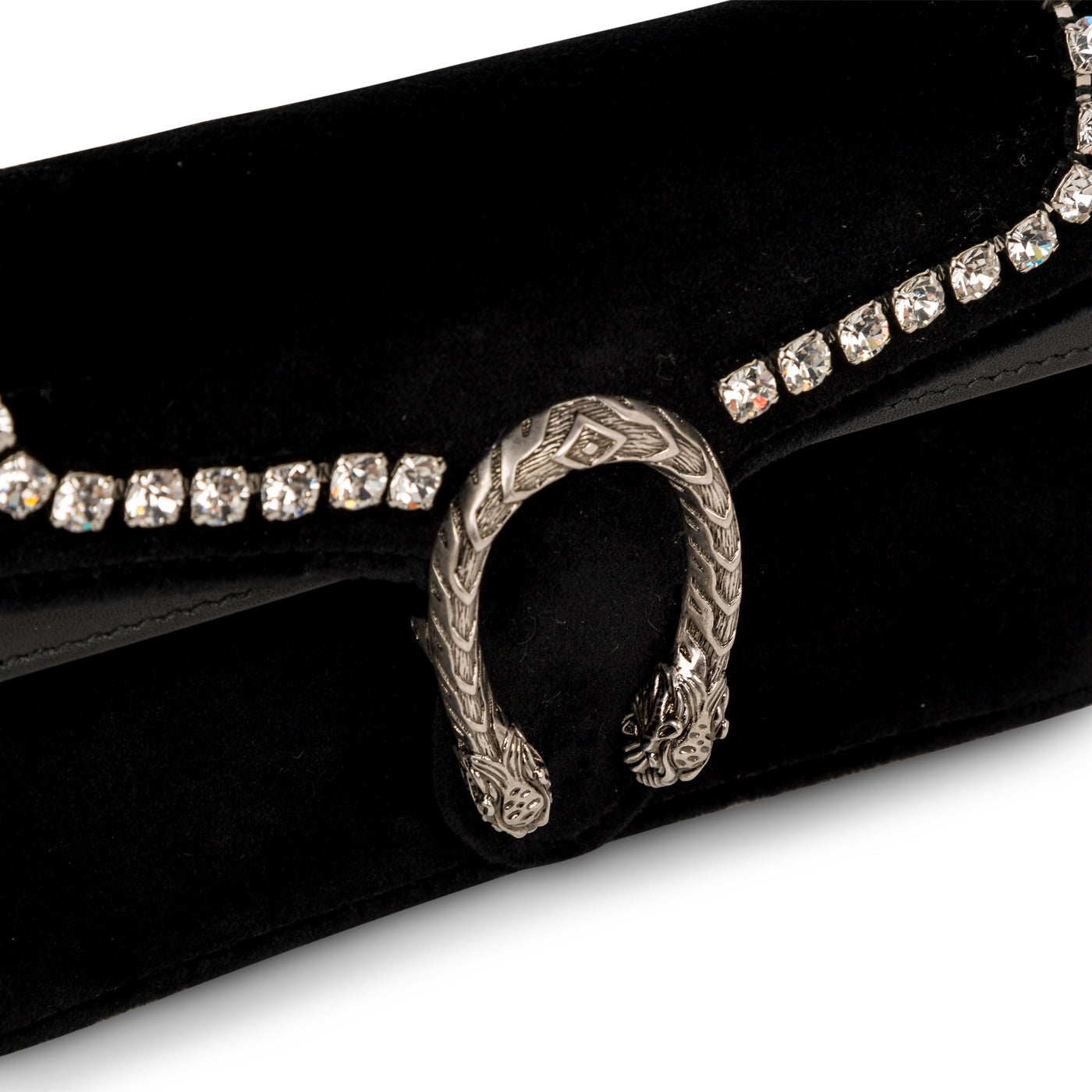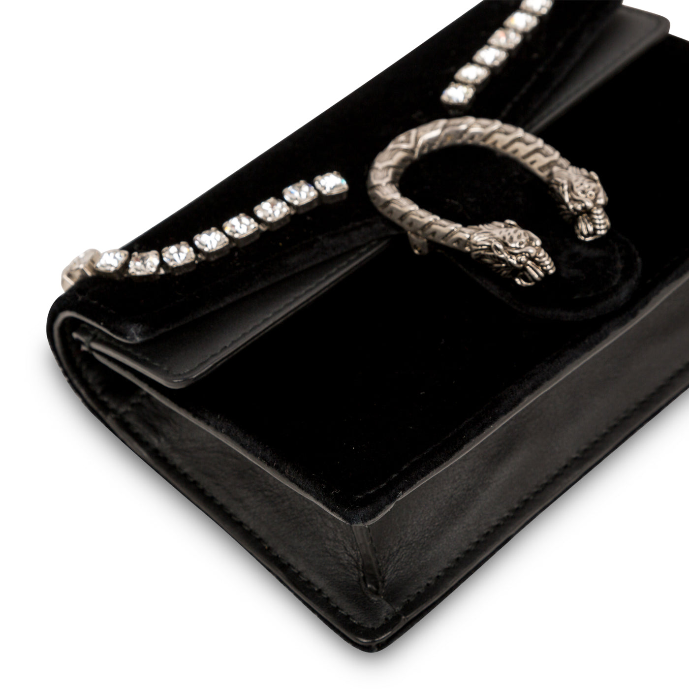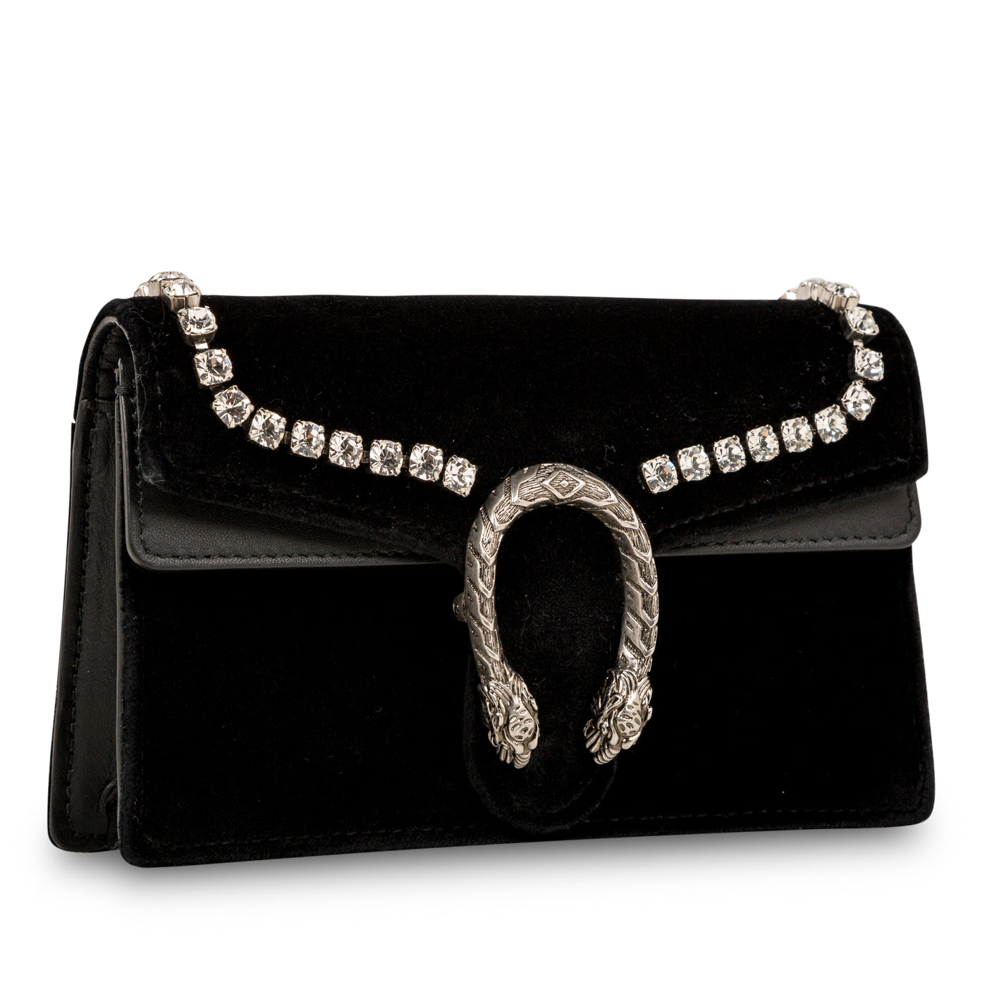Inspired by the Greak God of wine and celebration, Dionysus. The Dionysus collection by Gucci are perfect bags to take out for special occasions. Decorated with crystal detailing and rich black velvet exteriorand the unique tiger head spur closure – exclusive to the Dionysus collection. This mini bag comes with a key chain to attach any accessory or any bag. The shoulder chain has a drop of 60 cm, perfect for cross body and over the shoulder use. Style this bag with a Gucci T shirt and jeans for a casual look, or a dark shaded dress and heels for evening wear and partying.