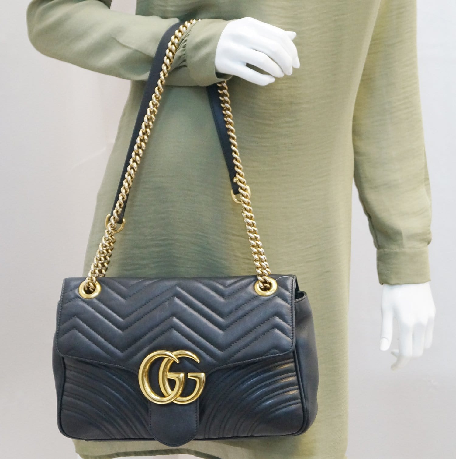 GUCCI Black Leather GG Marmont Matelasse Shoulder Bag