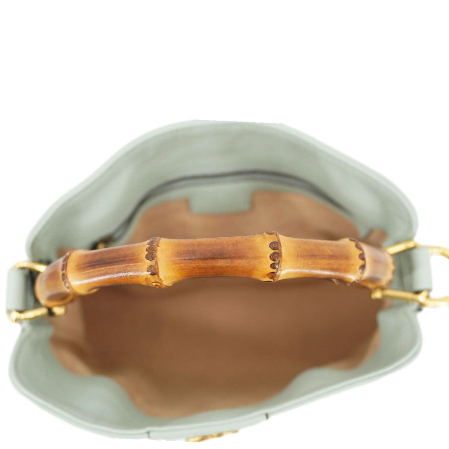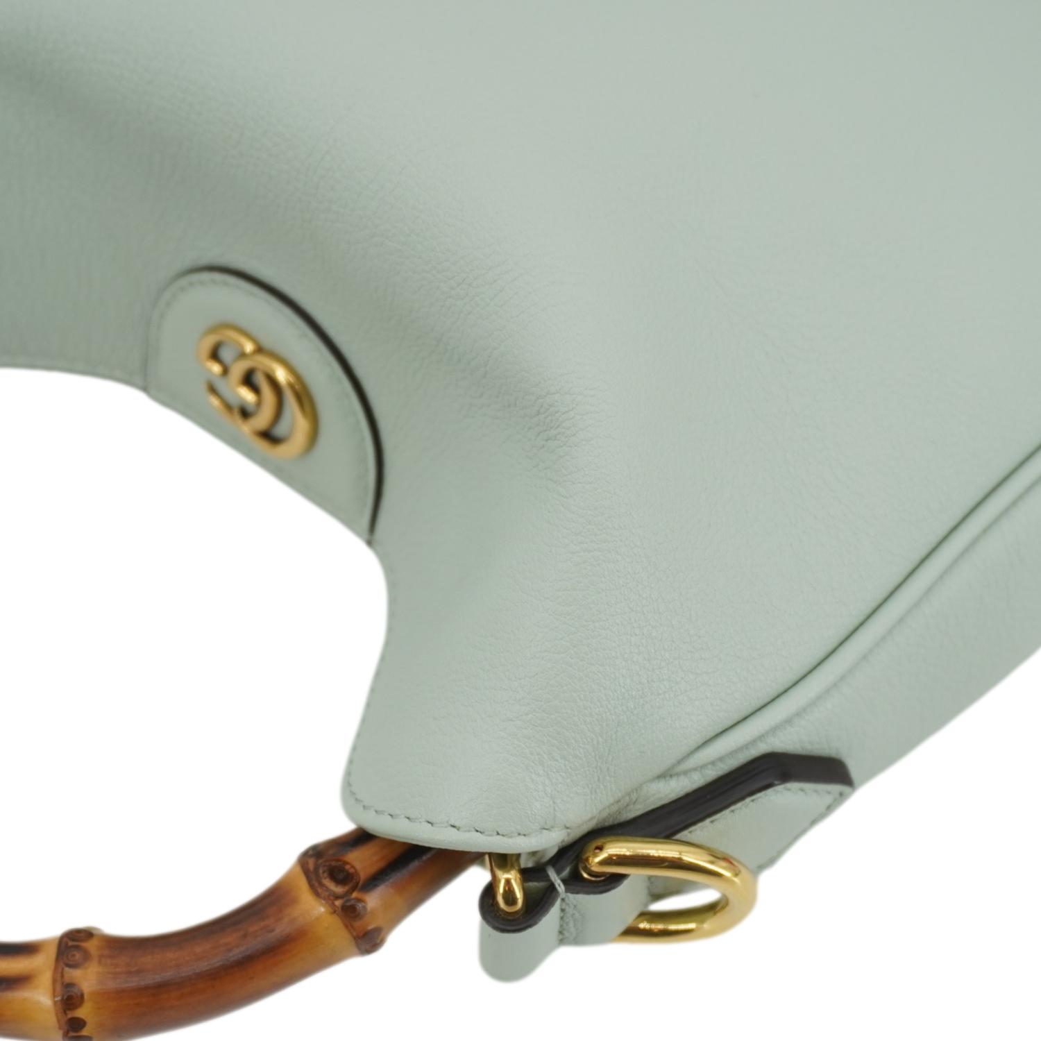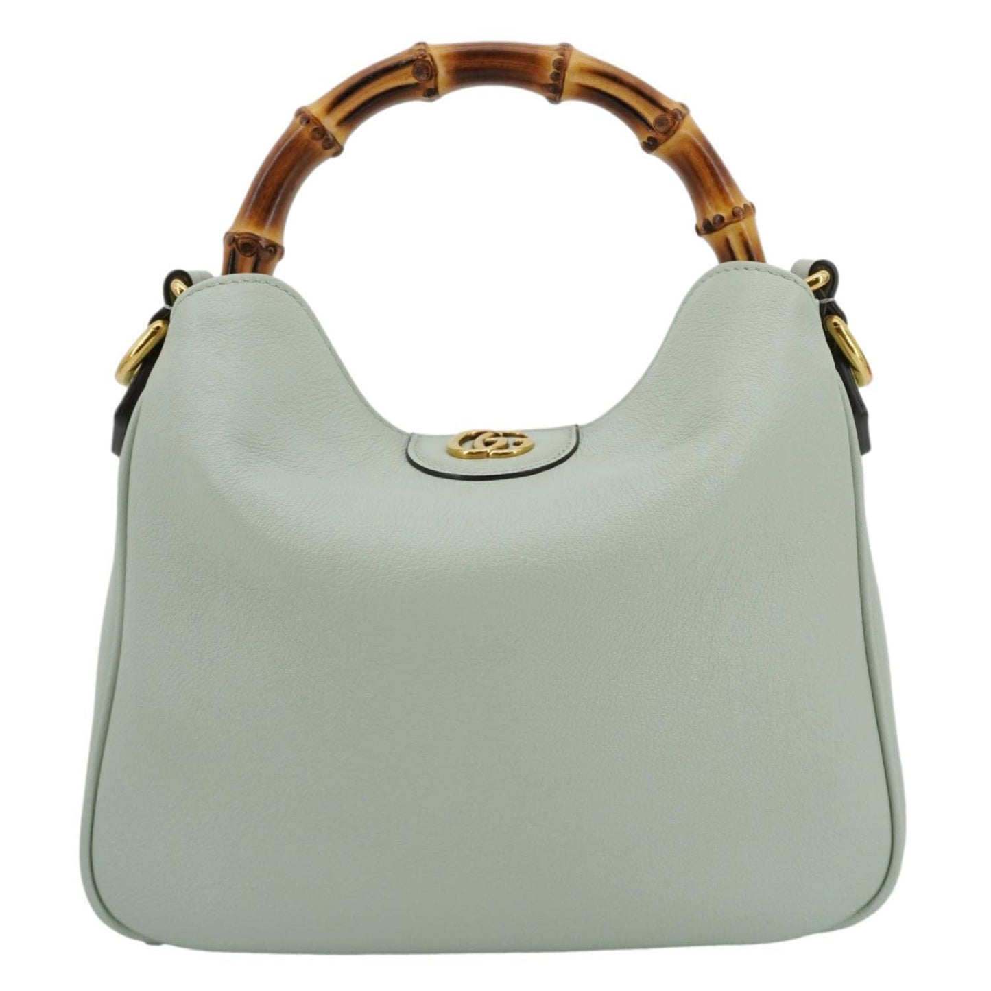 The Gucci Diana Small Leather Bag in Pale Green features a signature bamboo top handle, blending timeless elegance with modern sophistication. Crafted from luxurious leather, it’s a chic statement piece for any wardrobe.