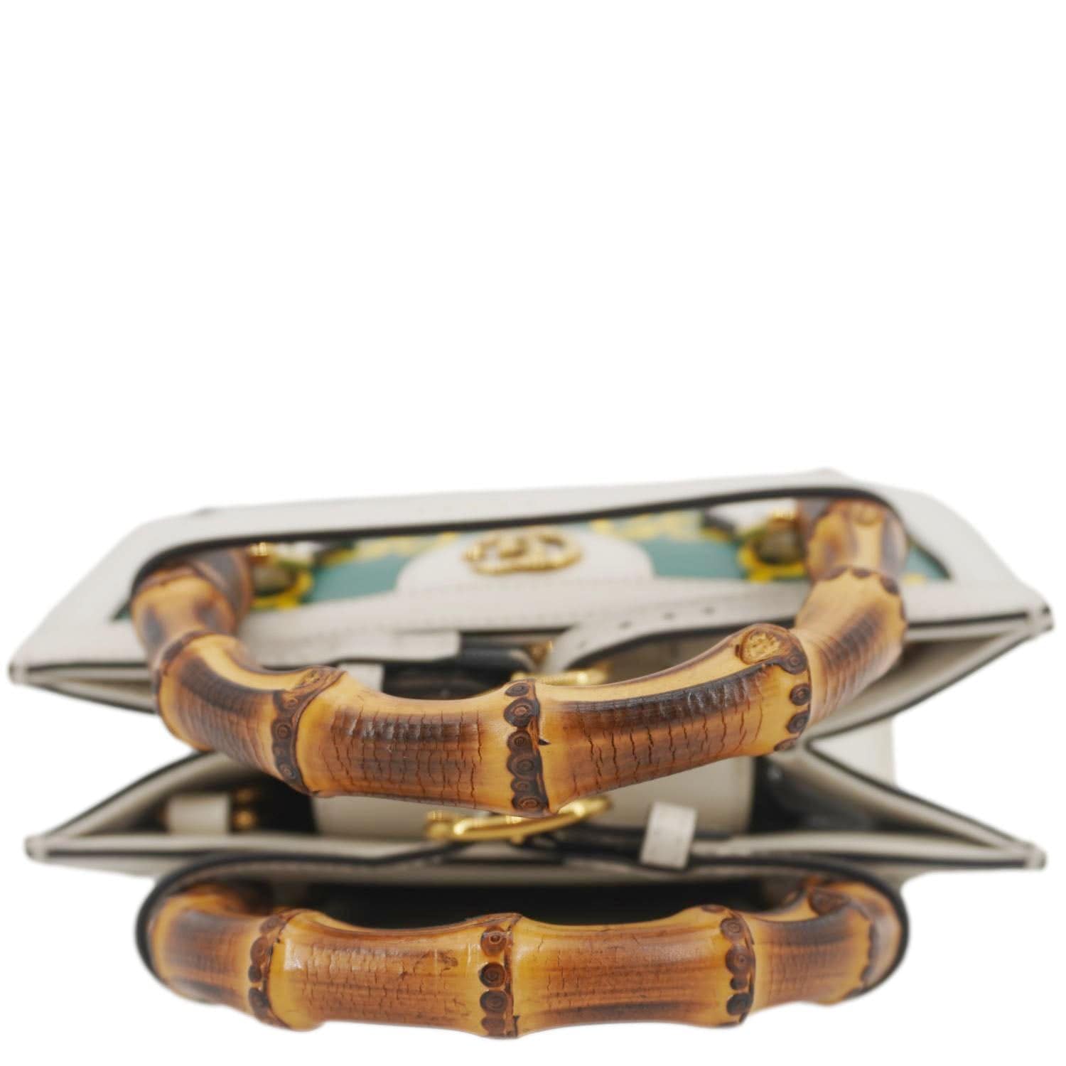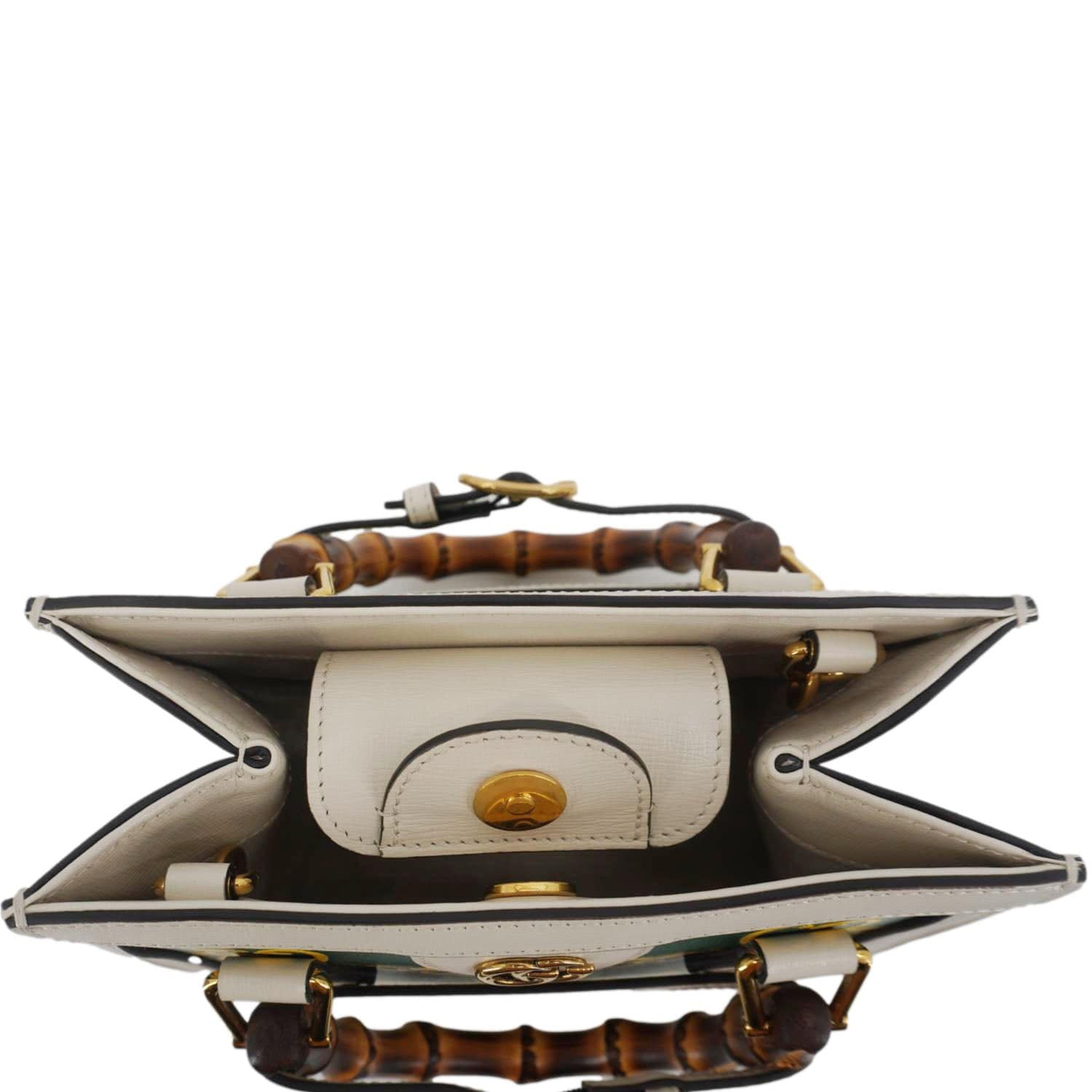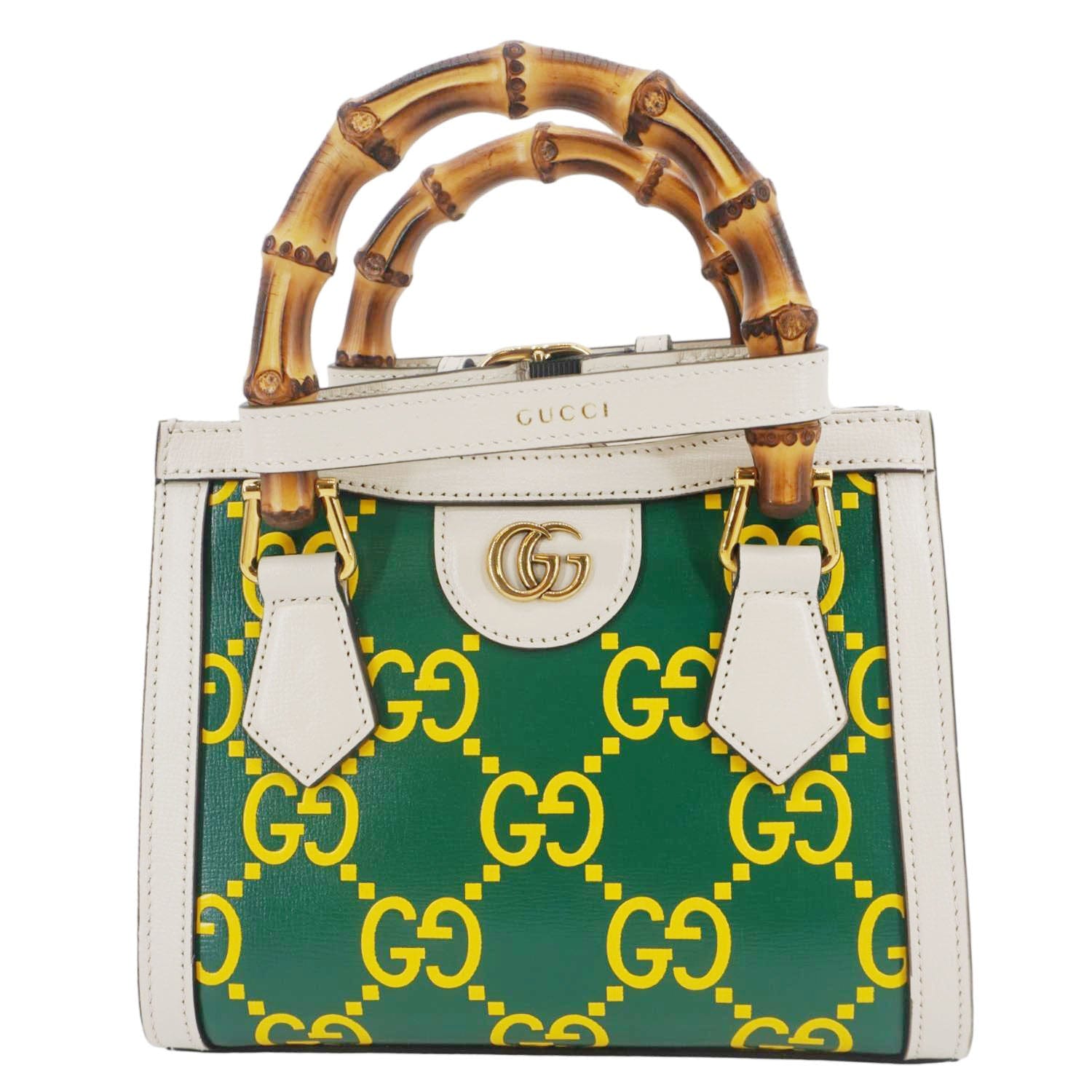 The Gucci Diana Mini Tote Bag in green GG monogram calfskin leather is a chic blend of heritage and modern design. Its bamboo handles add a signature touch of elegance.