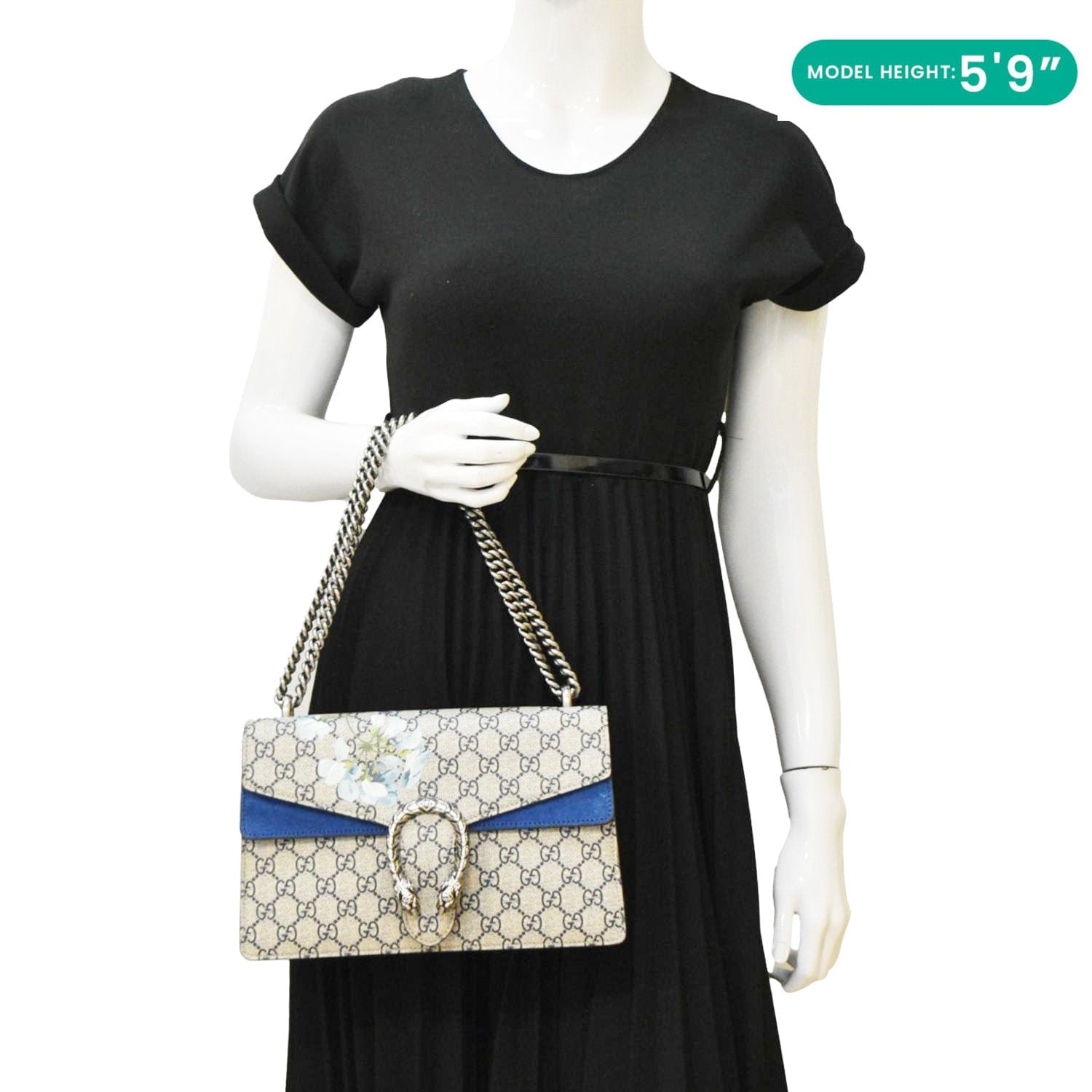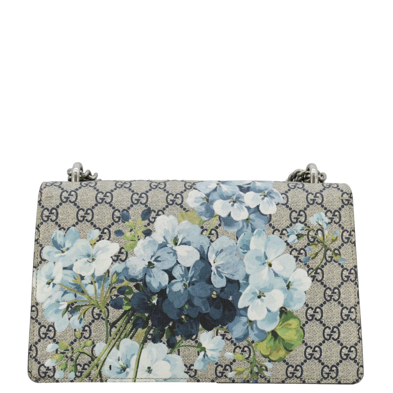 The Gucci Dionysus Blooms Shoulder Bag in beige GG Supreme canvas features a floral print and the iconic tiger head closure. Its structured design, adjustable chain strap, and elegant details make it a standout piece for day or evening wear.