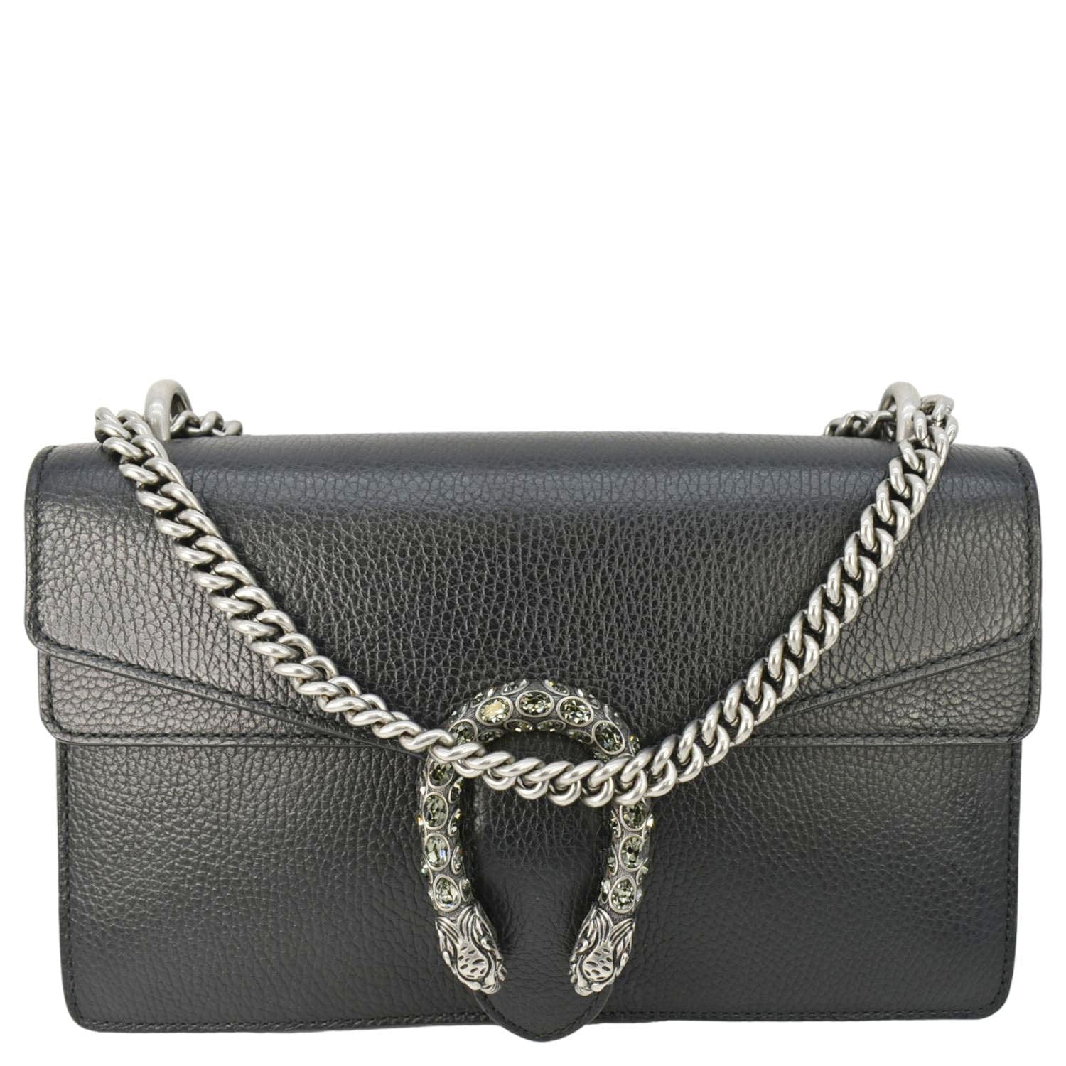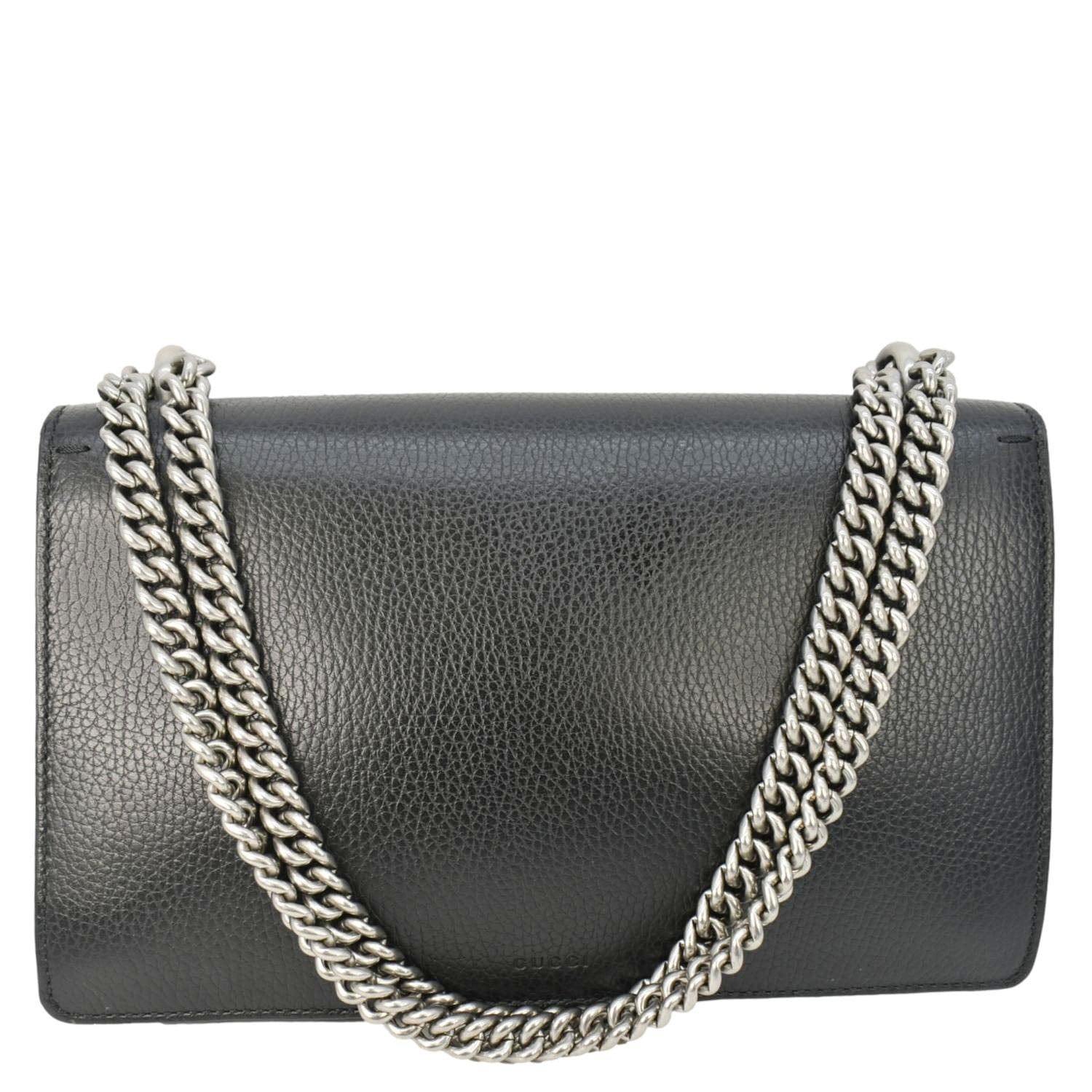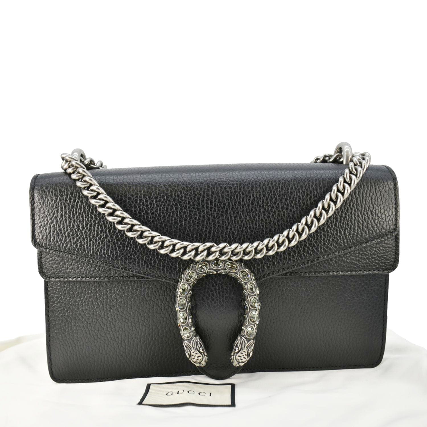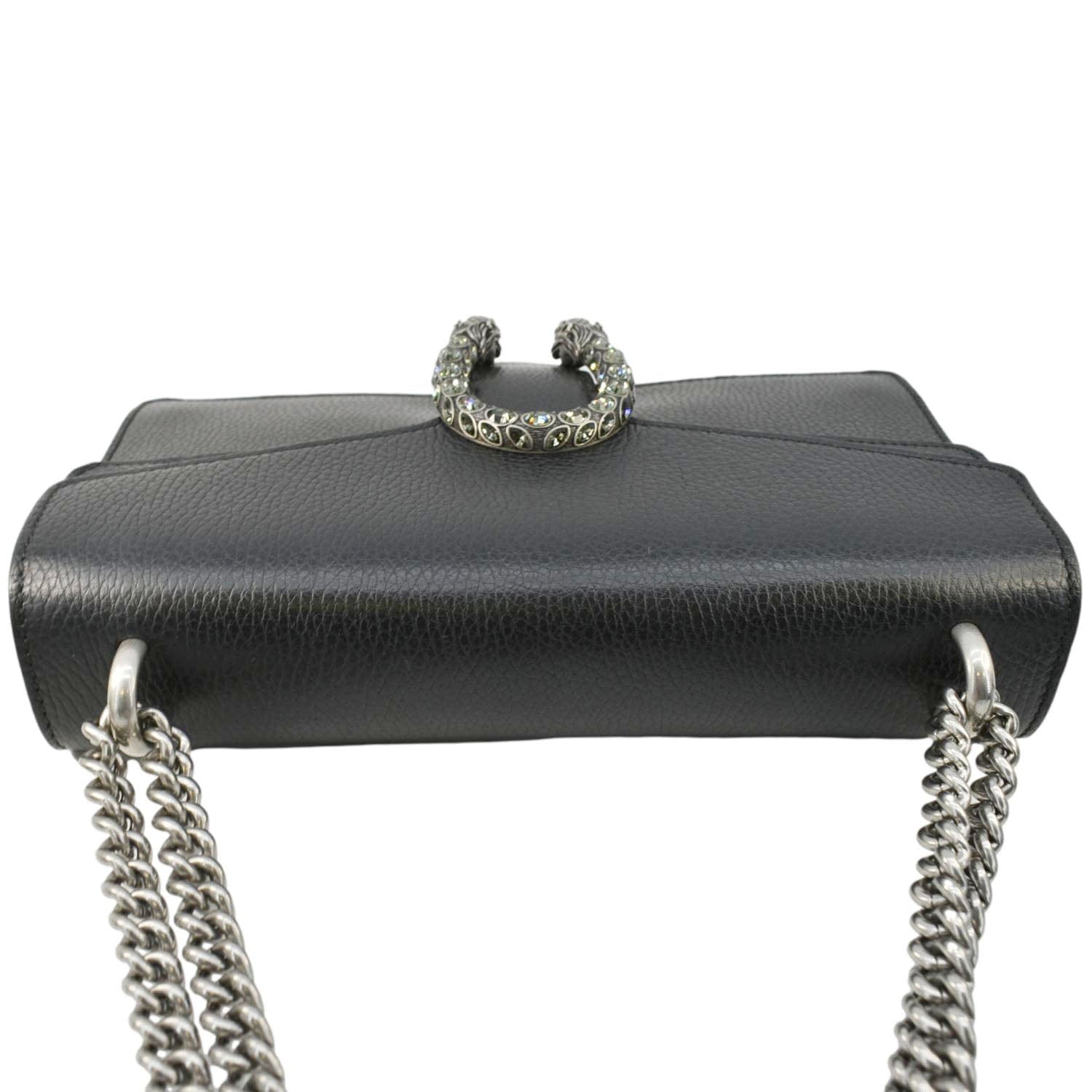 The GUCCI Dionysus Small Leather Shoulder Bag in black features textured leather with the iconic double tiger head closure. Its sleek design and sliding chain strap offer versatile elegance for any occasion.