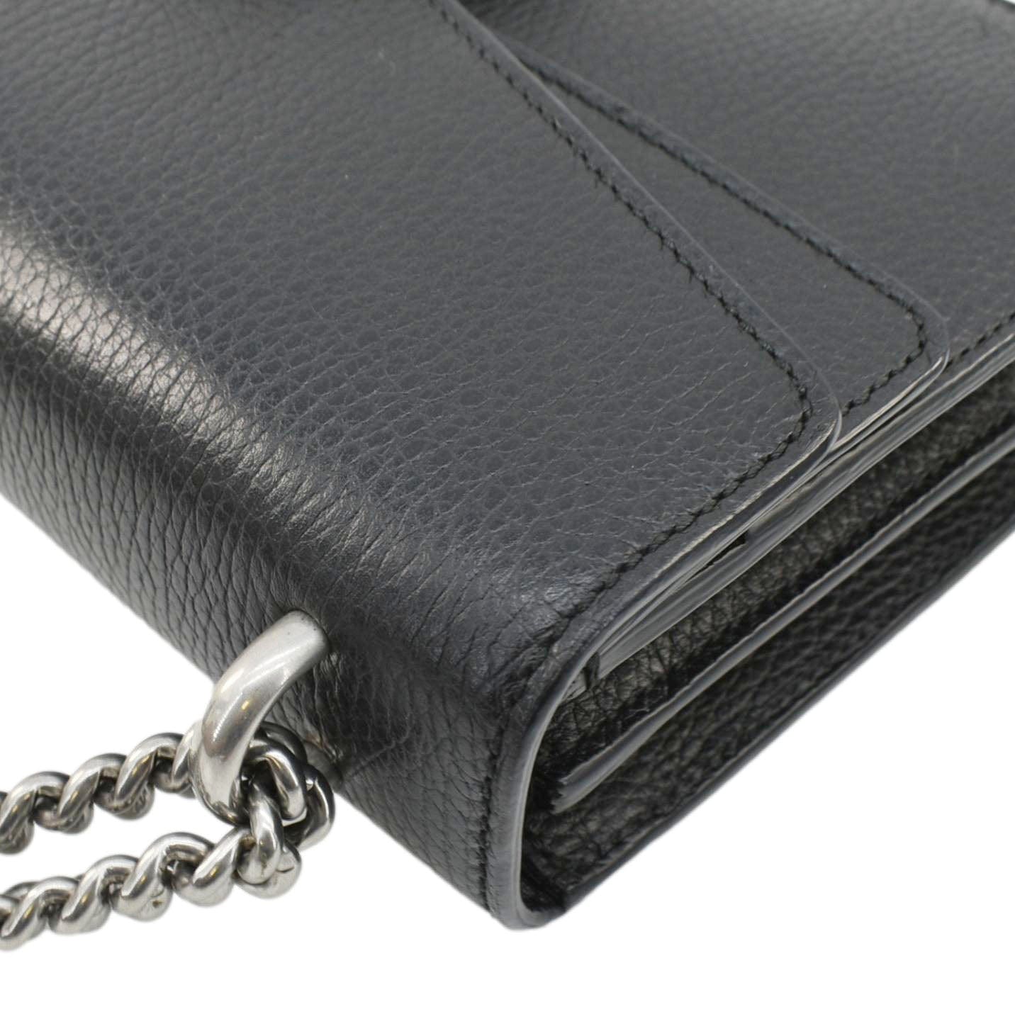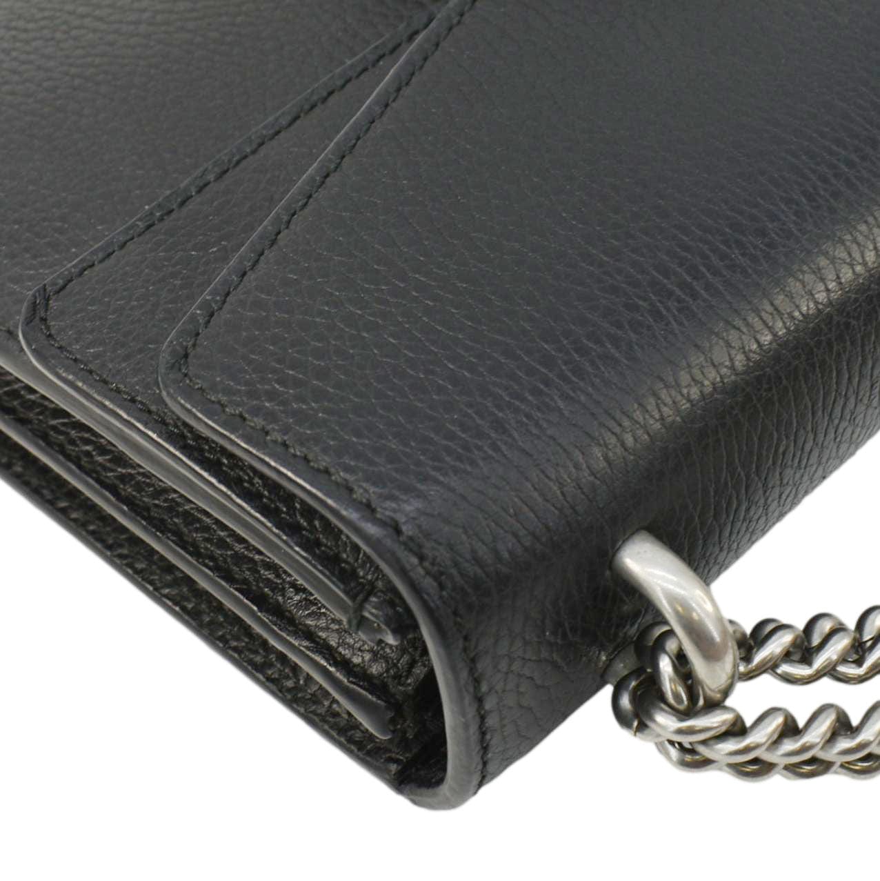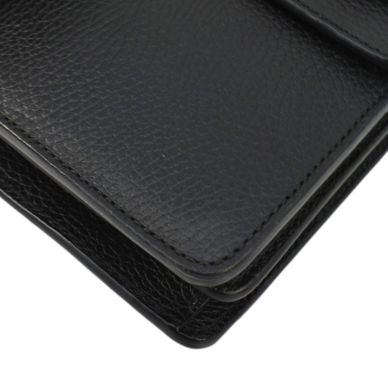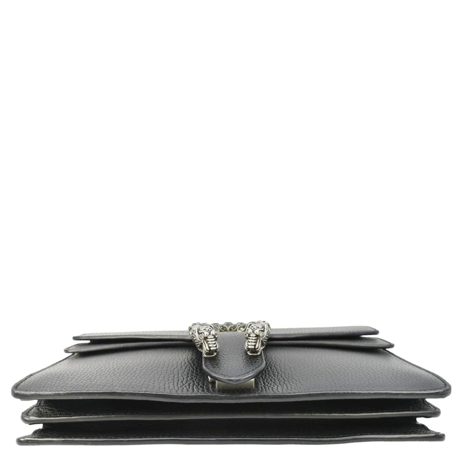 The GUCCI Dionysus Small Leather Shoulder Bag in black features textured leather with the iconic double tiger head closure. Its sleek design and sliding chain strap offer versatile elegance for any occasion.