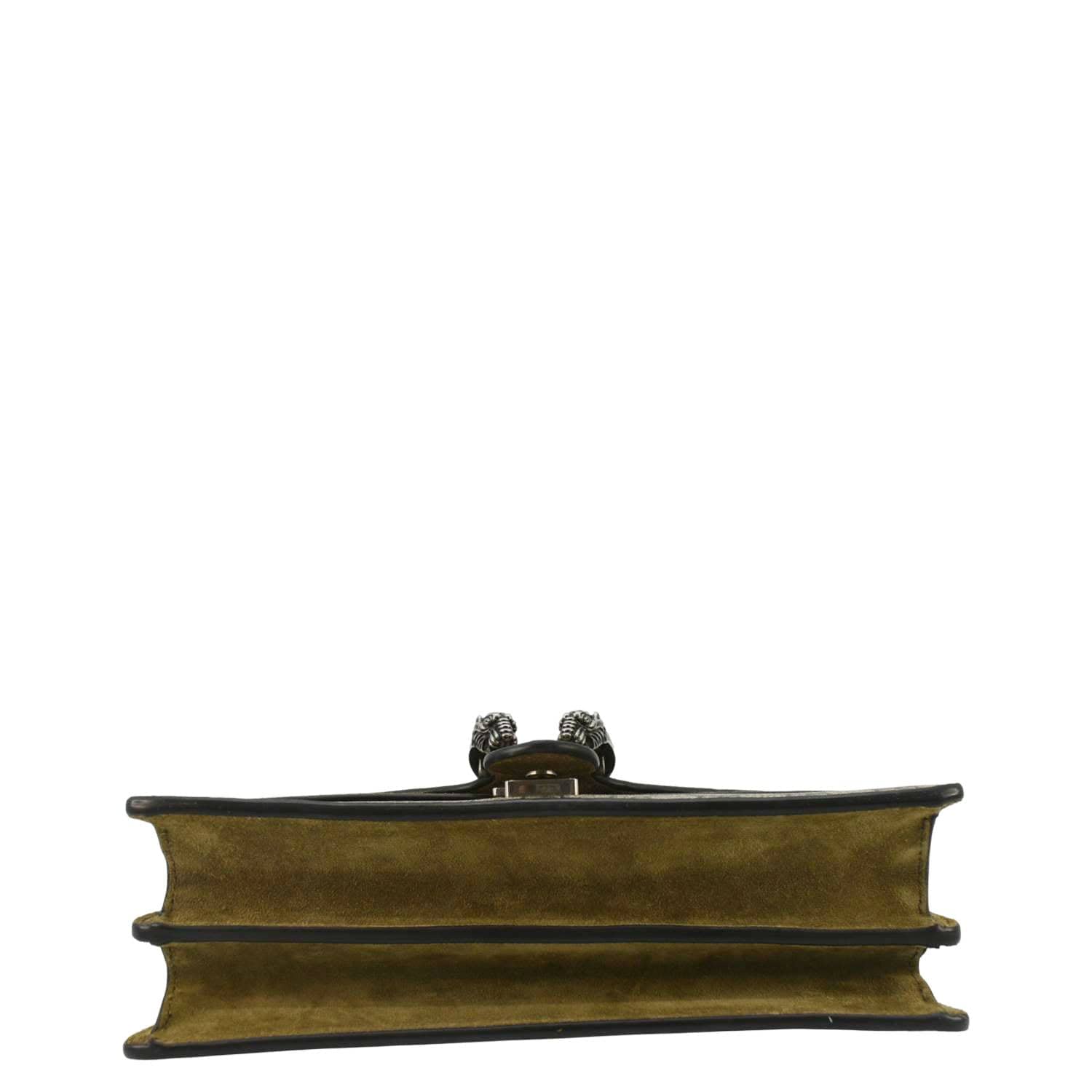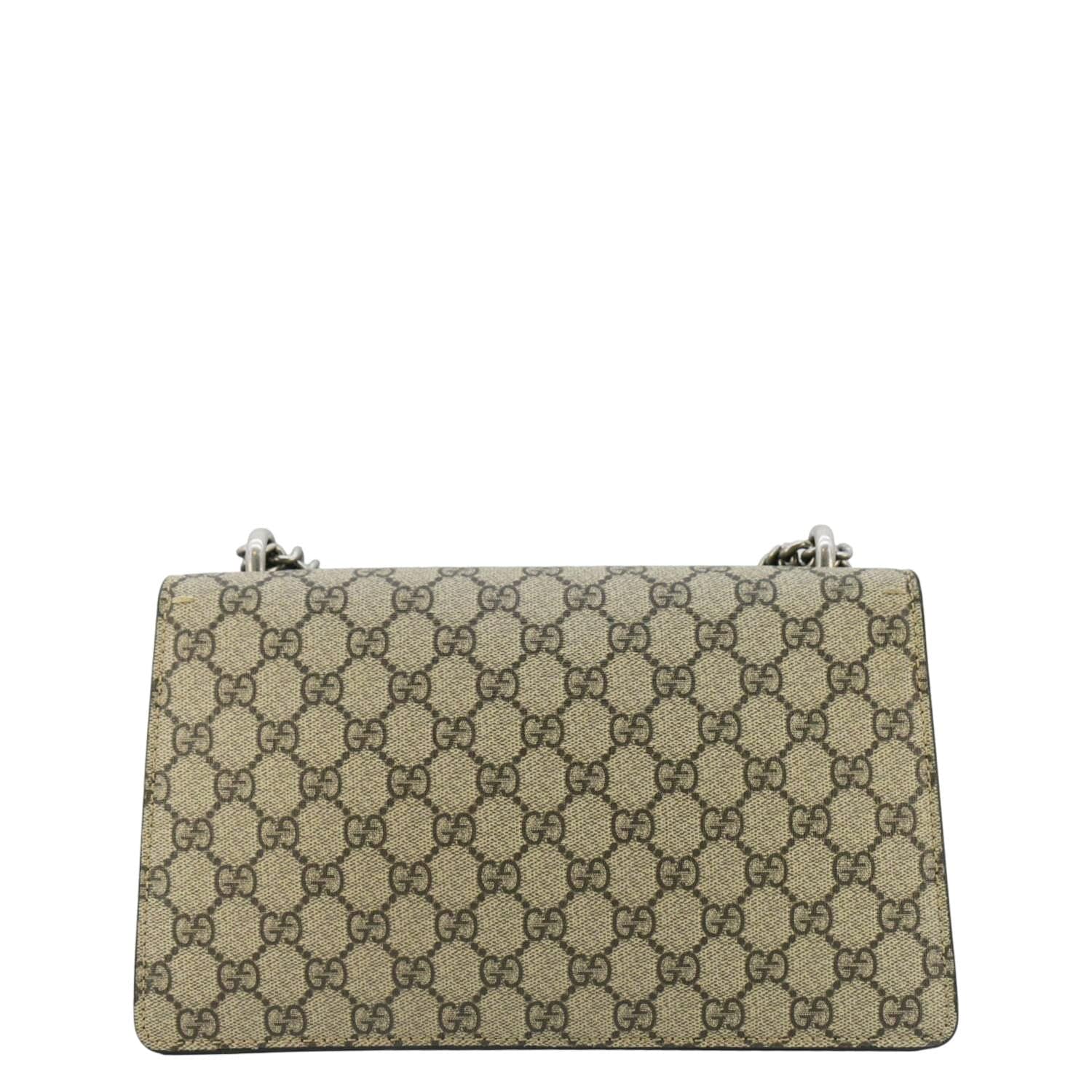 The GUCCI Dionysus Small Shoulder Bag in GG Supreme Canvas is a beige-toned classic, featuring the signature GG pattern and an antiqued silver-tone tiger head closure. Its compact size and elegant chain strap make it a sophisticated choice for both day and evening wear.