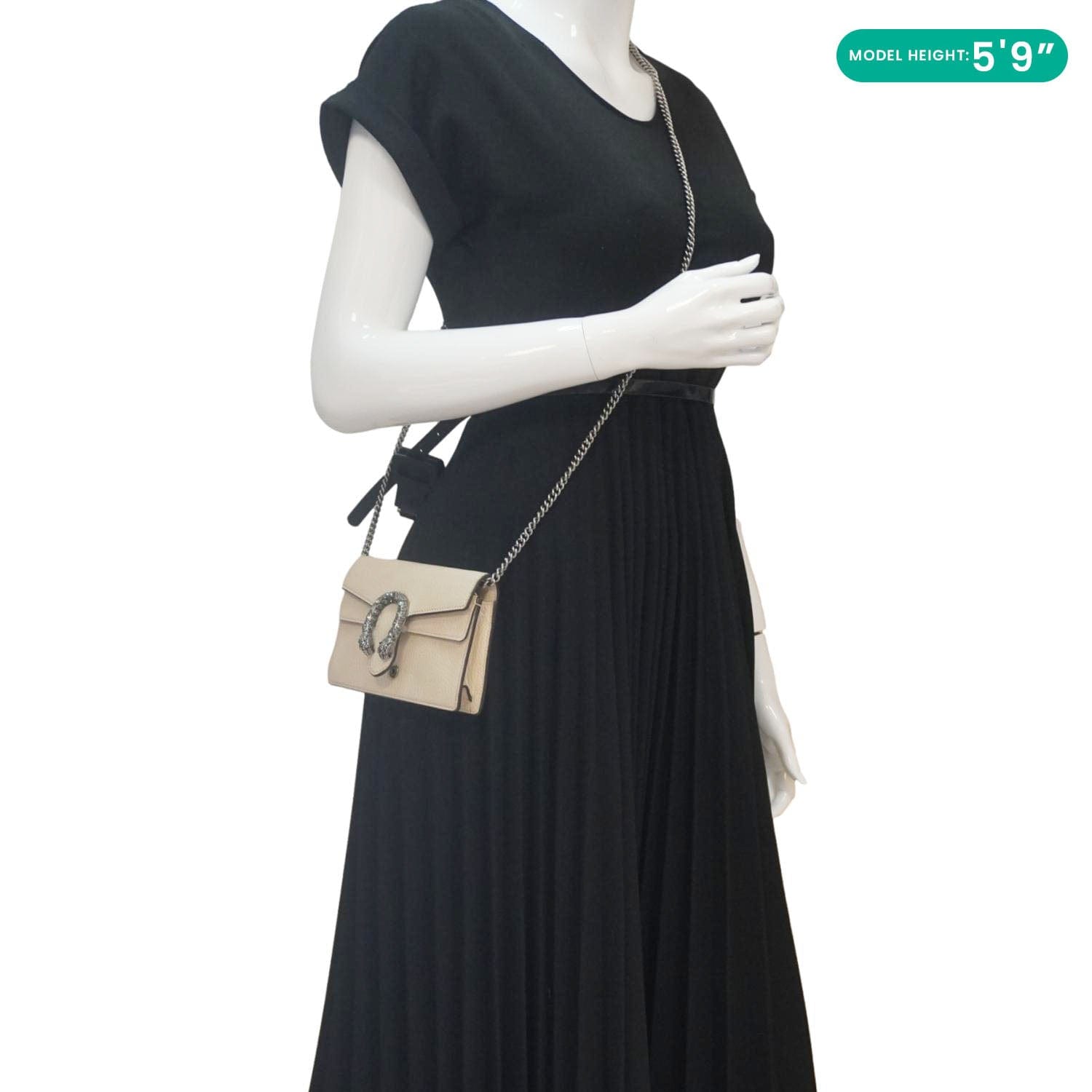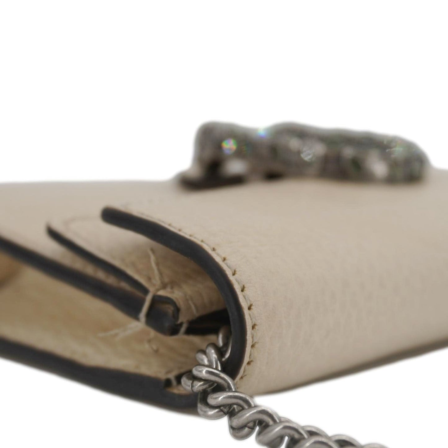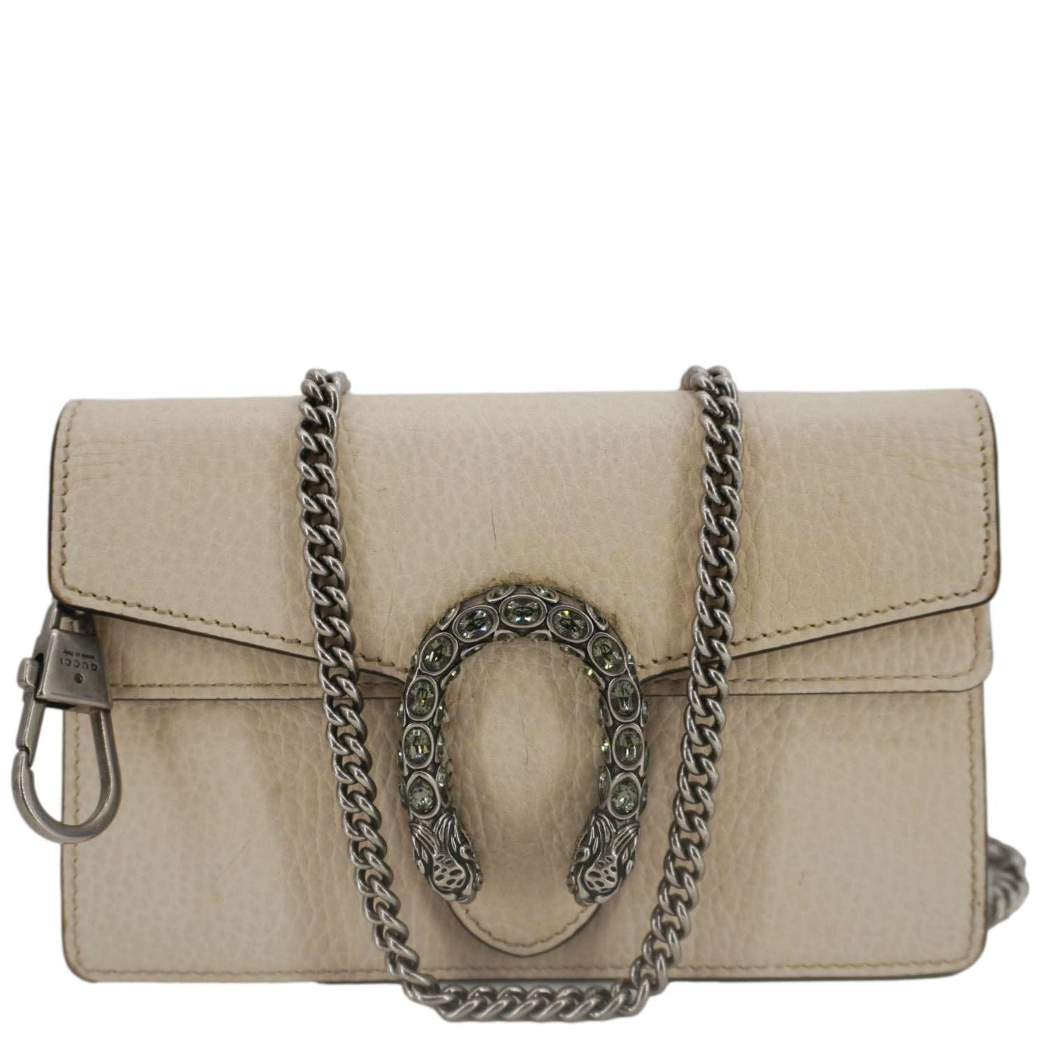 The Gucci Dionysus Super Mini Crossbody Bag in off-white leather exudes elegance with its compact design and signature tiger head closure. Perfect for carrying essentials, it’s a chic choice for any occasion.