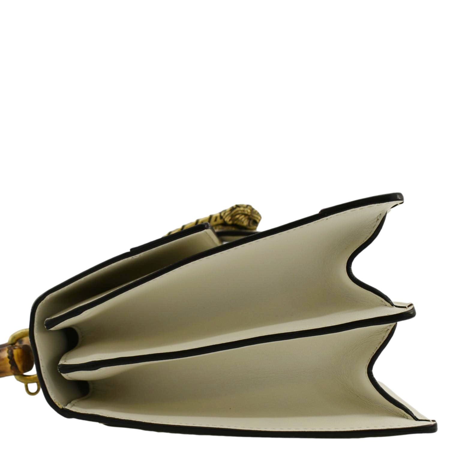 The Gucci Dionysus Bamboo Medium is a versatile white leather bag with a distinctive bamboo handle and gold-toned hardware. Its elegant design is complemented by the iconic tiger head closure and a spacious interior.