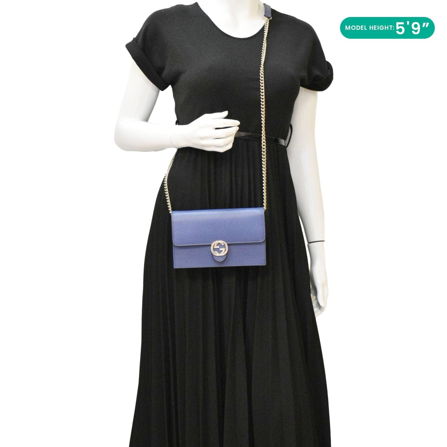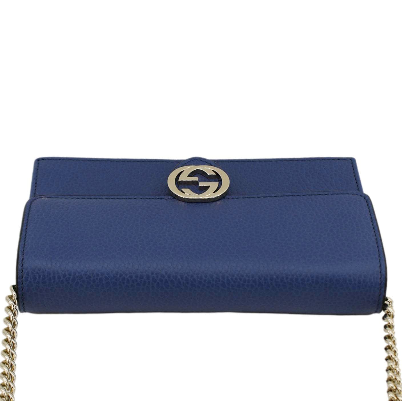 The Gucci Dollar Interlocking G Chain Wallet Crossbody Bag in blue calfskin leather features a sleek design with the iconic interlocking G logo. Its compact size, luxurious leather, and chain strap offer both elegance and practicality, perfect for day-to-night use.