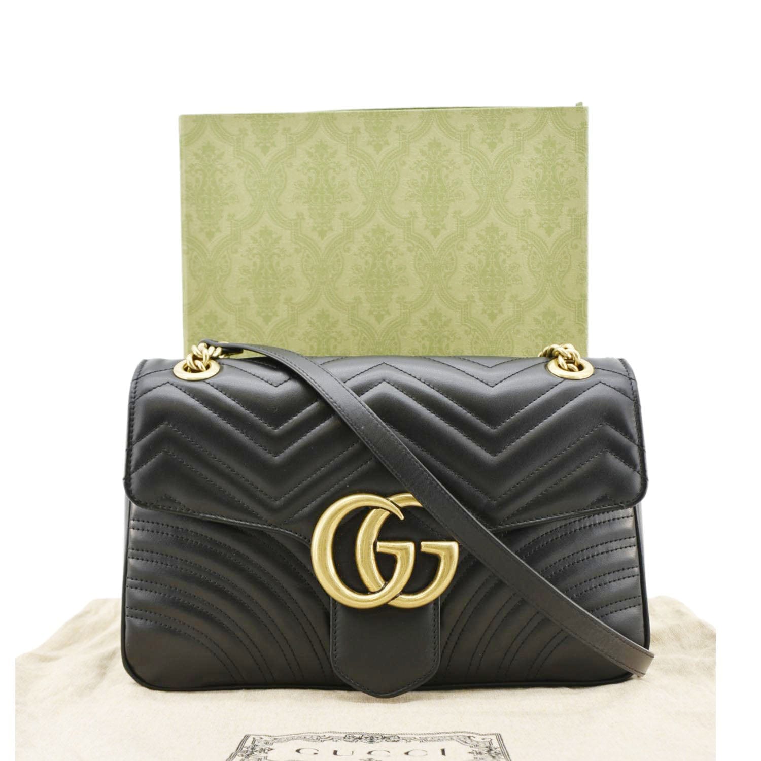 The GUCCI GG Marmont Medium Matelass� Shoulder Bag in black features quilted leather and the iconic double G logo in antique gold-tone hardware. Its soft, structured design offers versatility and sophistication, complete with an adjustable chain strap for various carrying options.