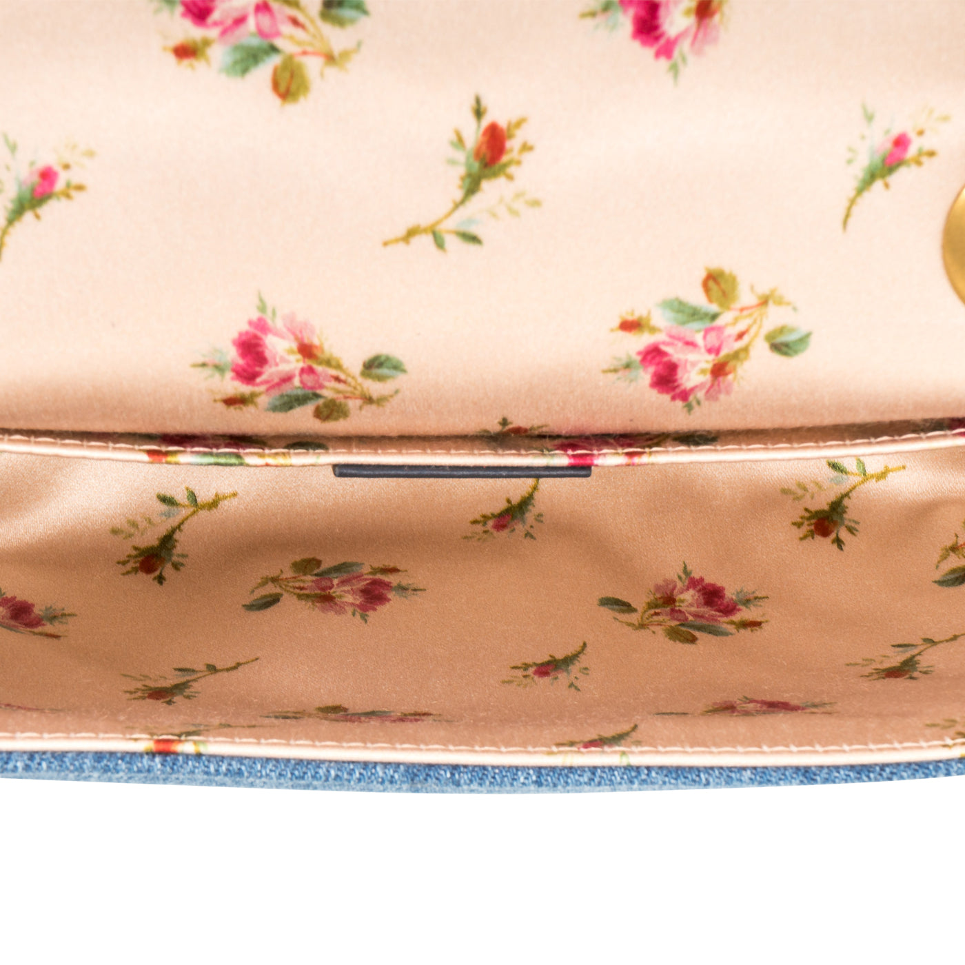 Gucci presents its highly-acclaimed GG Marmont Mini Bag�in light blue Denim print.�Crafted from the fashion house�s quintessential chevron quilted denim�and embroidery, this handbag also features an endearing heart-shaped stitching pattern on its rear.� The GG Marmont is also accented with antique gold hardware coupled with perfectly placed mini pearls, giving the handbag an air of sophistication. The bag�s oversized flap opens up to showcase a wonderfully floral patterend satin lining, presented in a single storage compartment.�