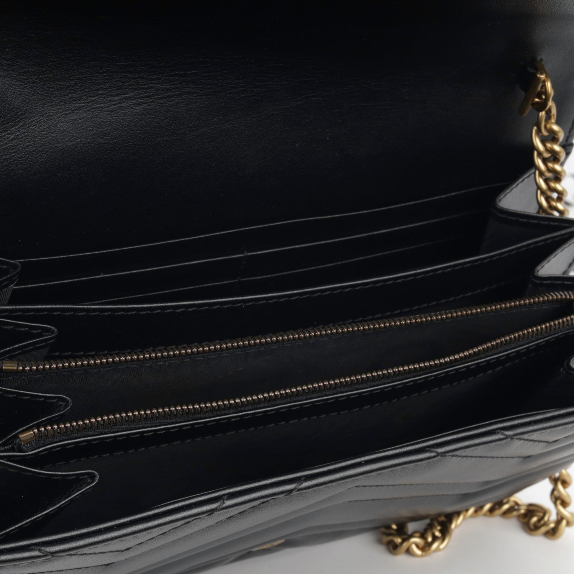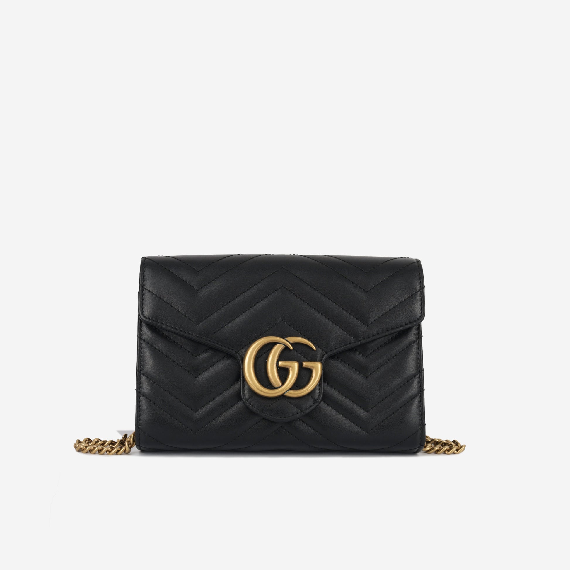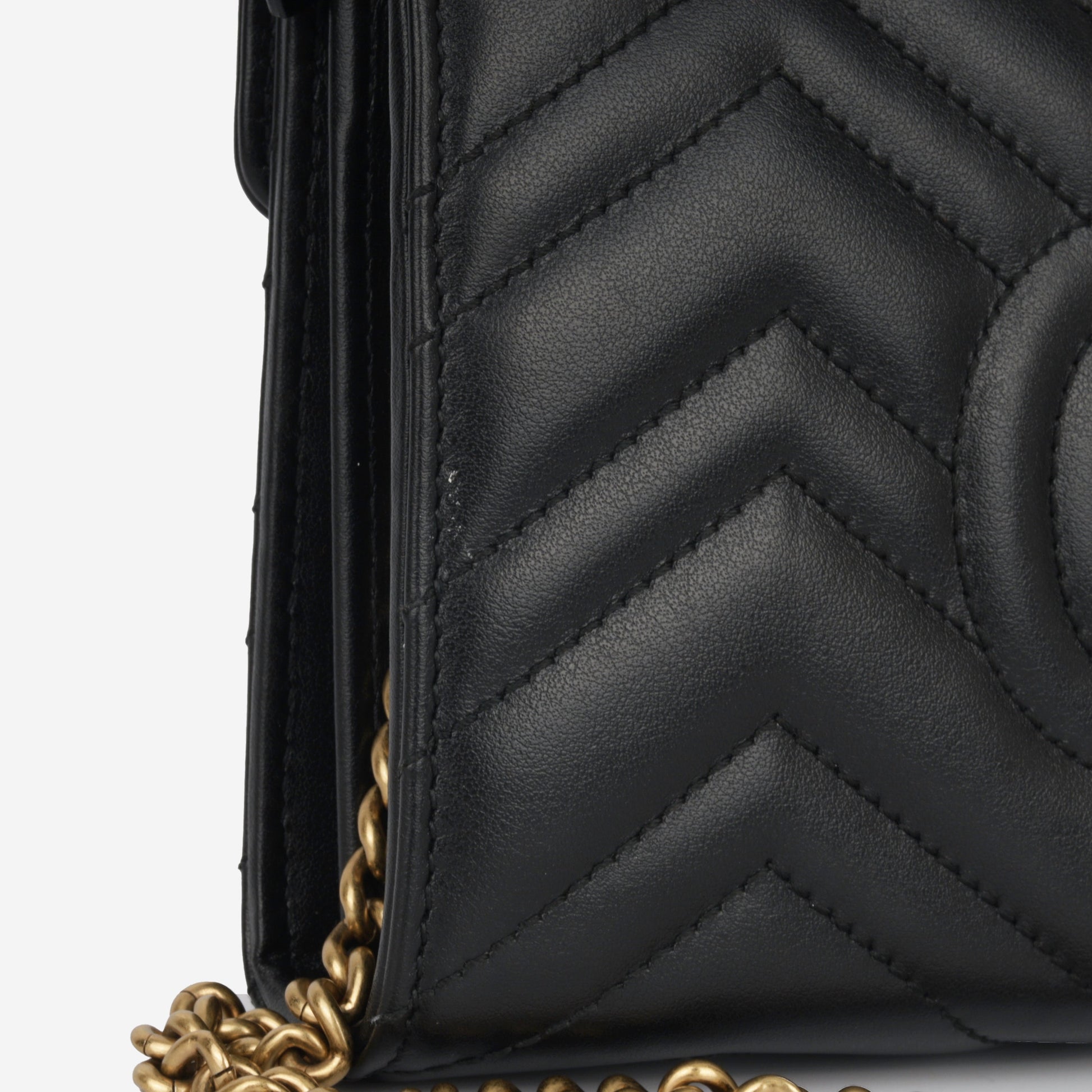 Introducing the Black GG Marmont Quilted Wallet on Chain: Where Style Meets Functionality. Immerse yourself in the world of elegance with this exquisite accessory. The iconic GG Marmont quilting, rendered in classic black, adds a touch of opulence to any ensemble. Transition seamlessly from day to night as this wallet on chain holds your essentials effortlessly. Elevate your look with the perfect blend of sophistication and convenience � the Black GG Marmont Quilted Wallet on Chain�