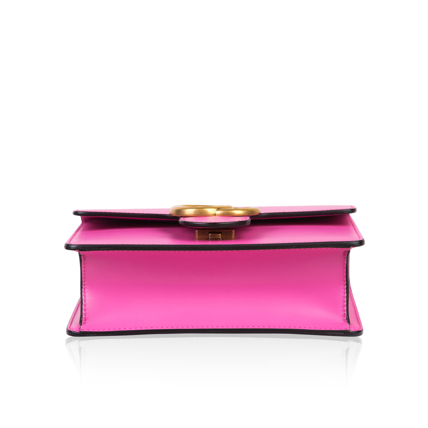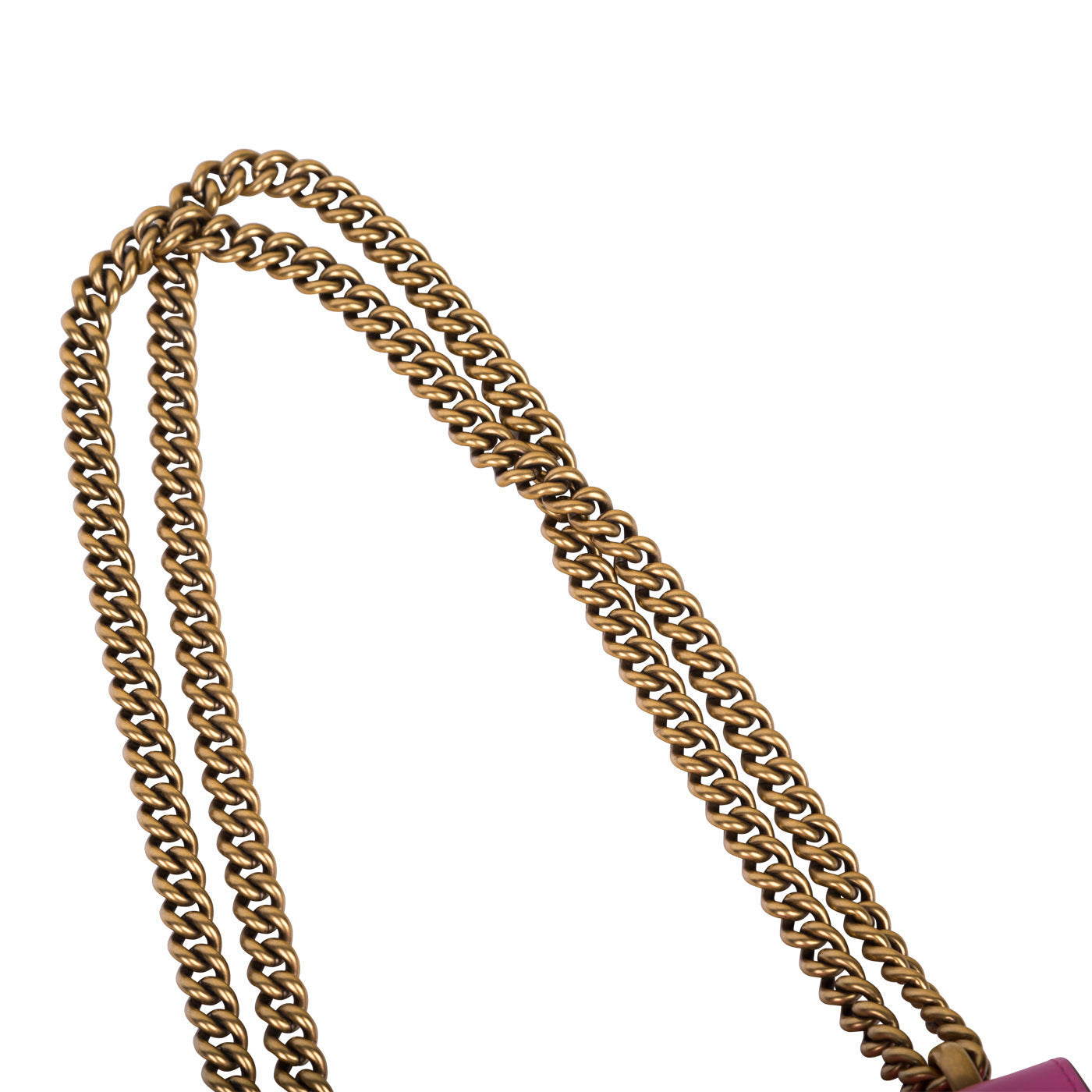 This gorgeous Gucci GG Mini Marmont is the perfect bag to add a pop of colour to your every day outfit. Wear it in multiple ways by doubling the chain up and swinging it over your shoulder or casually draping it across your body. Show off the bag's diversity by wearing it with jeans and a t-shirt or dress it up with a classic blouse and heels! With its oversized, signature GG front buckle and antiqued gold-tone chain to compliment the bright pink, smooth leather - you'll be sure to stand out in any crowd!