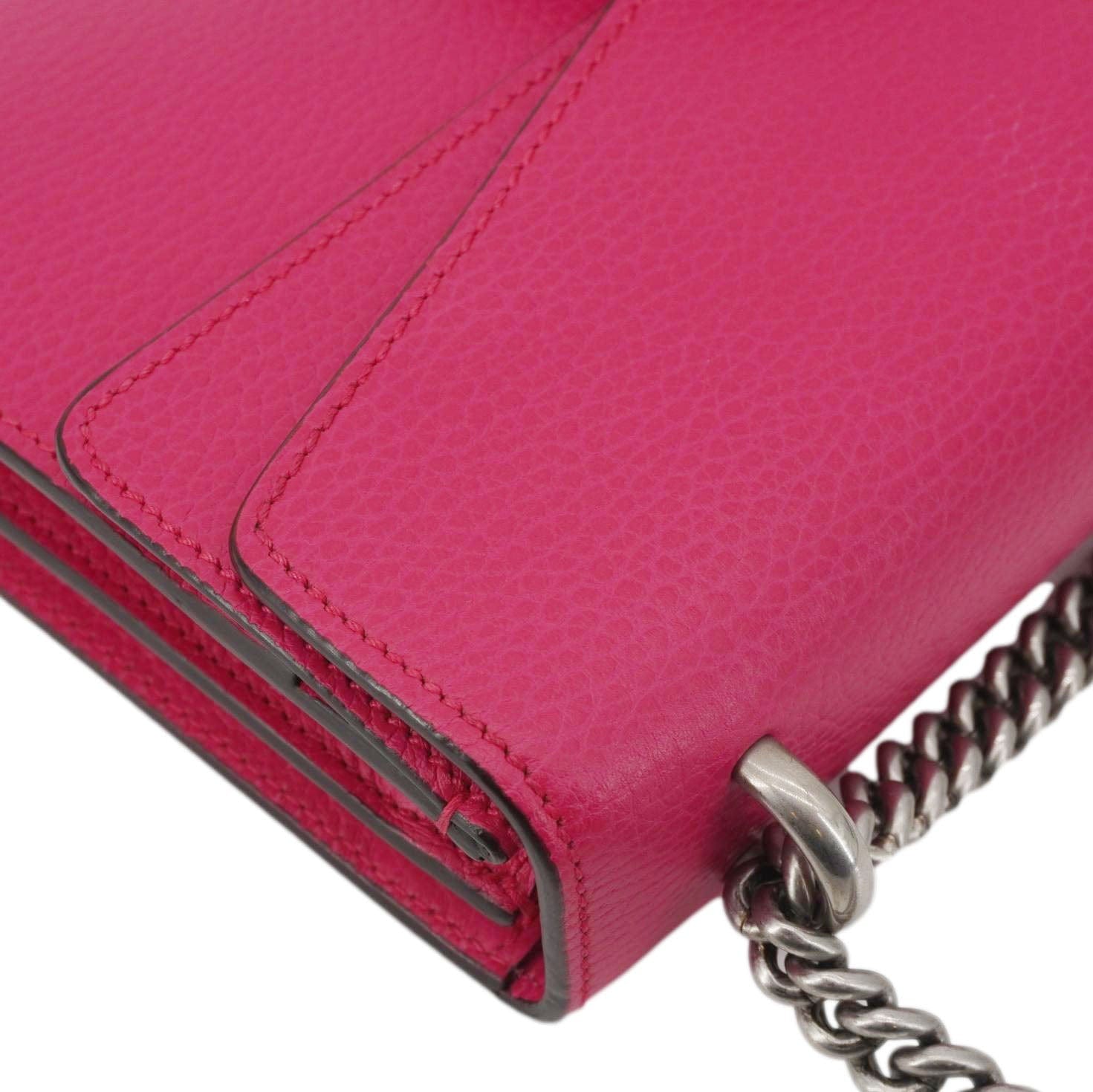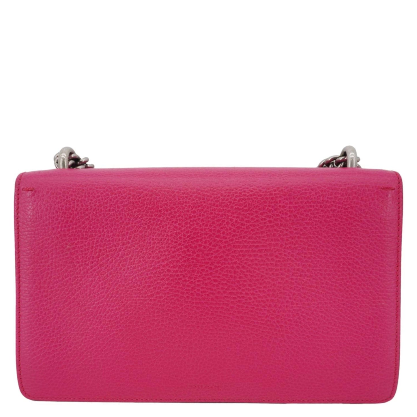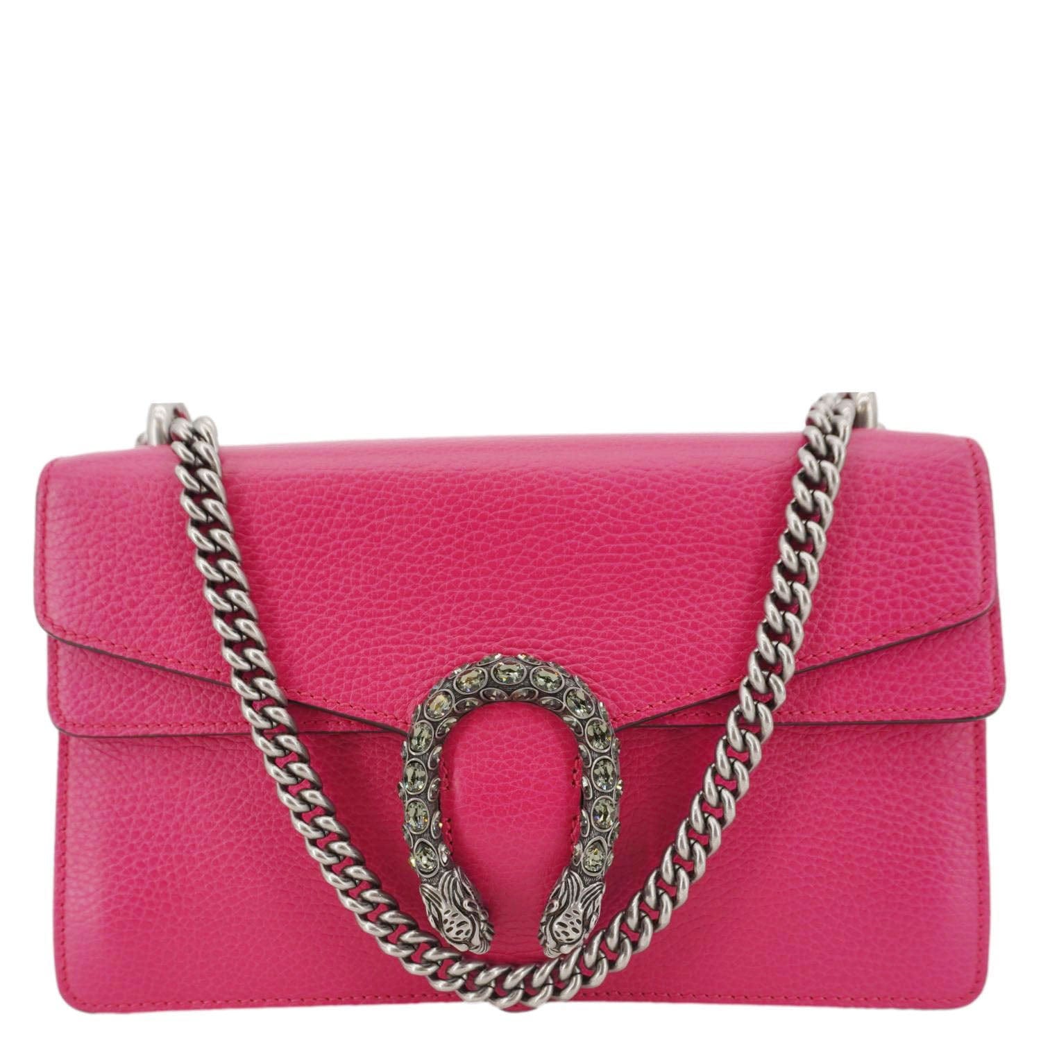 The GUCCI Dionysus Small in pink calfskin leather is a vibrant crossbody bag with the brand's iconic tiger-head closure. Its compact design and chain strap make it a perfect blend of boldness and elegance.