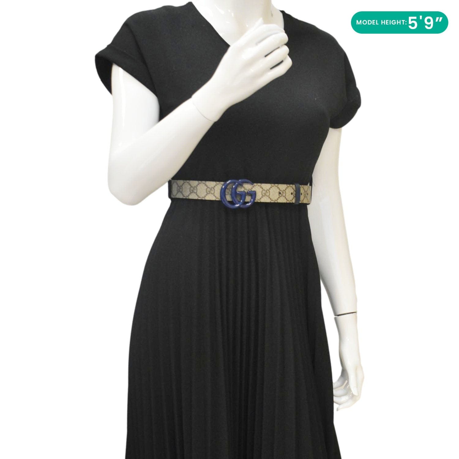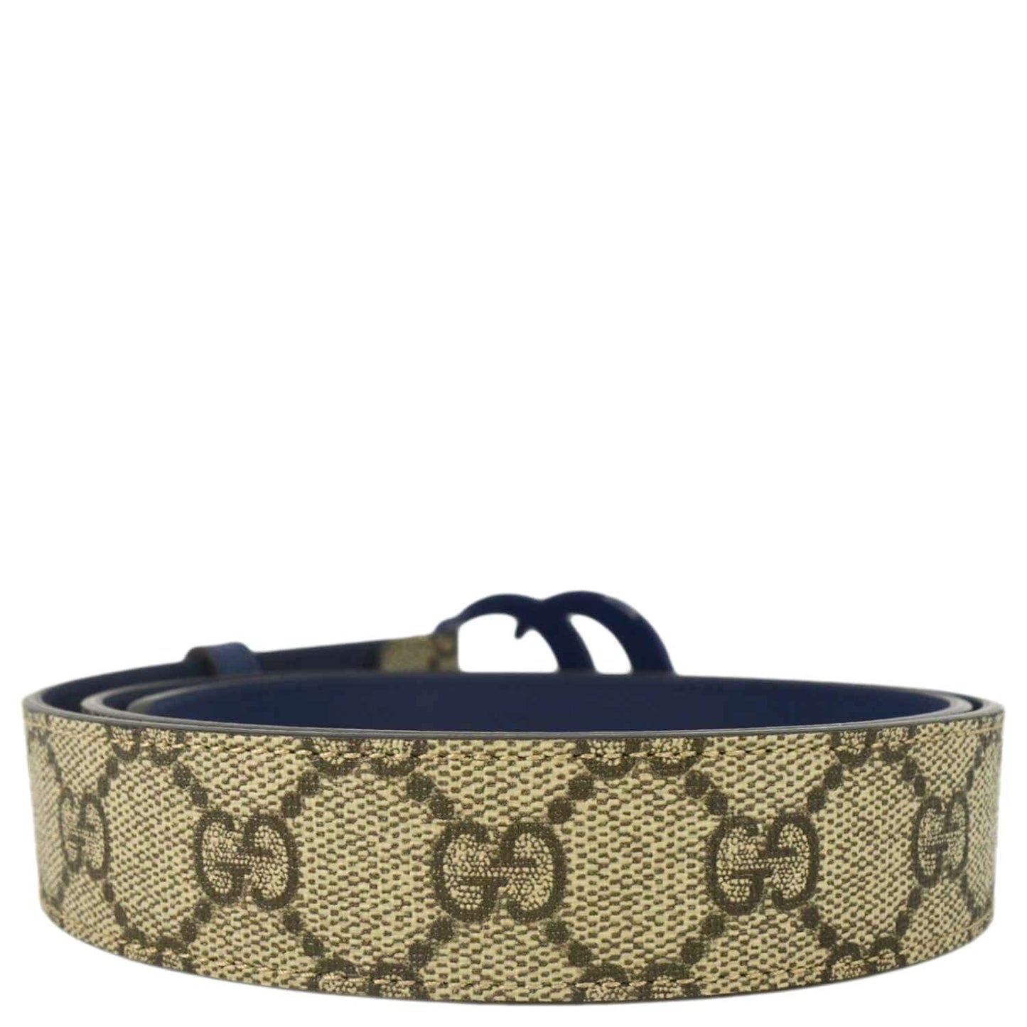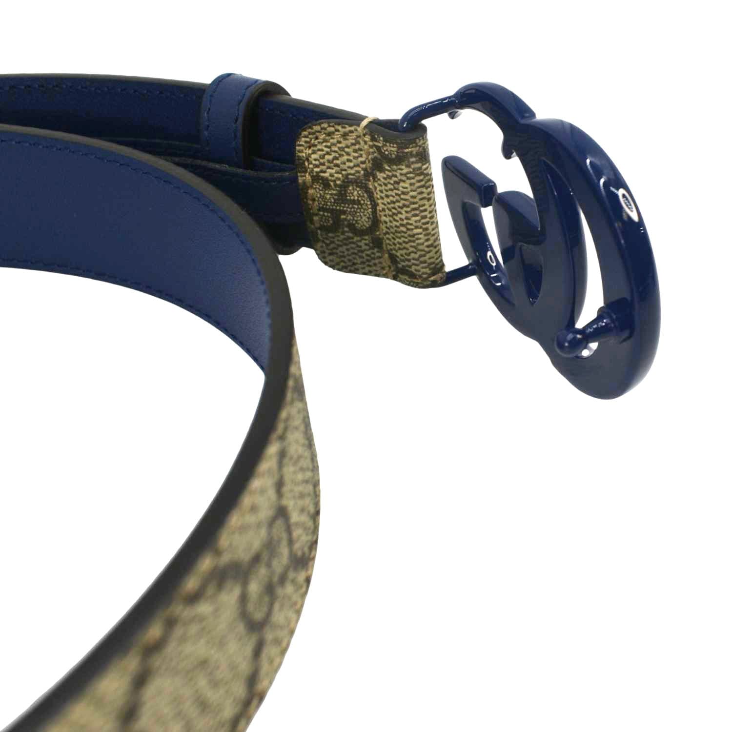 The Gucci GG Buckle Belt in blue Supreme canvas and leather features the iconic GG monogram pattern with a polished double G buckle. A stylish accessory, it adds a bold touch to any outfit.