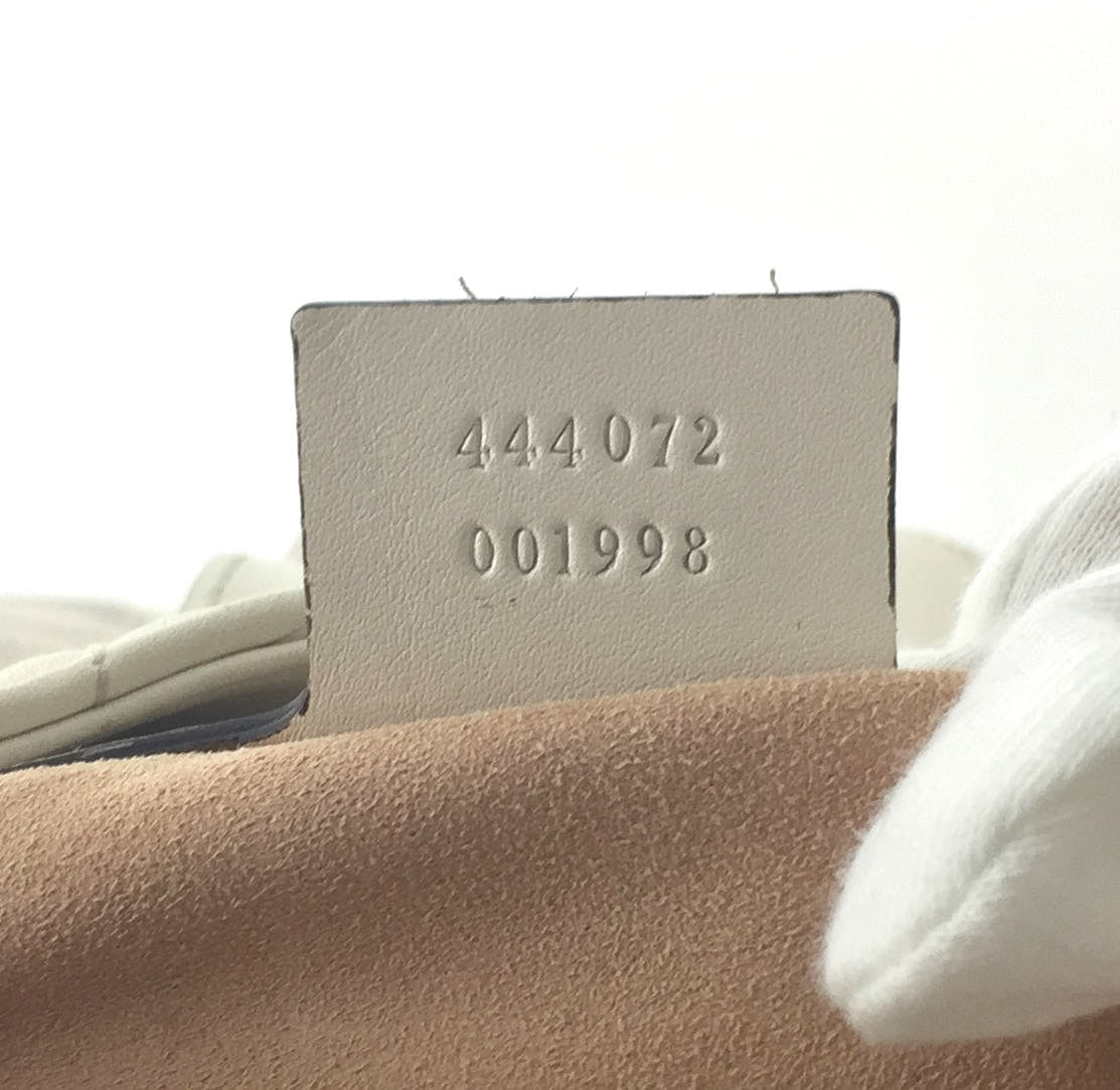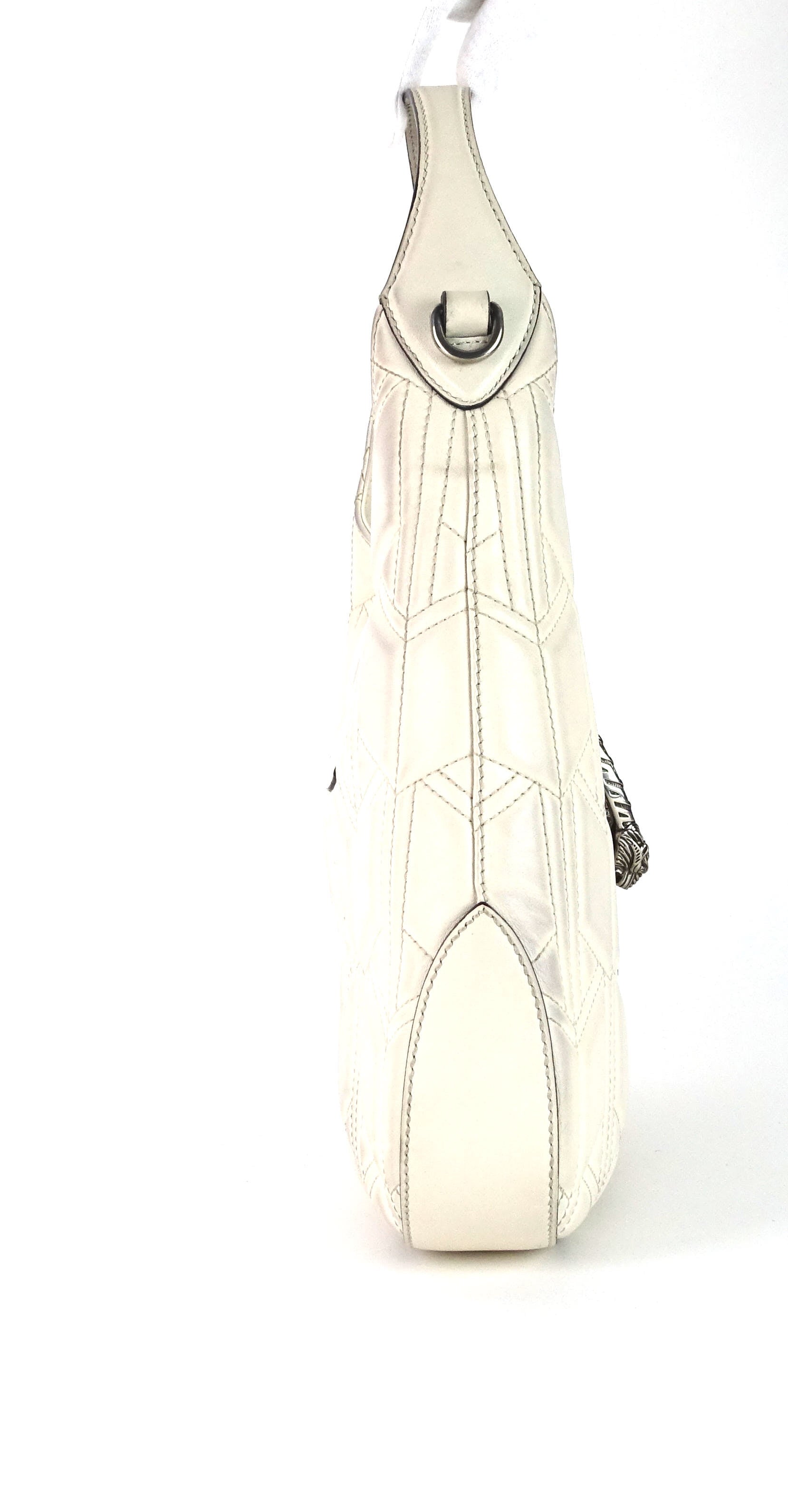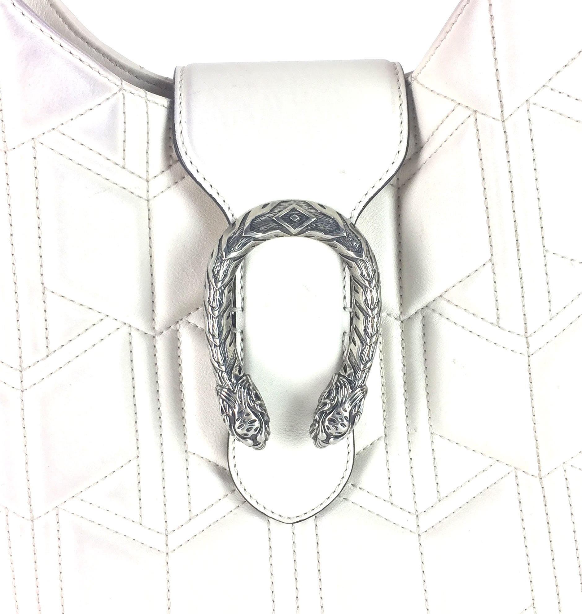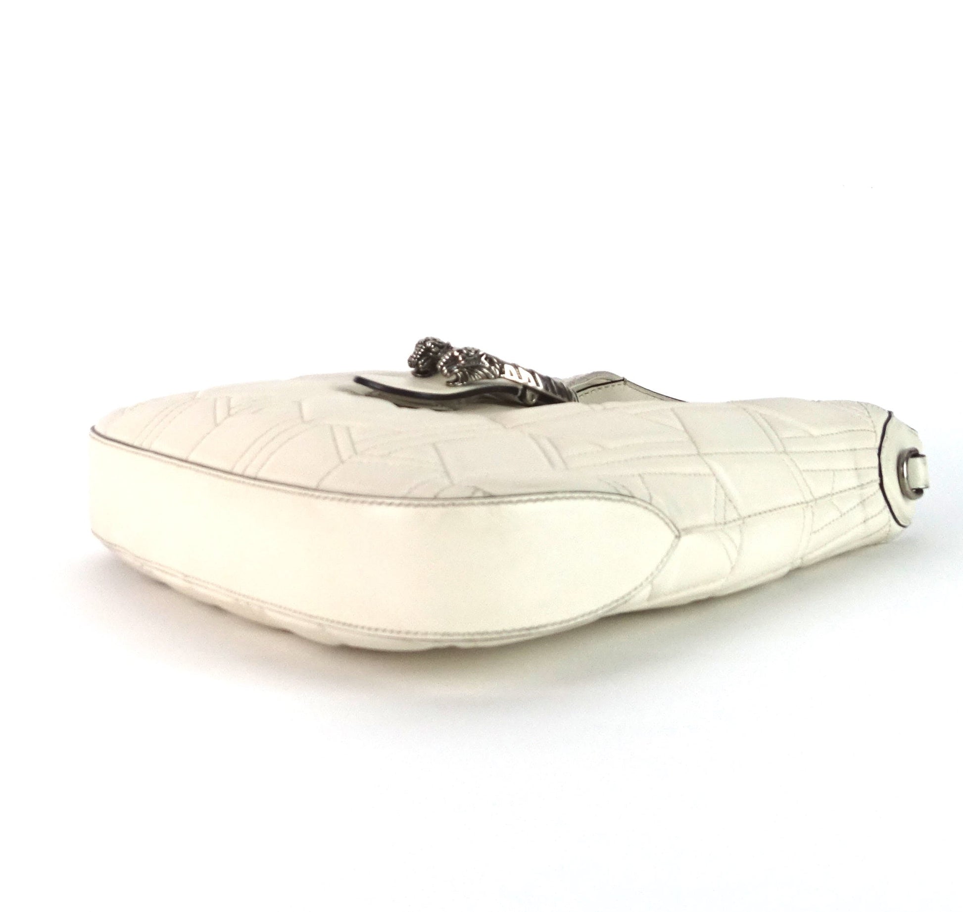 This authentic Gucci Dionysus bag is crafted of white leather. It has a cube stitch, a magnetic front flap with a twin tiger head ornament, an optional cotton strap in red and dark blue, a thin top handle, silver-tone metallic hardware, and three interior pockets (one zip, two slip). It opens to a tan microfiber interior. This sophisticated Gucci bag would add a bit of timeless luxury to any wardrobe.