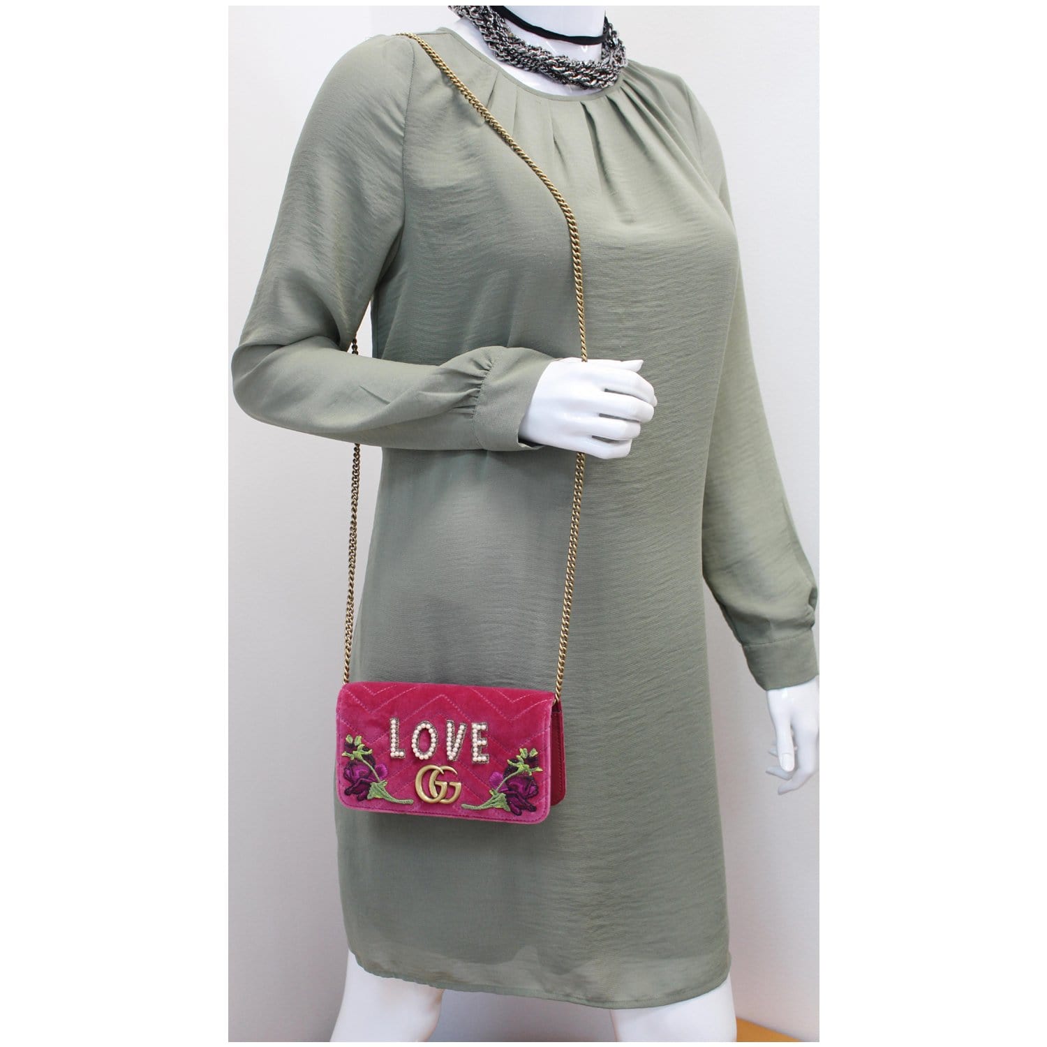 GUCCI Marmont Velvet Love Mini Pearl Embroidered Shoulder Bag Pink