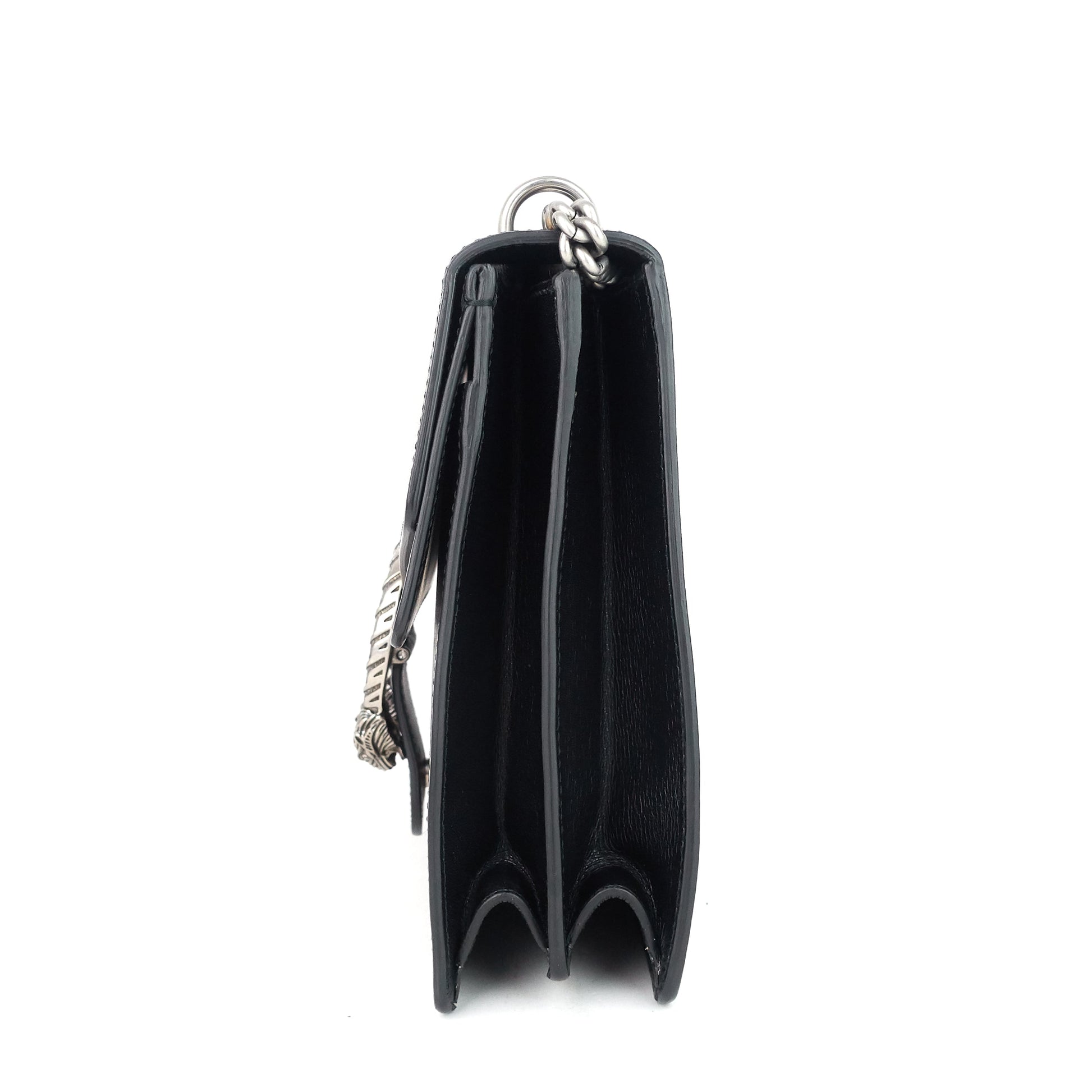 Gold, '80s-inspired print details the black leather of a glamourous, limited edition shoulder bag fitted with a two-headed tiger spur—a reference to the ancient Greek god Dionysus. A divided interior ensures easy organization, while an aged chain strap offers two unique drop lengths.