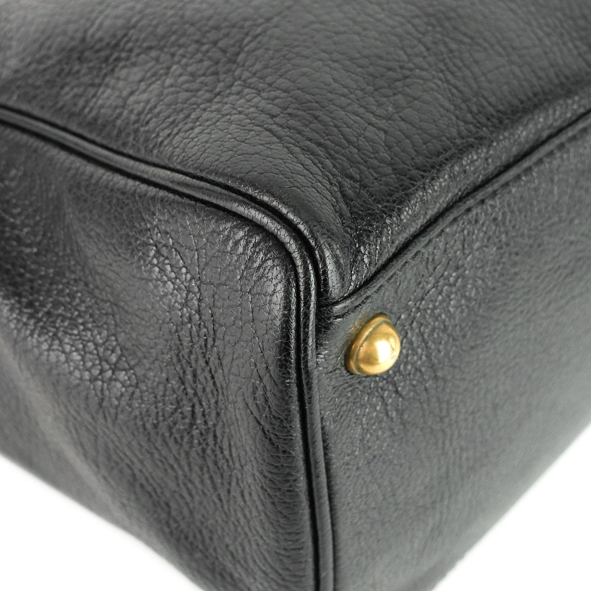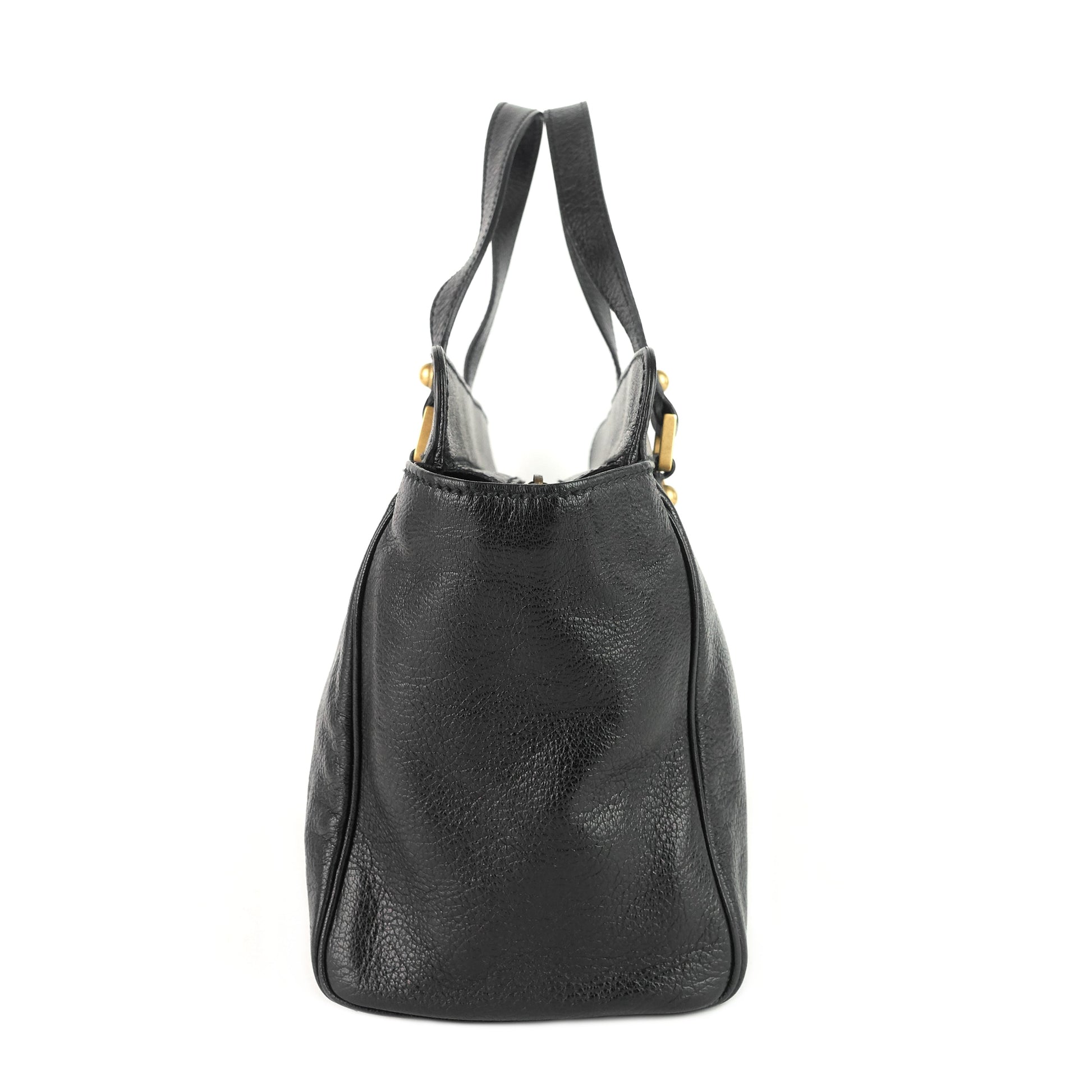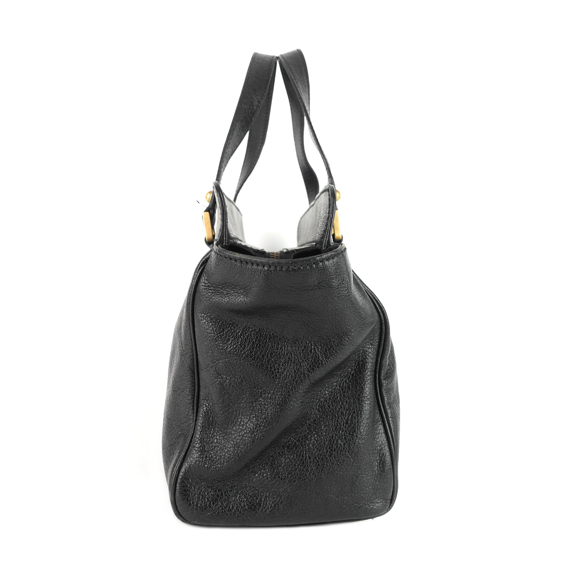 Overall: The exterior is in excellent condition with minor scratches to the body of the bag, heavier scratching to the leather near the top zipper, and wear to the edges of the leather handles. The interior is clean with small stains to the bottom of the primary compartment. The zip pull shows discolouring consistent with use and the tips of the protective feet show scratching.