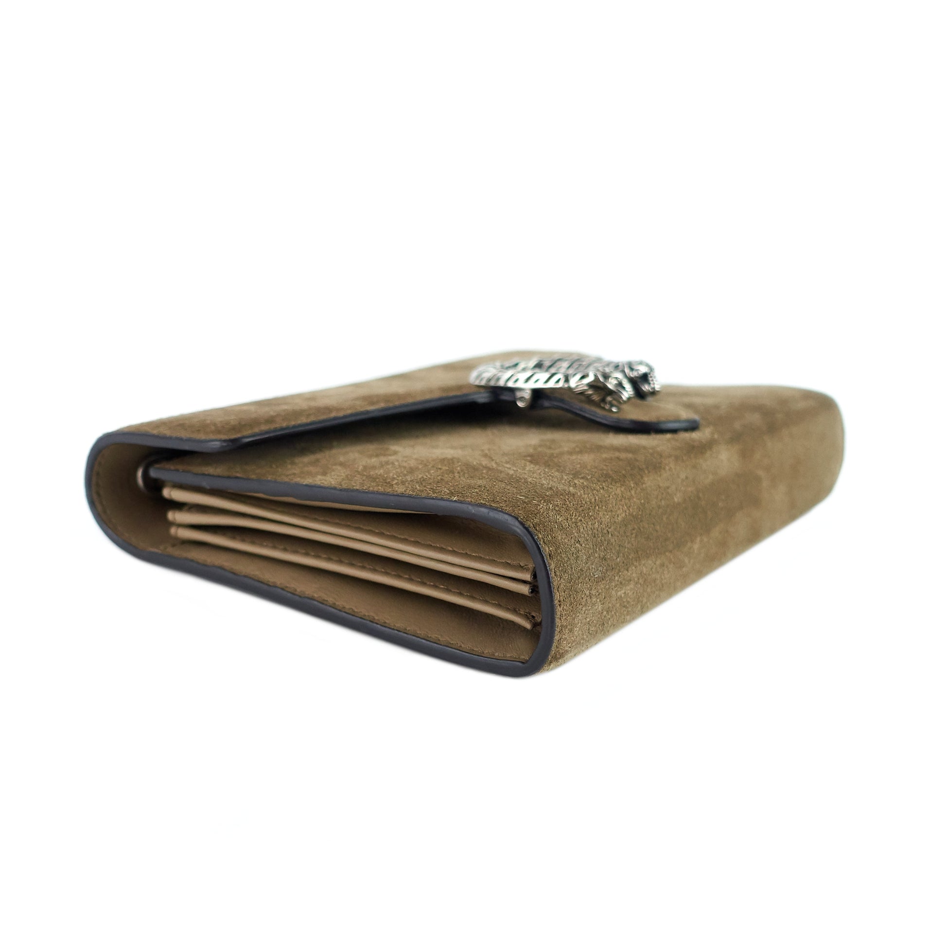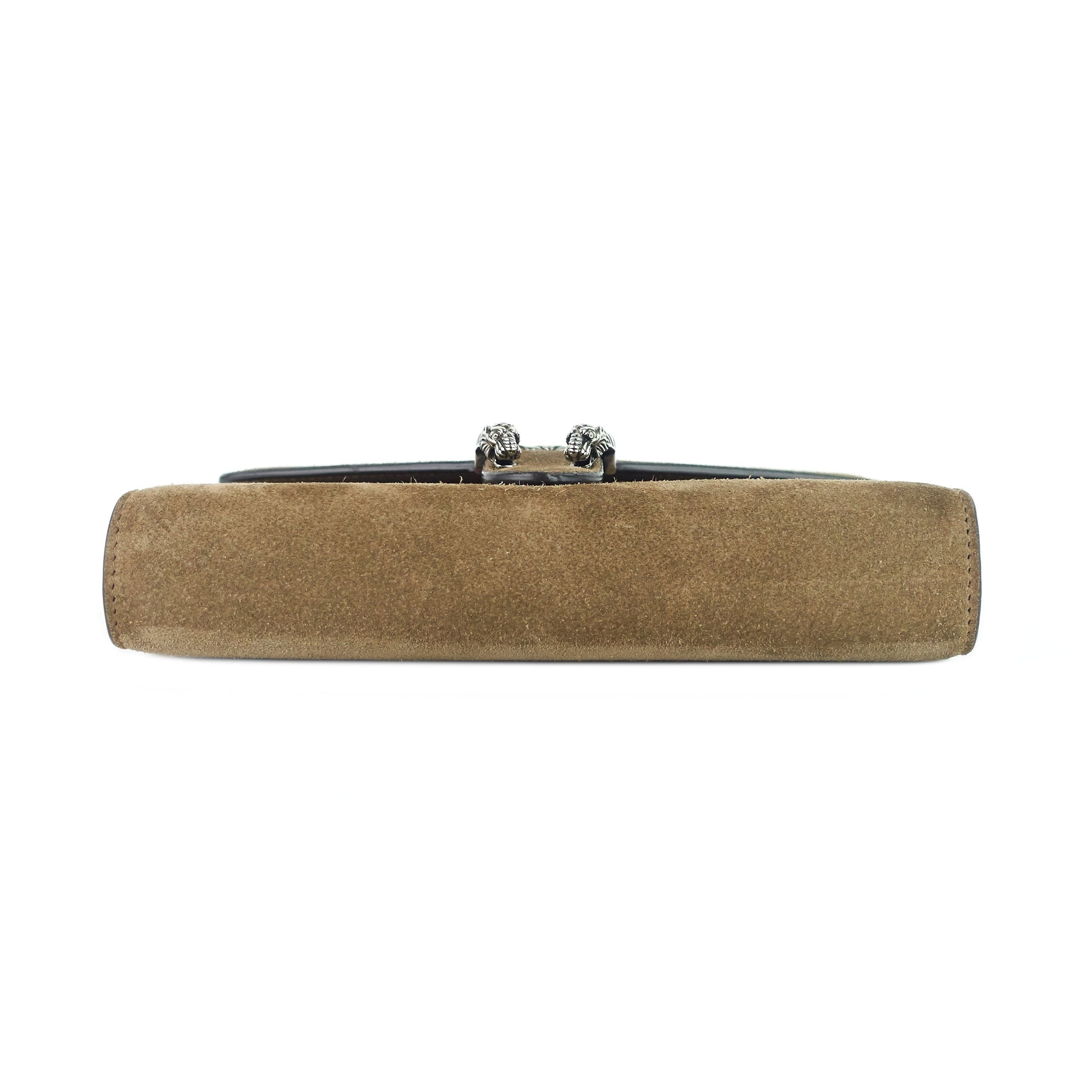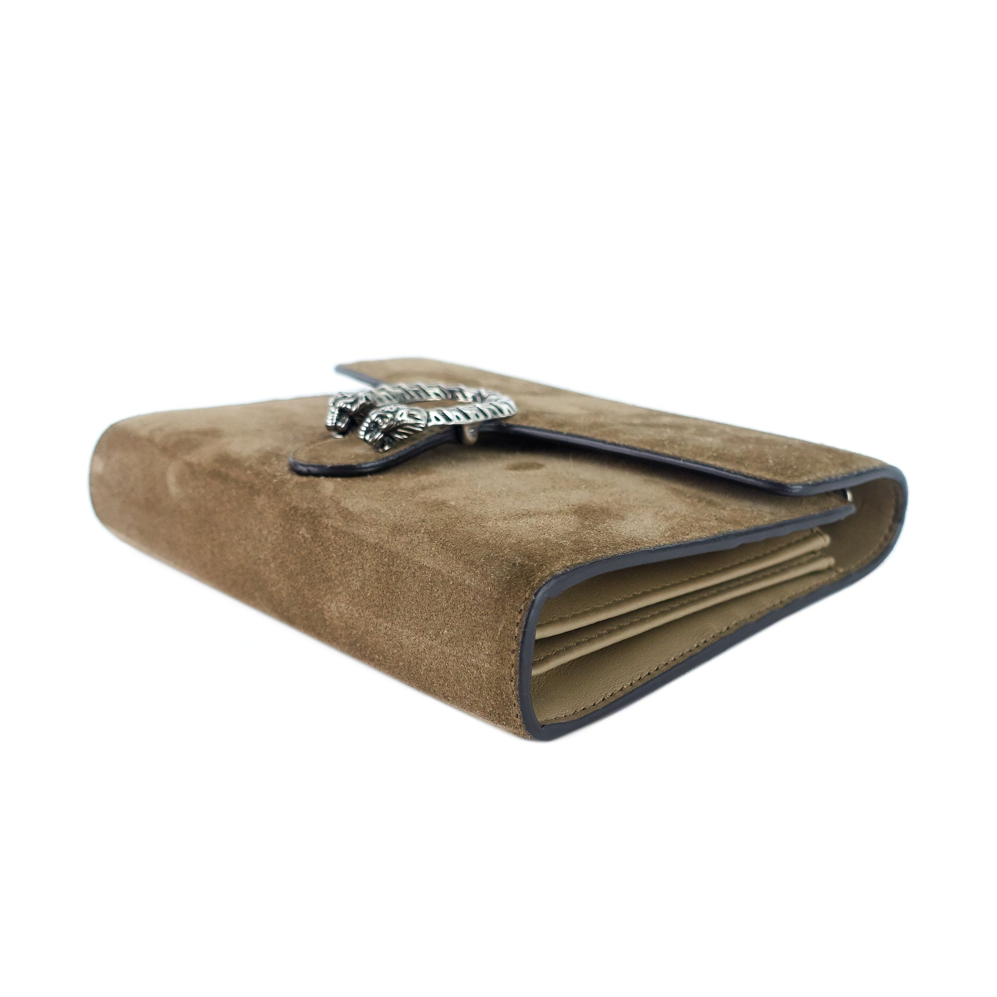 Inspired by the ancient Greek god Dionysus, a two-headed tiger spur stands out on the front of a suede bag that can be slung over the shoulder or carried as a chic clutch. The interior is well-organized, with a pocket for virtually every essential.